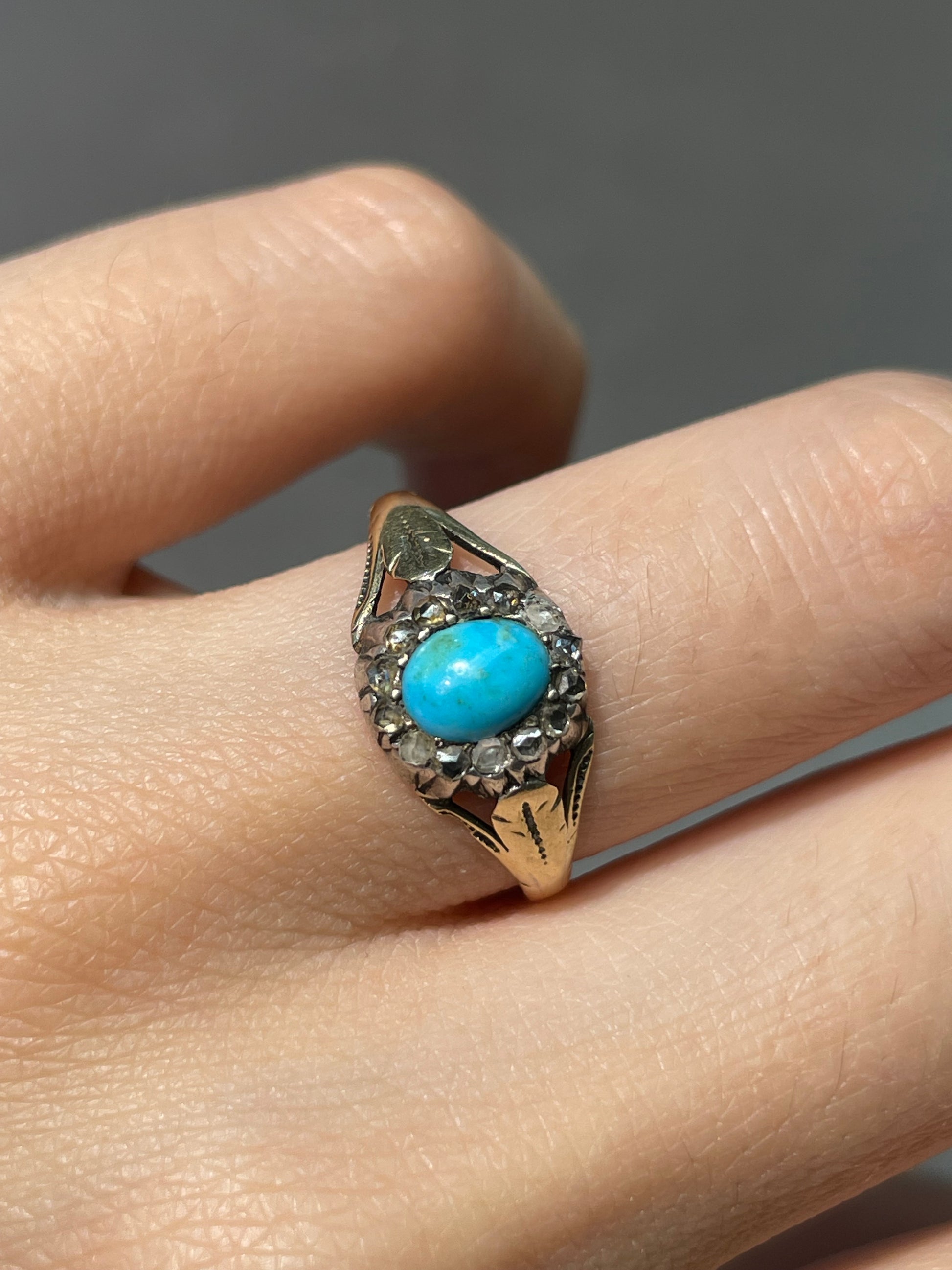 A charming Victorian 18K gold ring featuring a glowing cabochon turquoise in that perfect robin’s egg blue, surrounded by a halo of sparkling white rose-cut diamonds. Delicate, elegant, and full of antique magic!