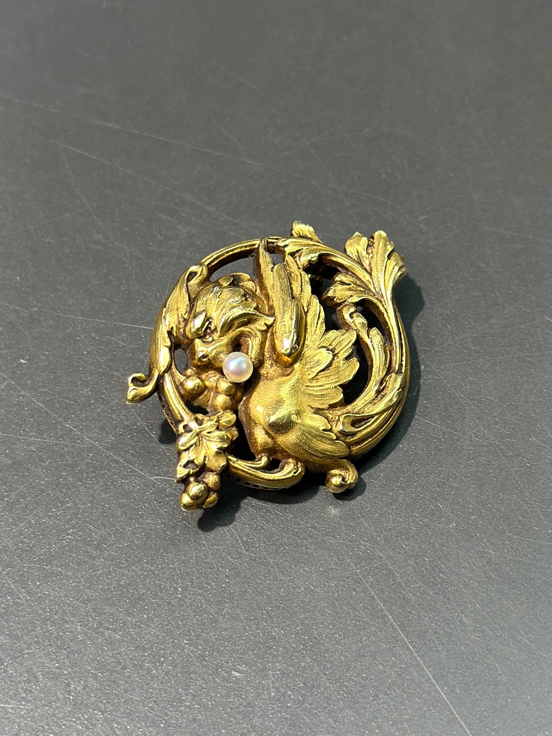 古董 18K 金法国狮鹫和天然珍珠胸针