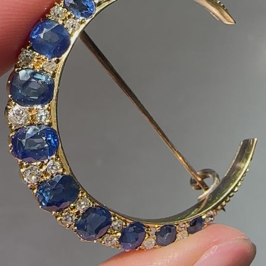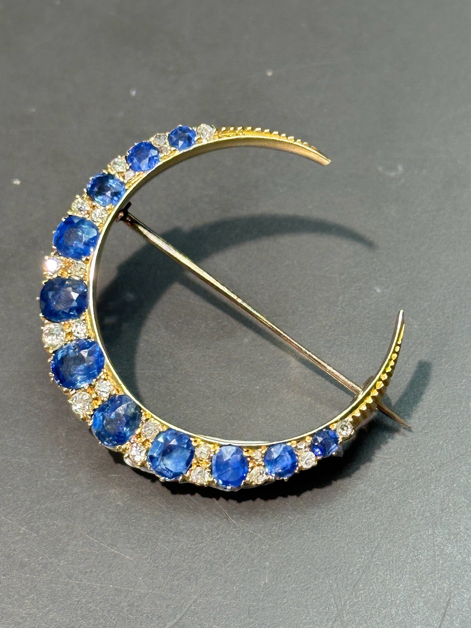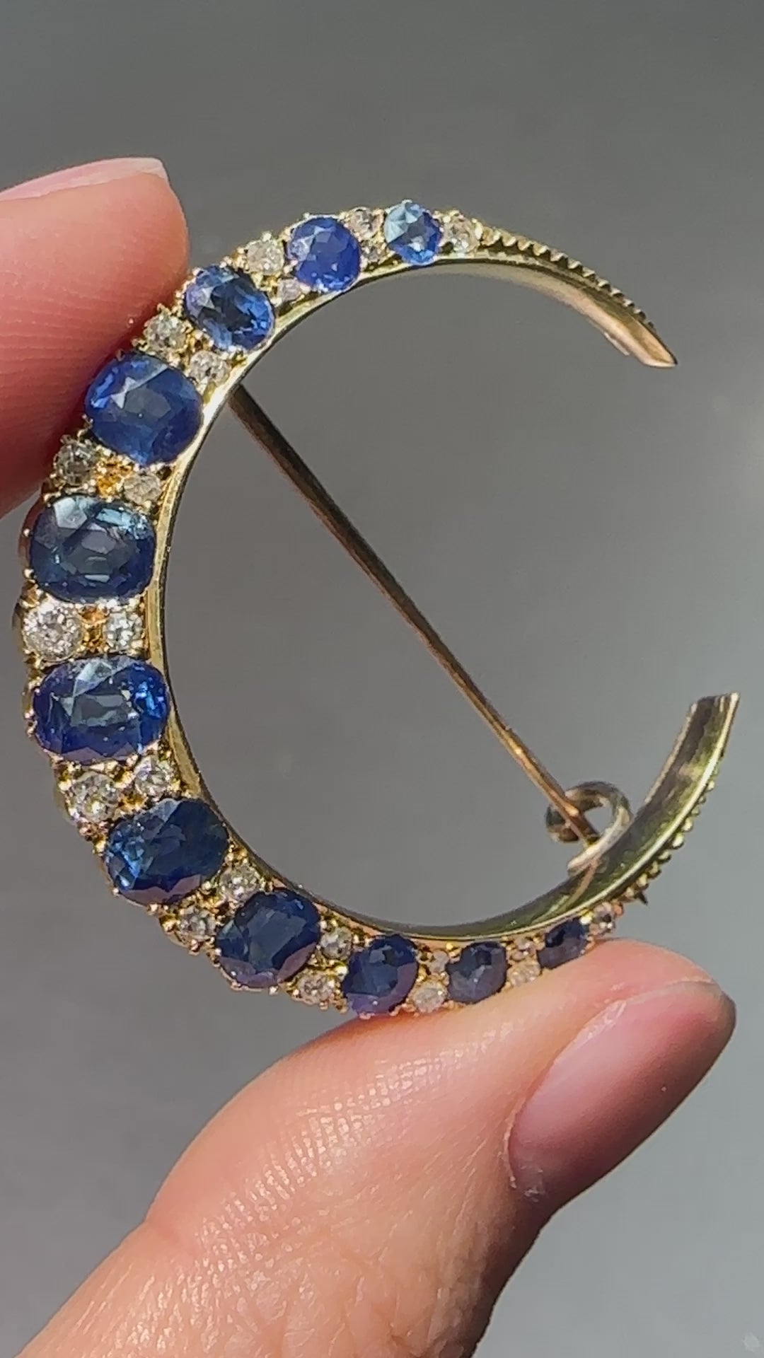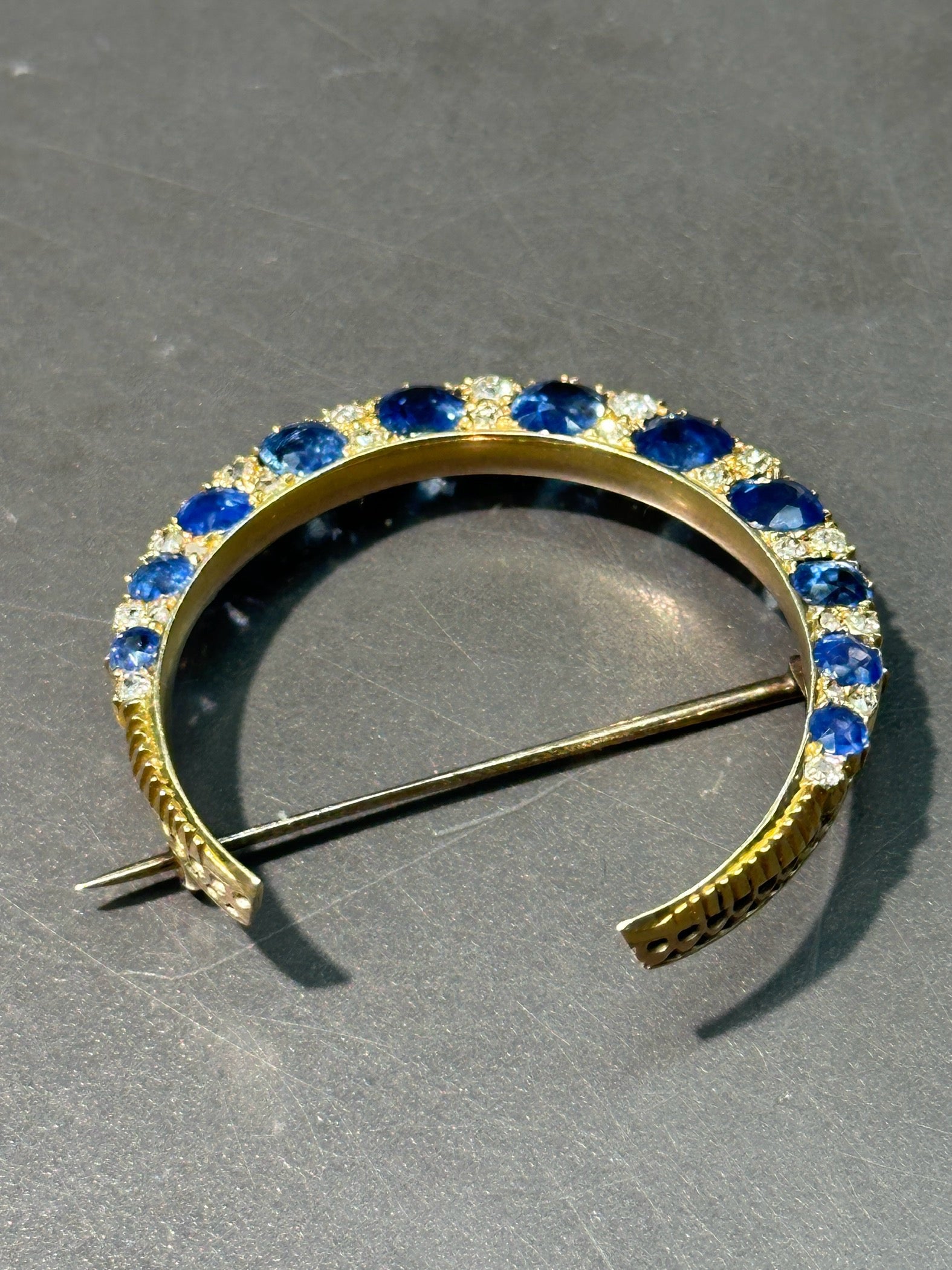 古董 14K 金天然未加热蓝宝石钻石新月胸针