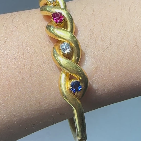 这款维多利亚时代的手镯采用闪亮的 18K 黄金精心打造而成,可追溯到 19 世纪 90 年代,并以螺旋状装饰,镶嵌着闪闪发光的天然垫形蓝宝石、老矿切割钻石和垫形红宝石。