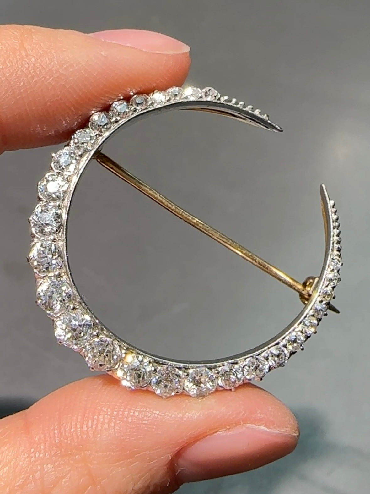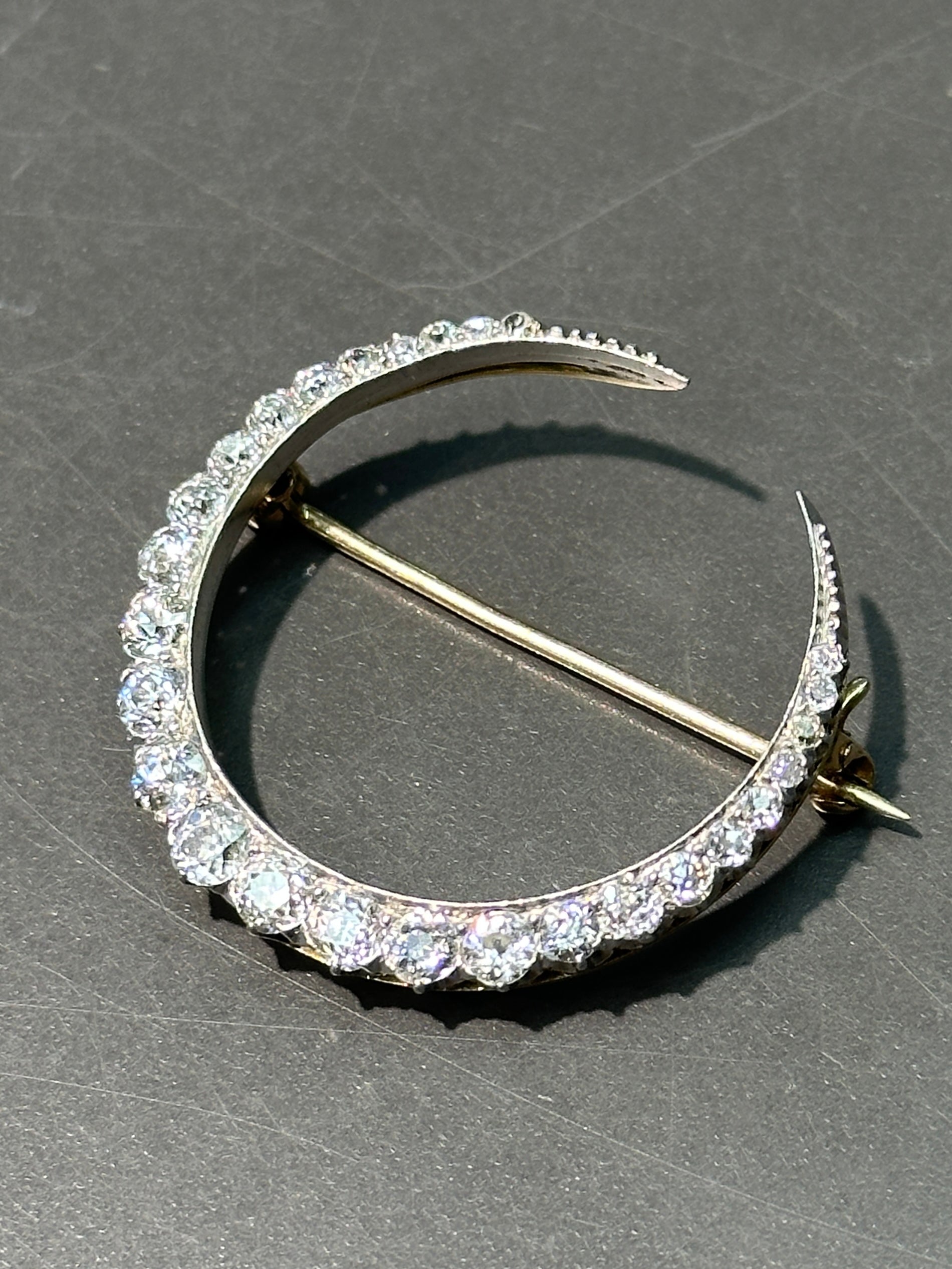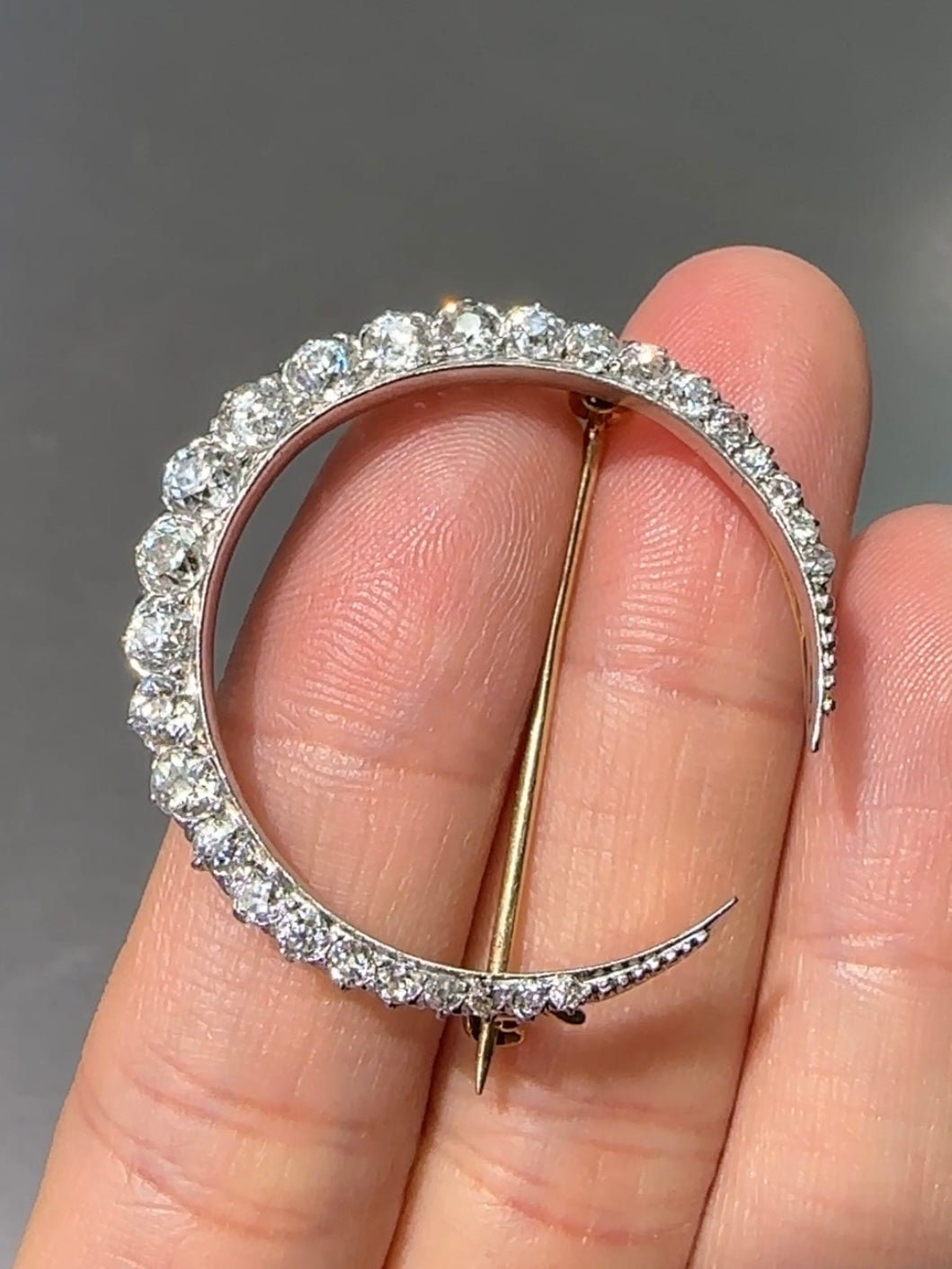 古董 18K 黄金铂金 2.80 CTW 钻石新月胸针
