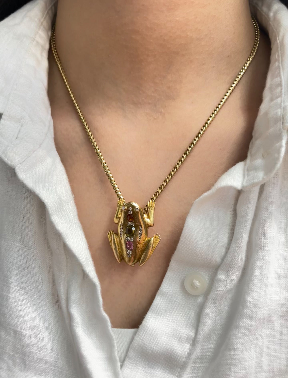 A charming and whimsical antique frog pendant crafted in vibrant 18K gold, set with vibrant sparkling tourmalines and glimmering white rose-cut diamonds. This delightful piece doubles as both a pendant and a charm—perfect for adding a touch of character and sparkle to your collection.