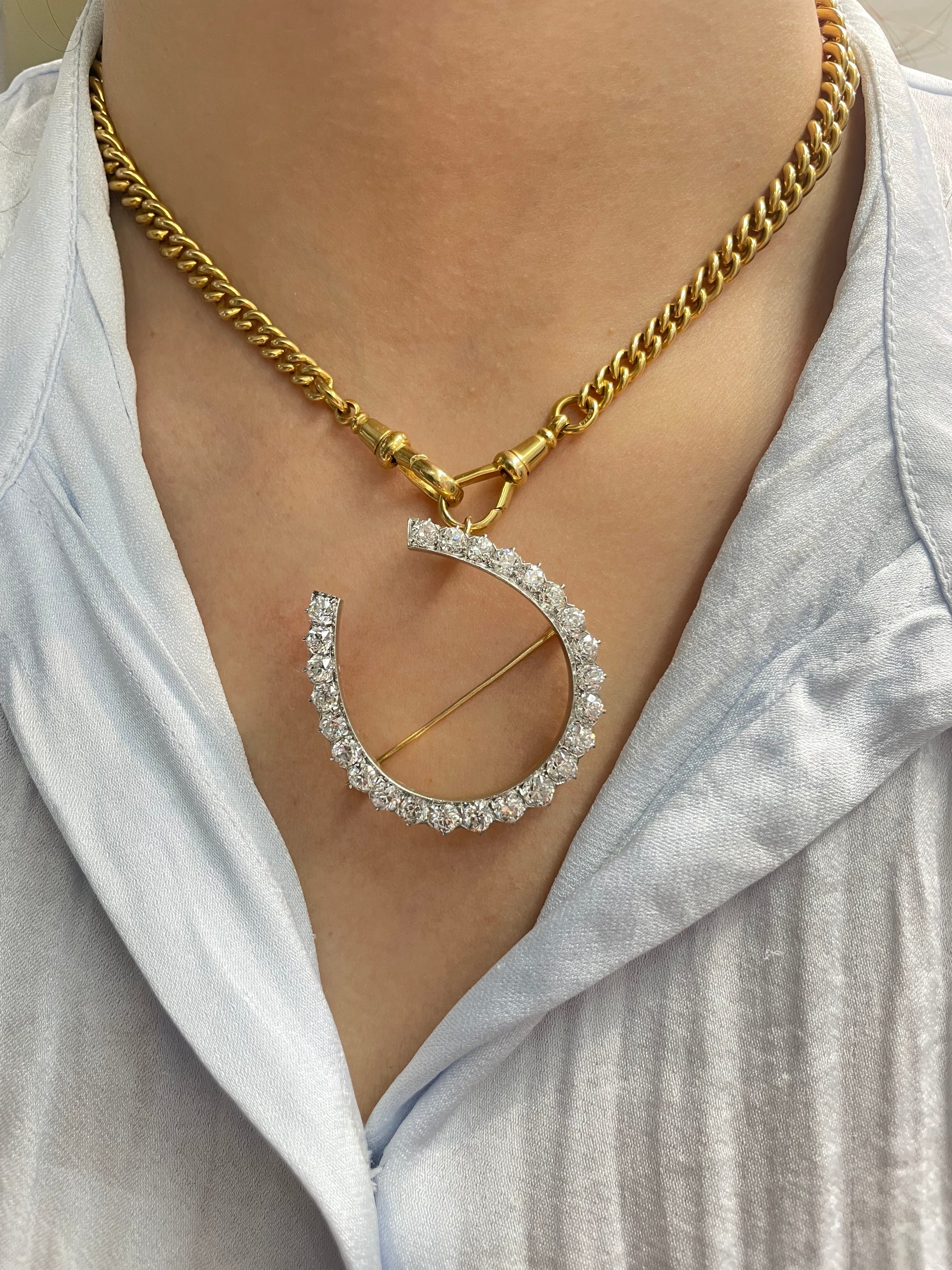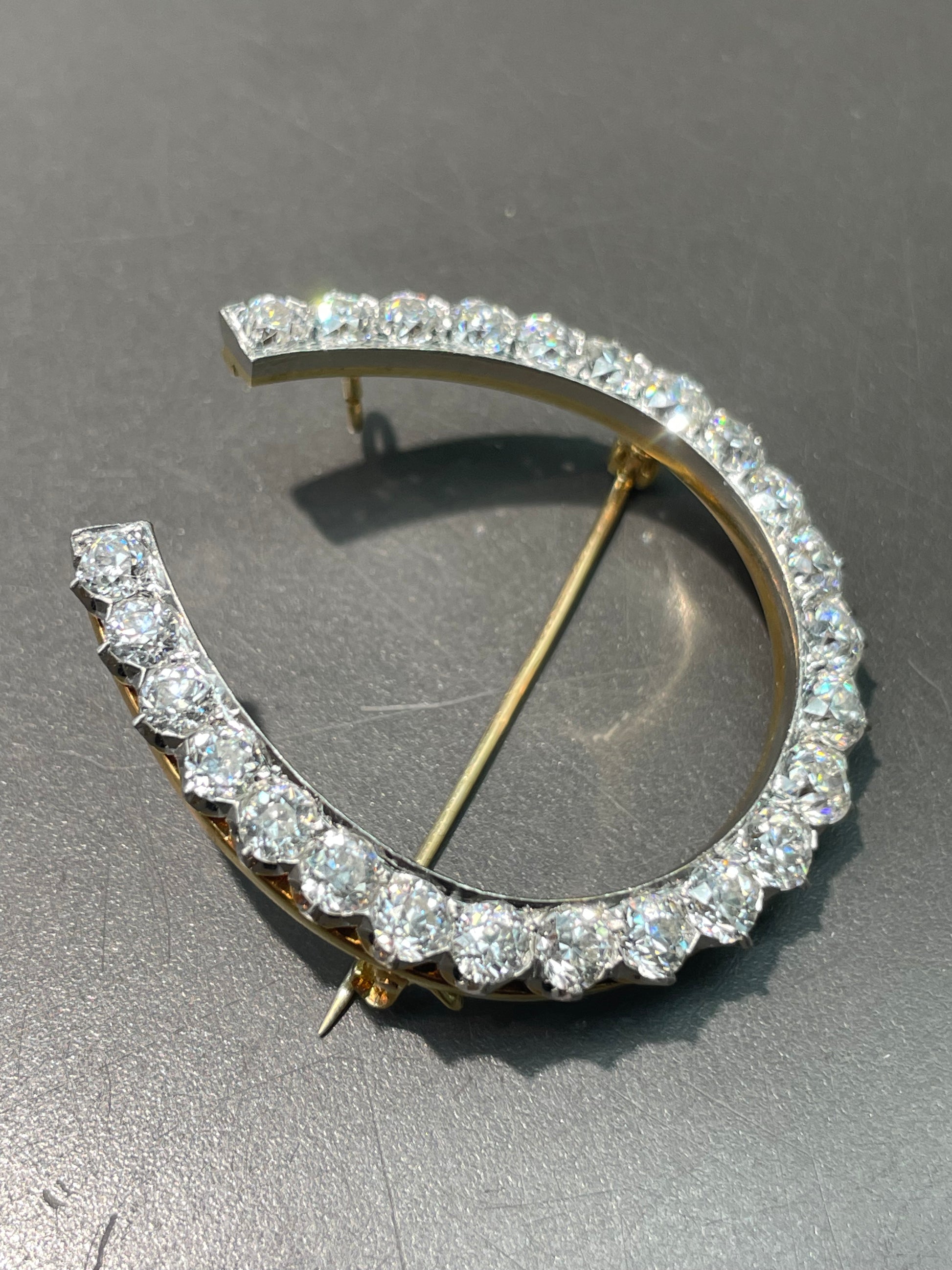 An antique platinum and gold diamond lucky horseshoe brooch grdaully lined with 24 sparkling white European cut diamonds totaling high in VS clarity and G-H color. The piece is fitted with a bail at the back, allowing it to be worn not only as a brooch but also as a pendant.