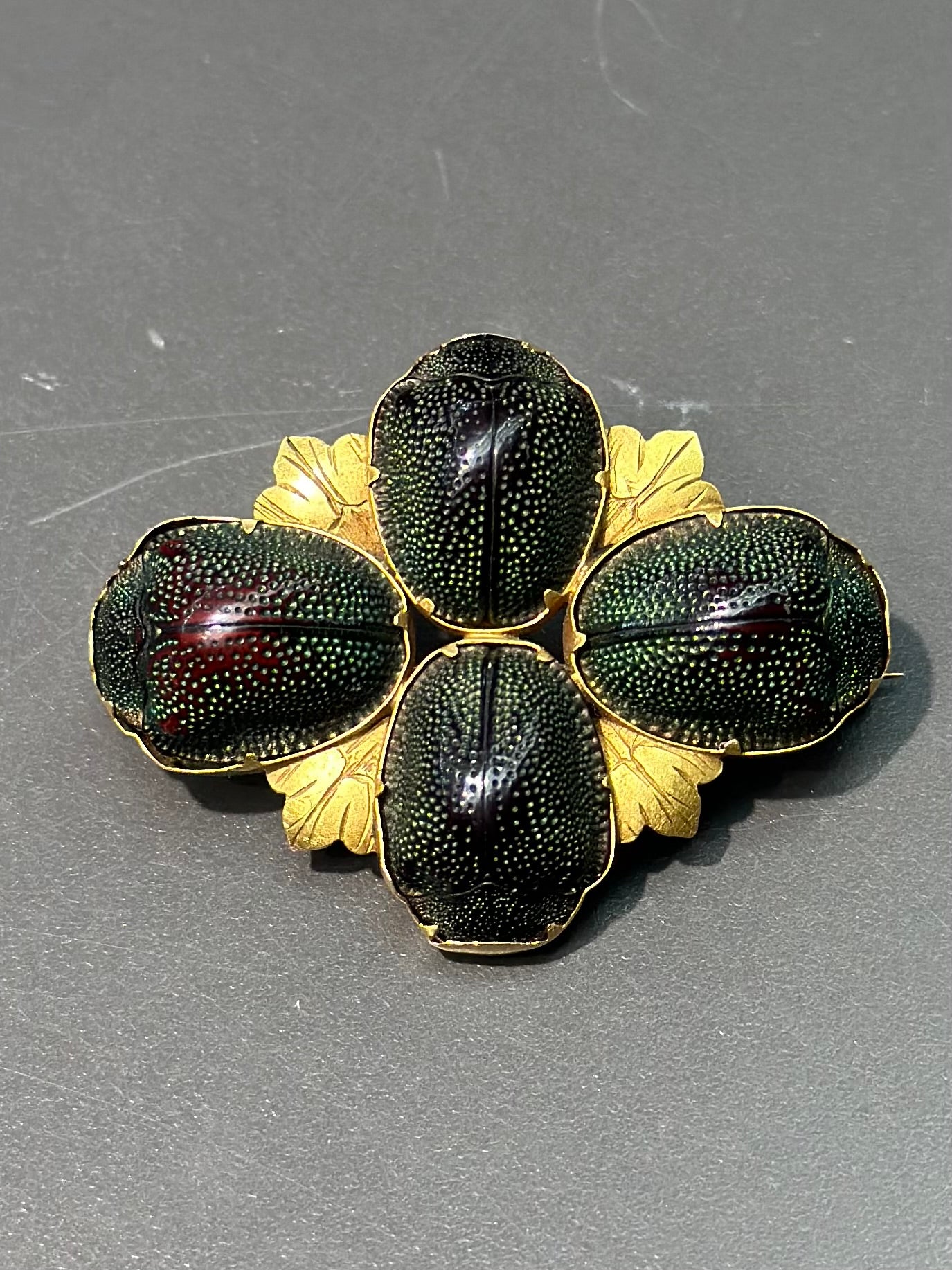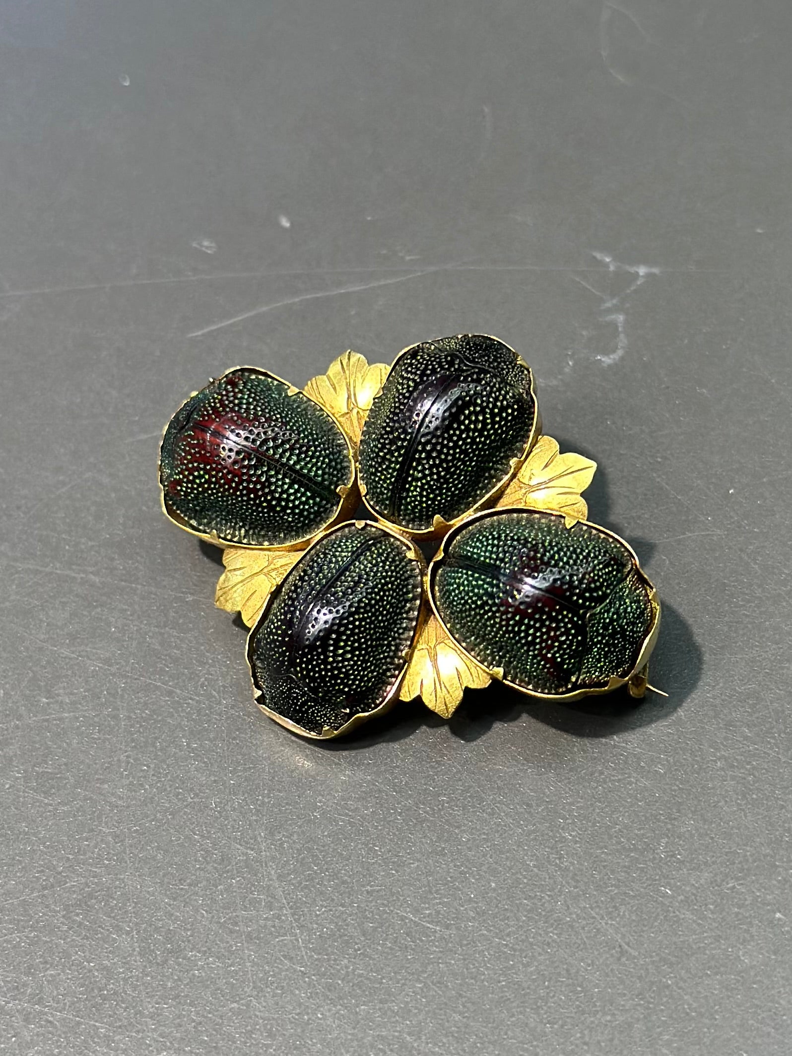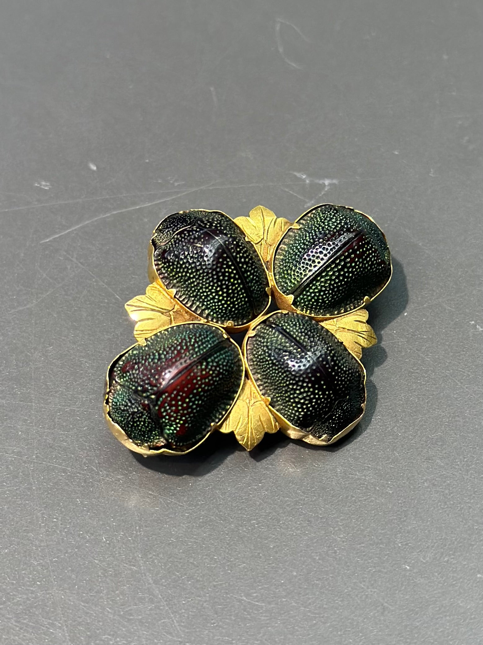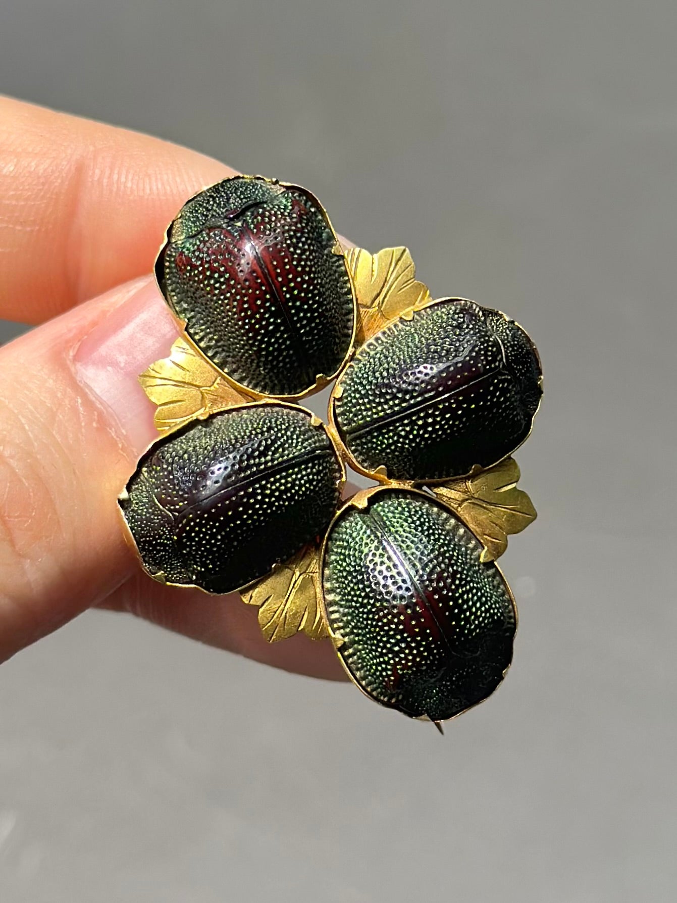 这款圣甲虫胸针是重生、复活、转变和成长的象征,可追溯到埃及复兴时期,以 4 只深彩虹色绿色甲虫为特色,镶嵌在 22K 金上,饰有闪闪发光的纹理叶子。
