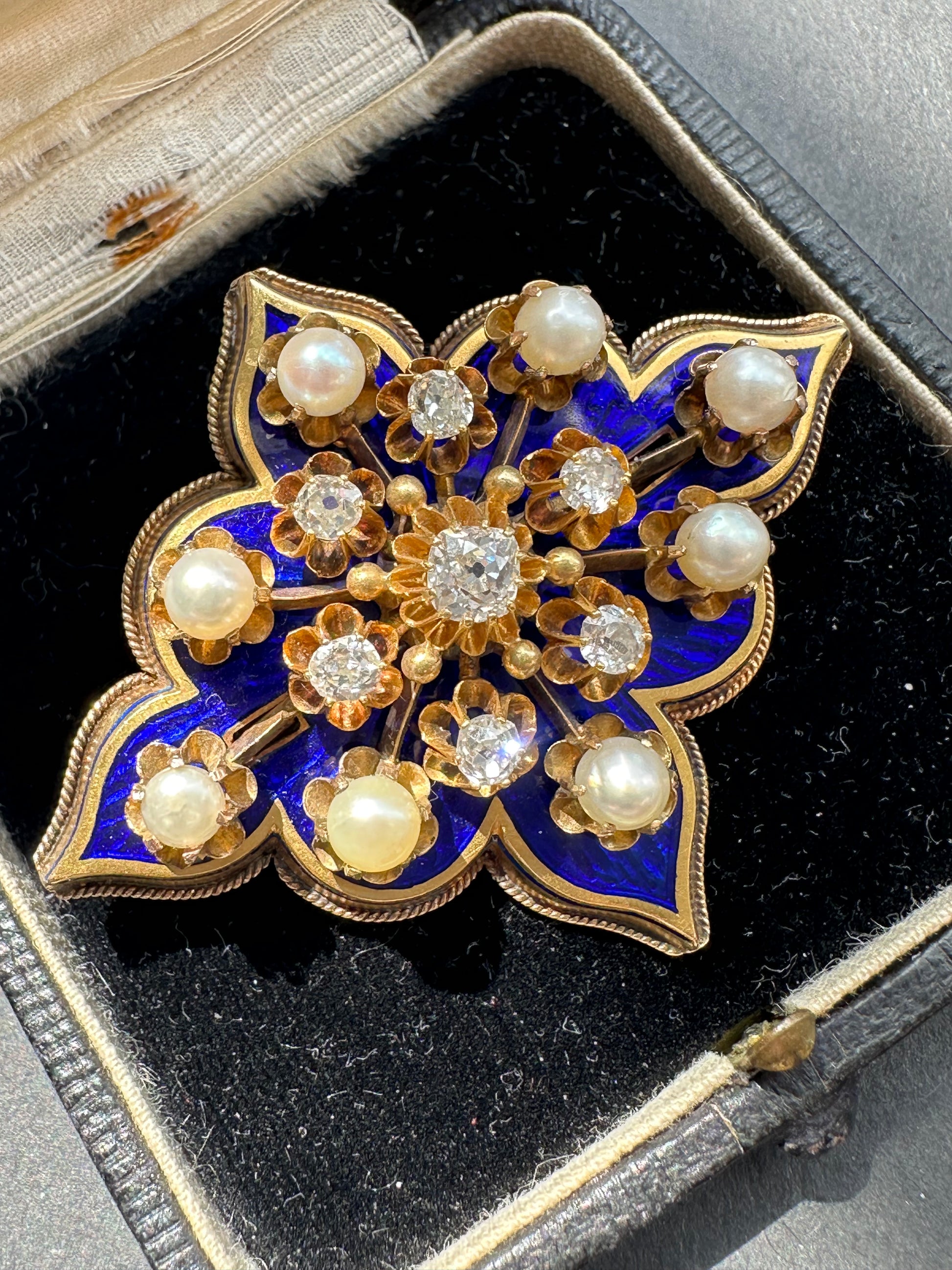 古董 14K 金珐琅天然珍珠钻石小盒胸针
