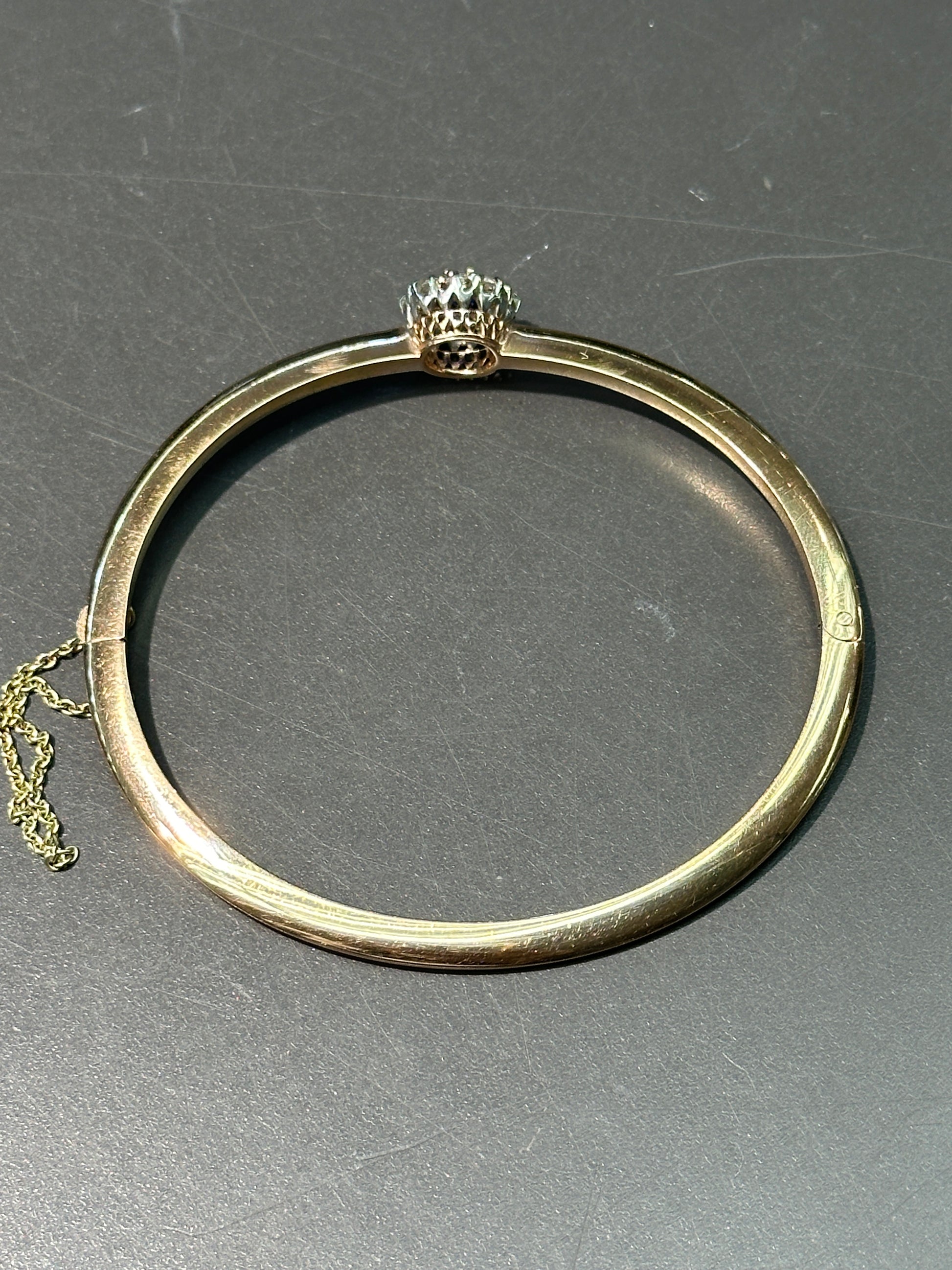 一款华丽的法国制造古董手镯,中央镶嵌着一颗鲜艳的宝蓝色蓝宝石,周围环绕着一圈闪闪发光的白玫瑰切割钻石。