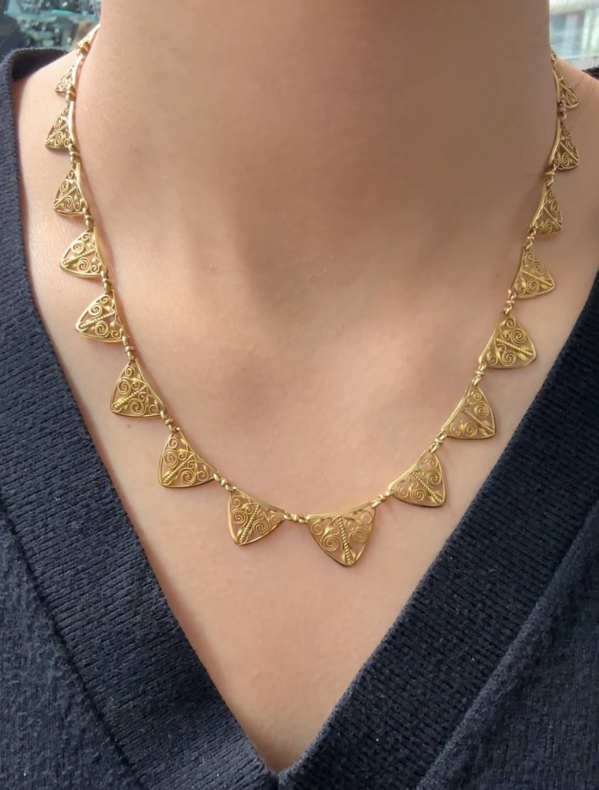 这款精致的古董法国 18K 黄金花丝流苏项链展示了精湛的维多利亚工艺,精致的渐变三角形花丝链饰有优雅的卷轴。采用 18K 纯金制成,扣环上带有法国标志,其流苏设计增添了优雅的动感和永恒的精致感。项链在领口处垂坠感极佳。