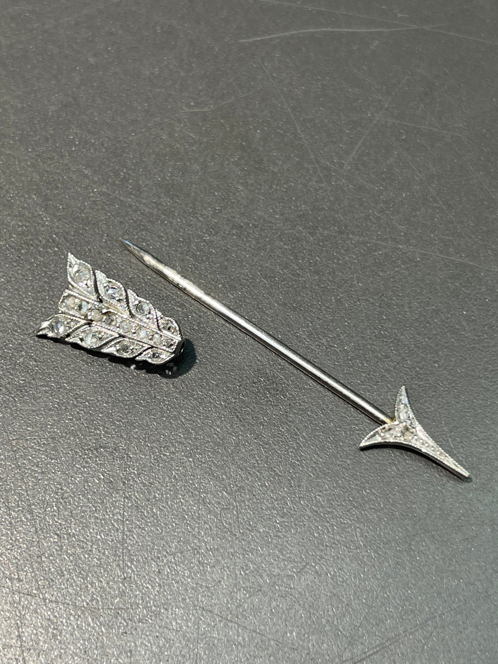 A classy timeless Edwardian era platinum jabot brooch set with glimmering white rose cut diamonds. This gorgeous arrow is perfect as a jabot pin and a pendant (upon request)! Perfect alone of stacked with others!