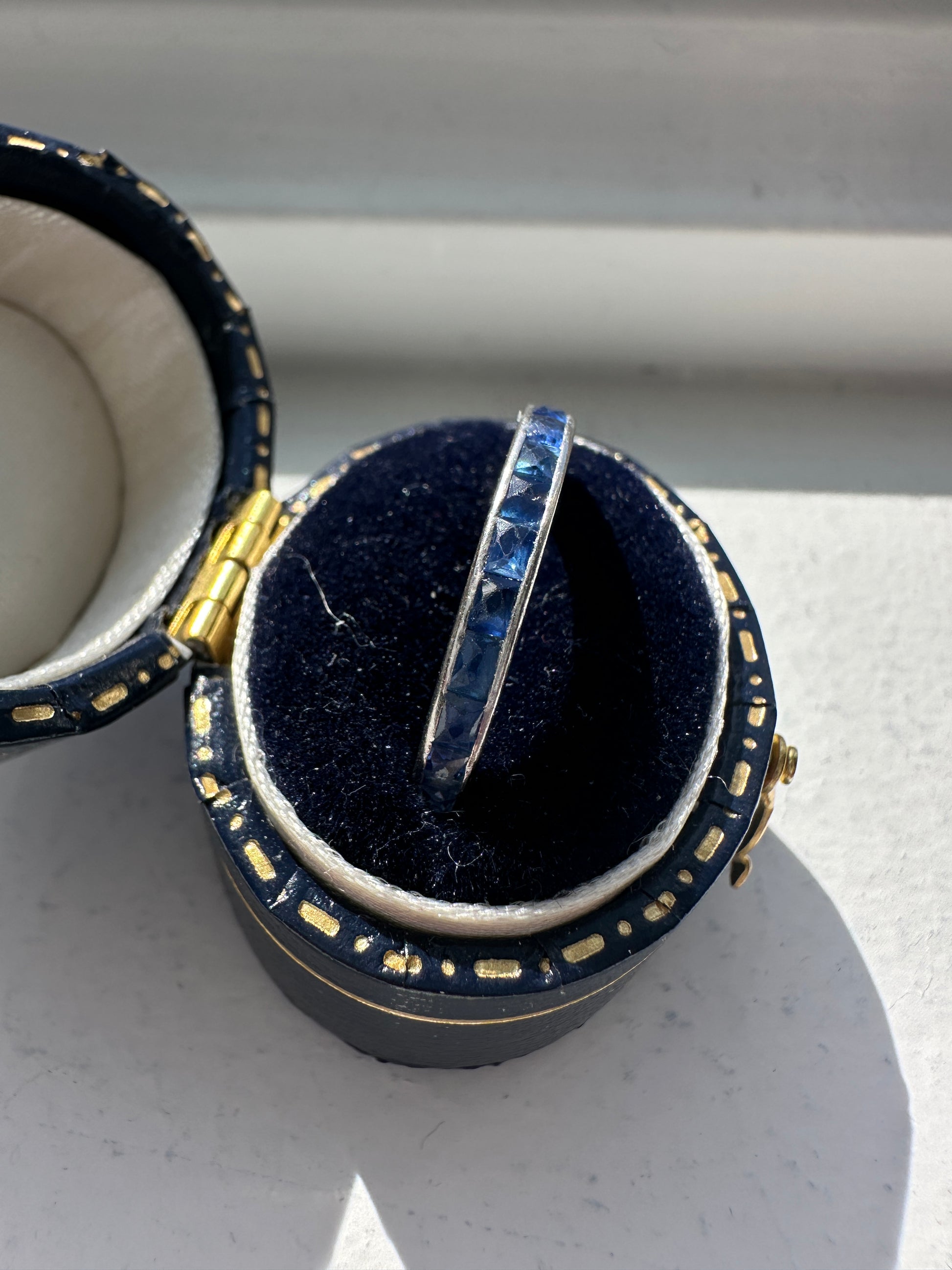 This stunning Art Deco-era infinity band is crafted in platinum. It features channel-set cerulean blue French-cut natural sapphires totaling 1.62 carats.