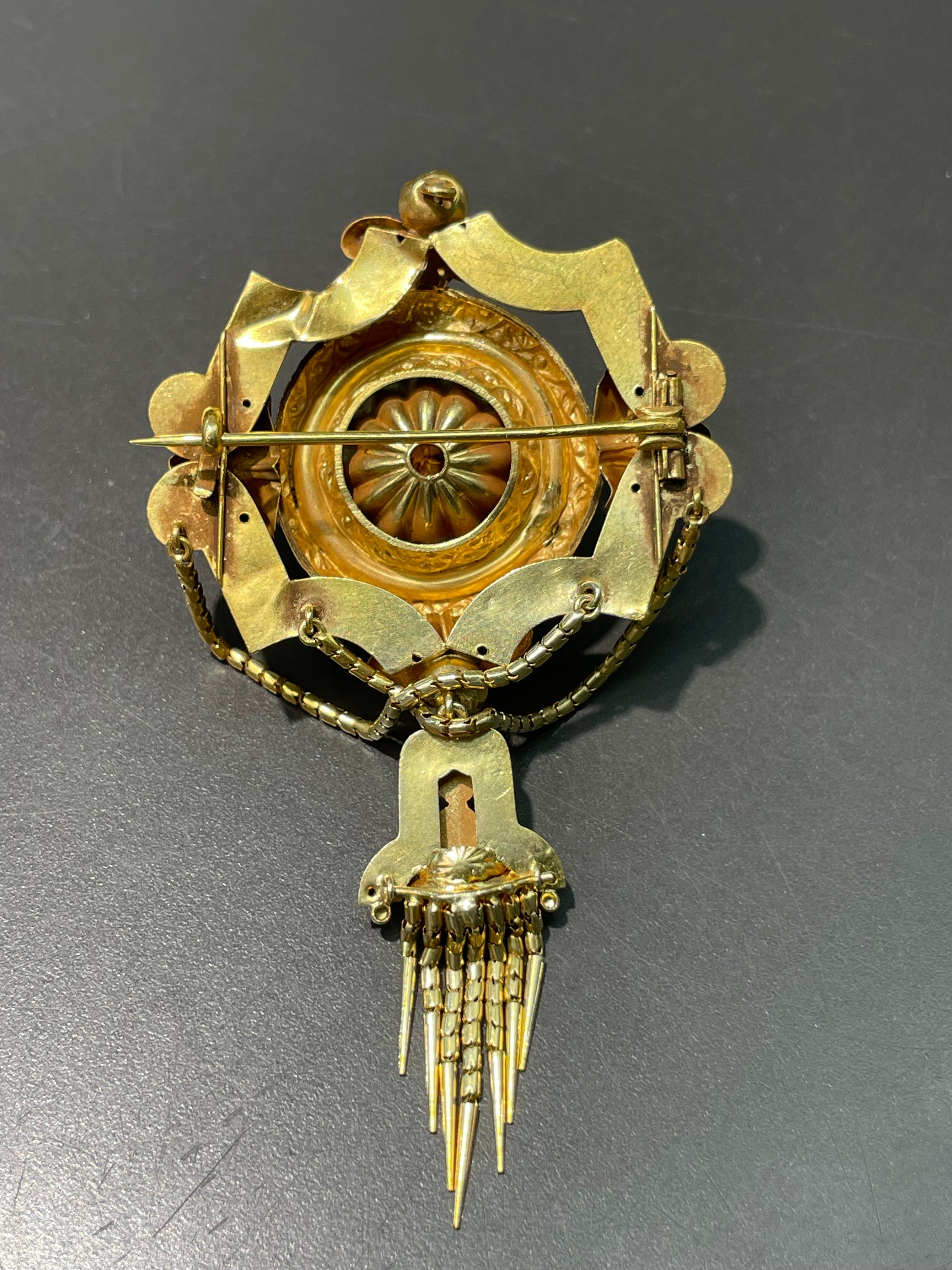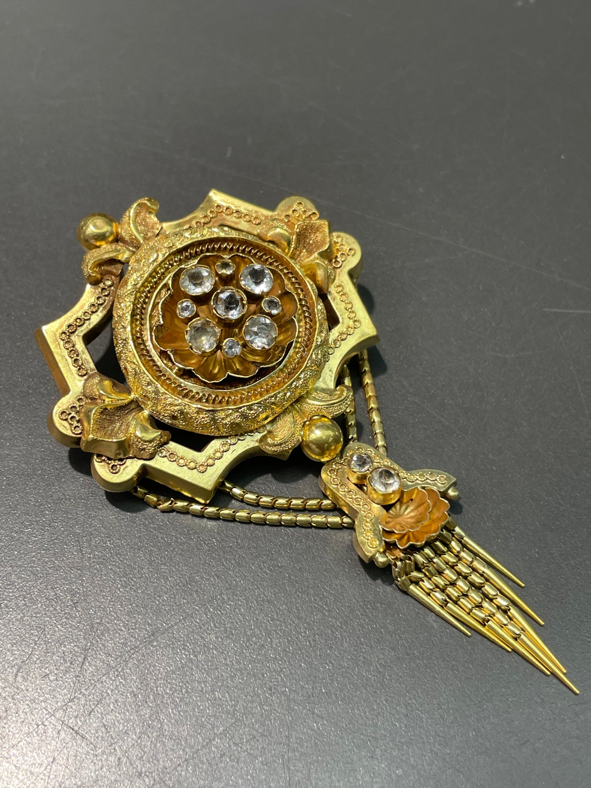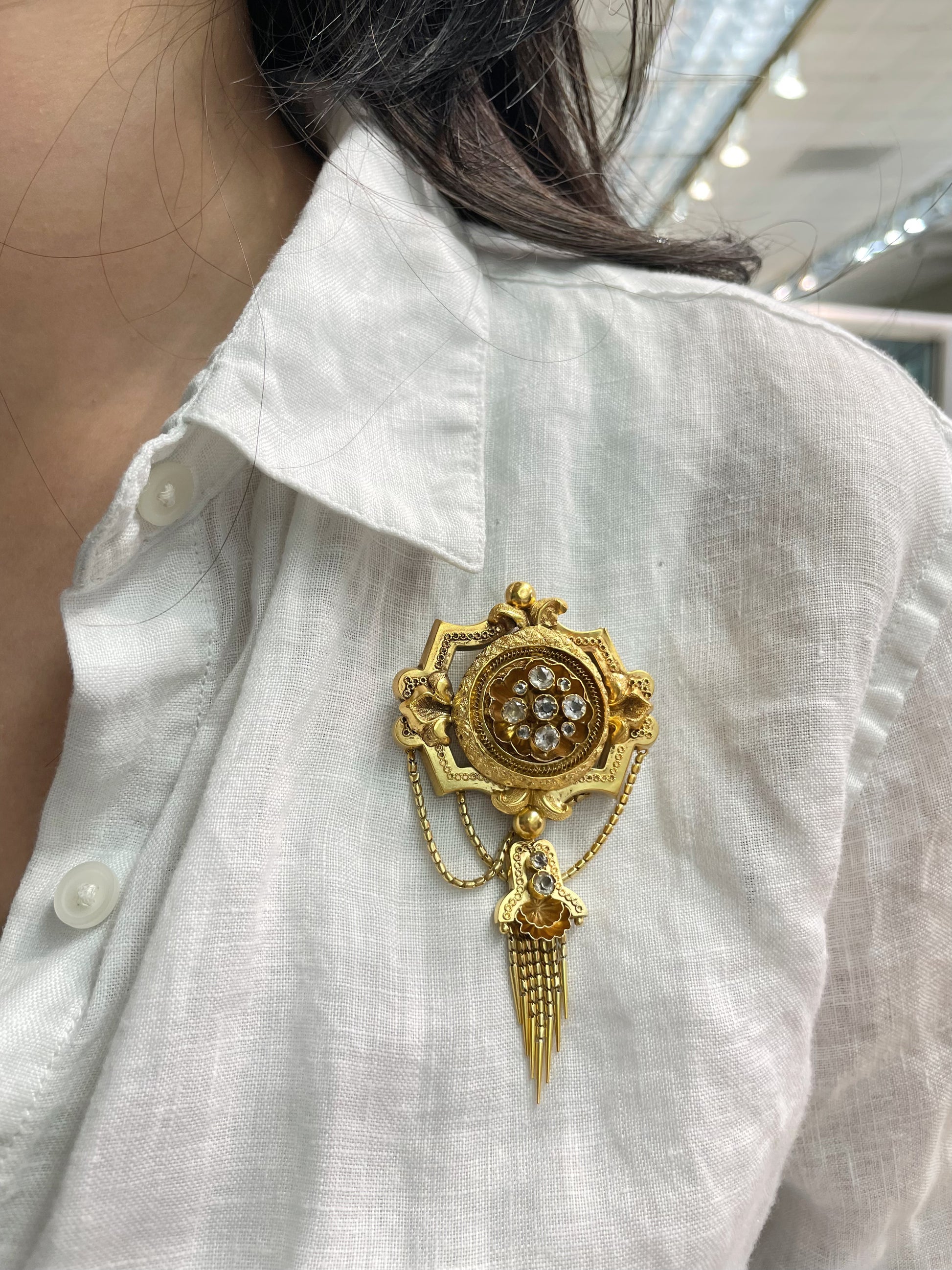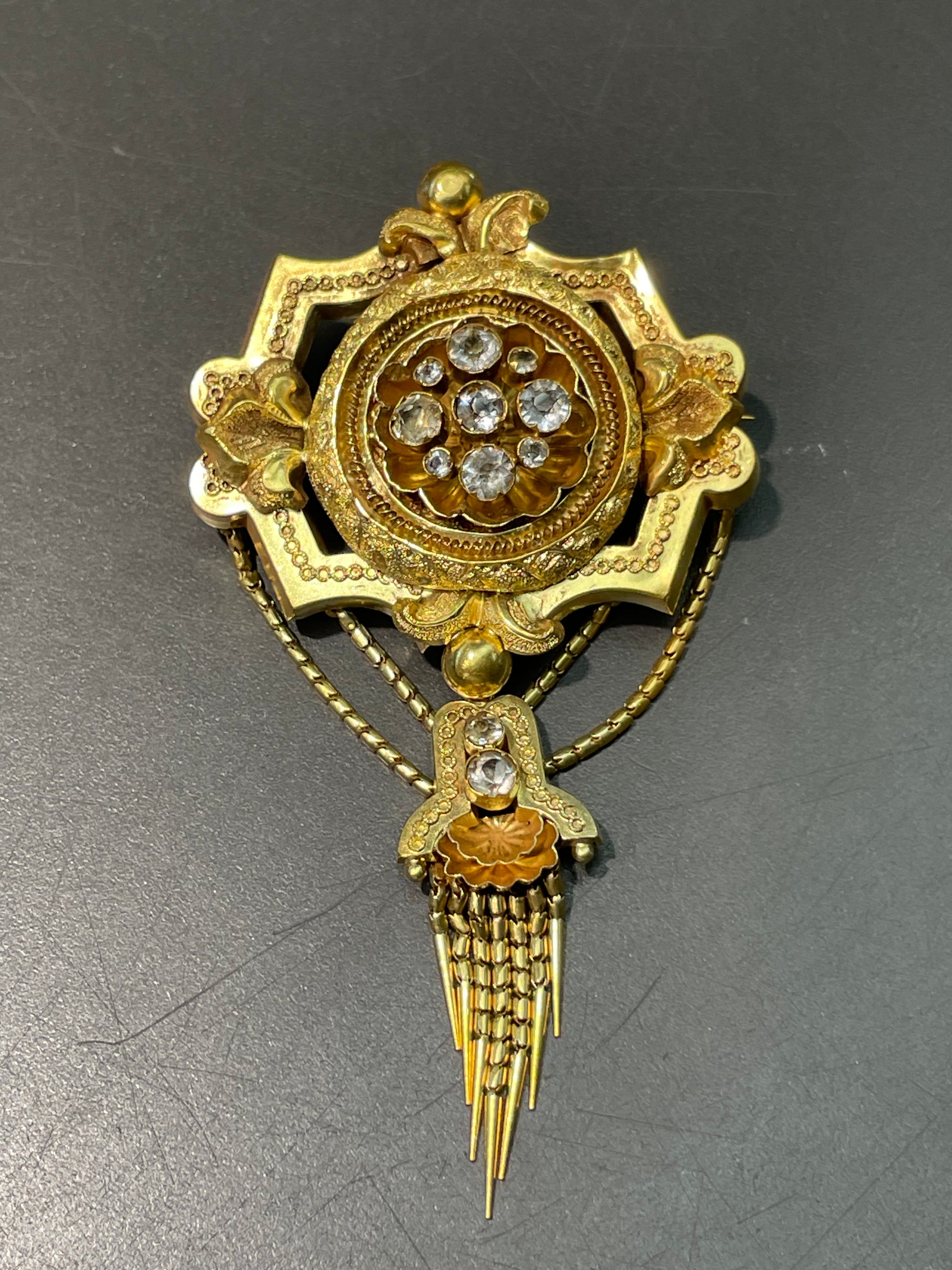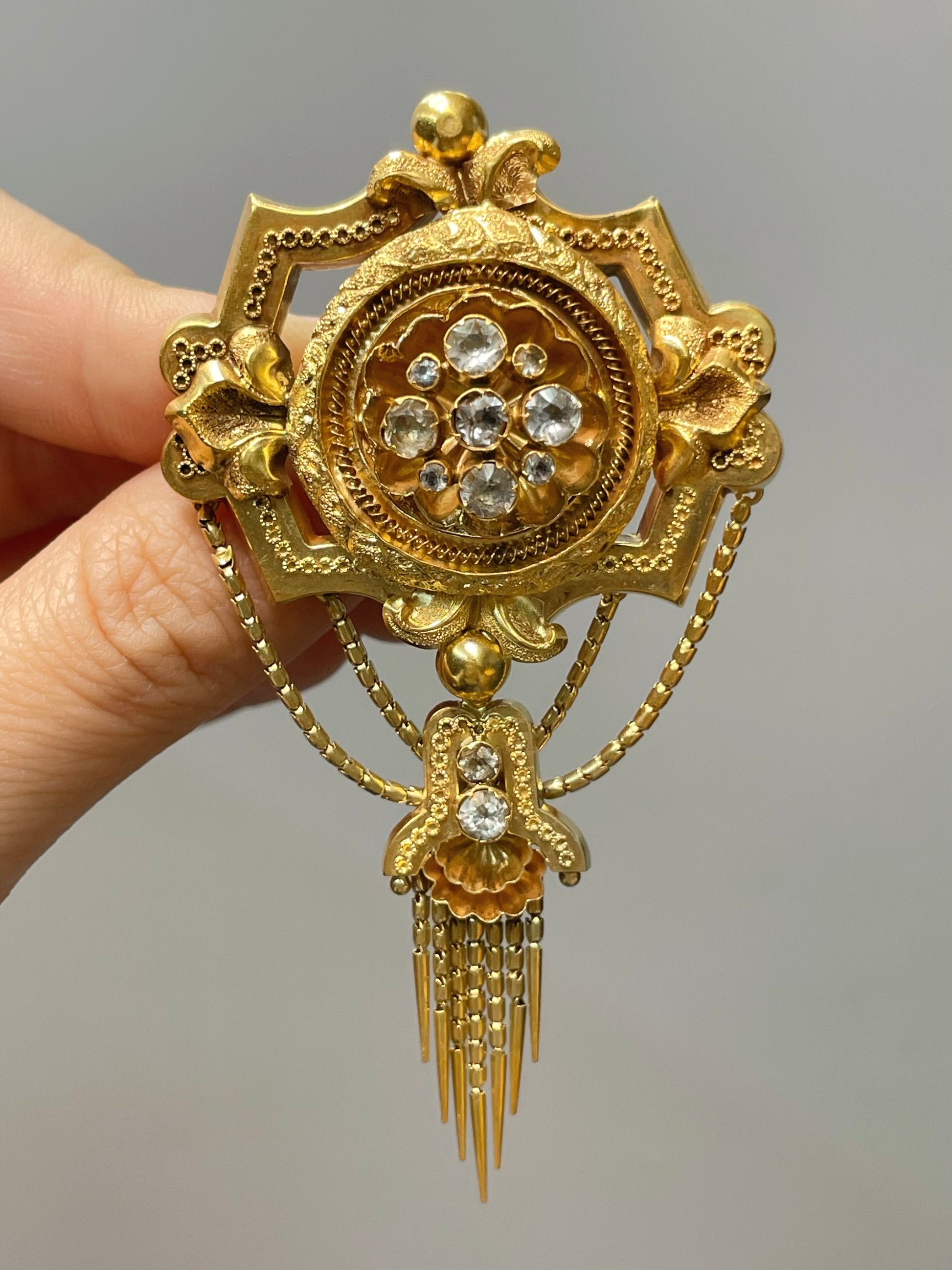 A stunning Victorian Etruscan era tassel brooch ornated with Etruscan revival granulation and repousse detailing. It features a cluster of white sapphires in the center, along with dancing fringes.