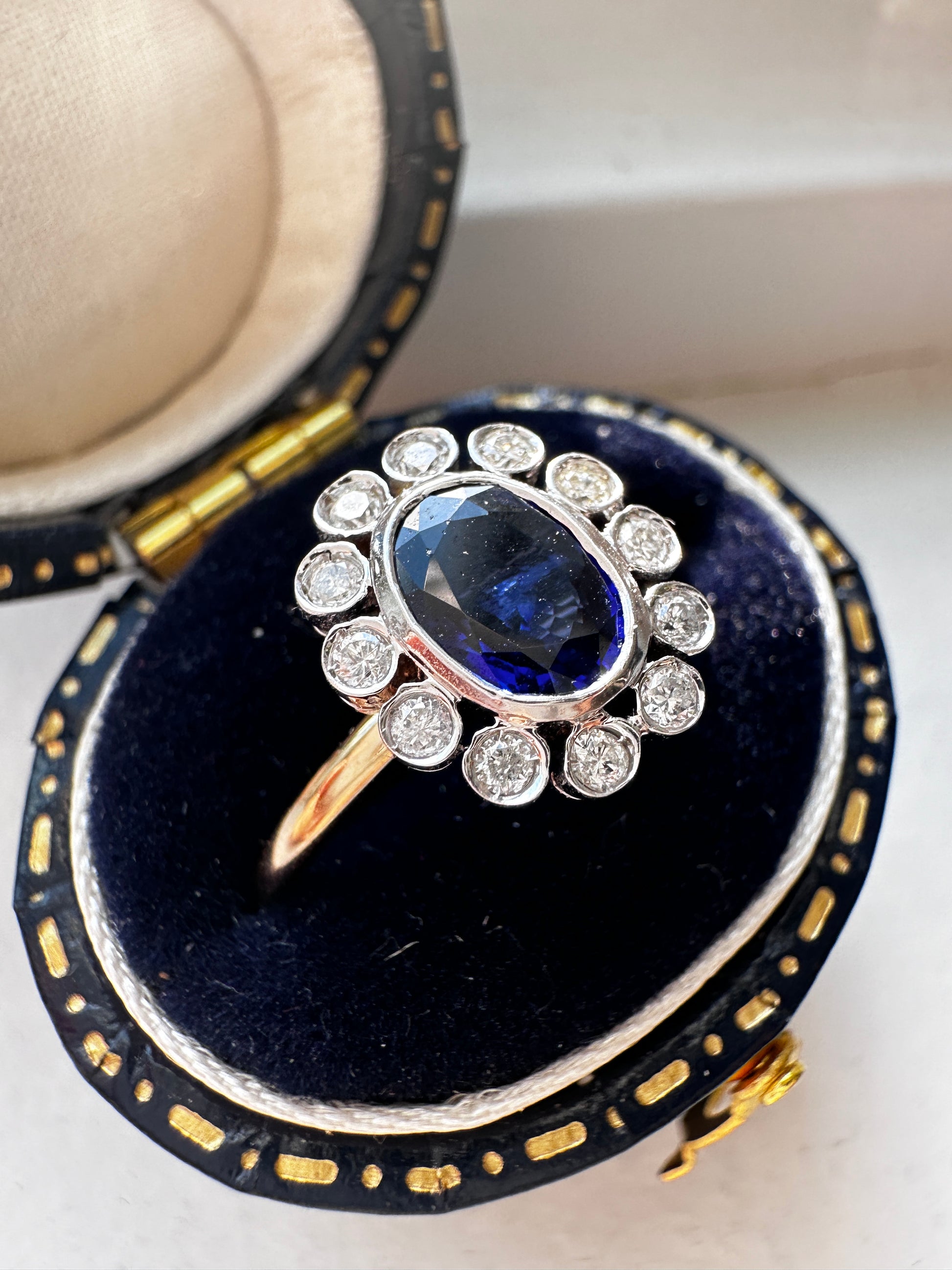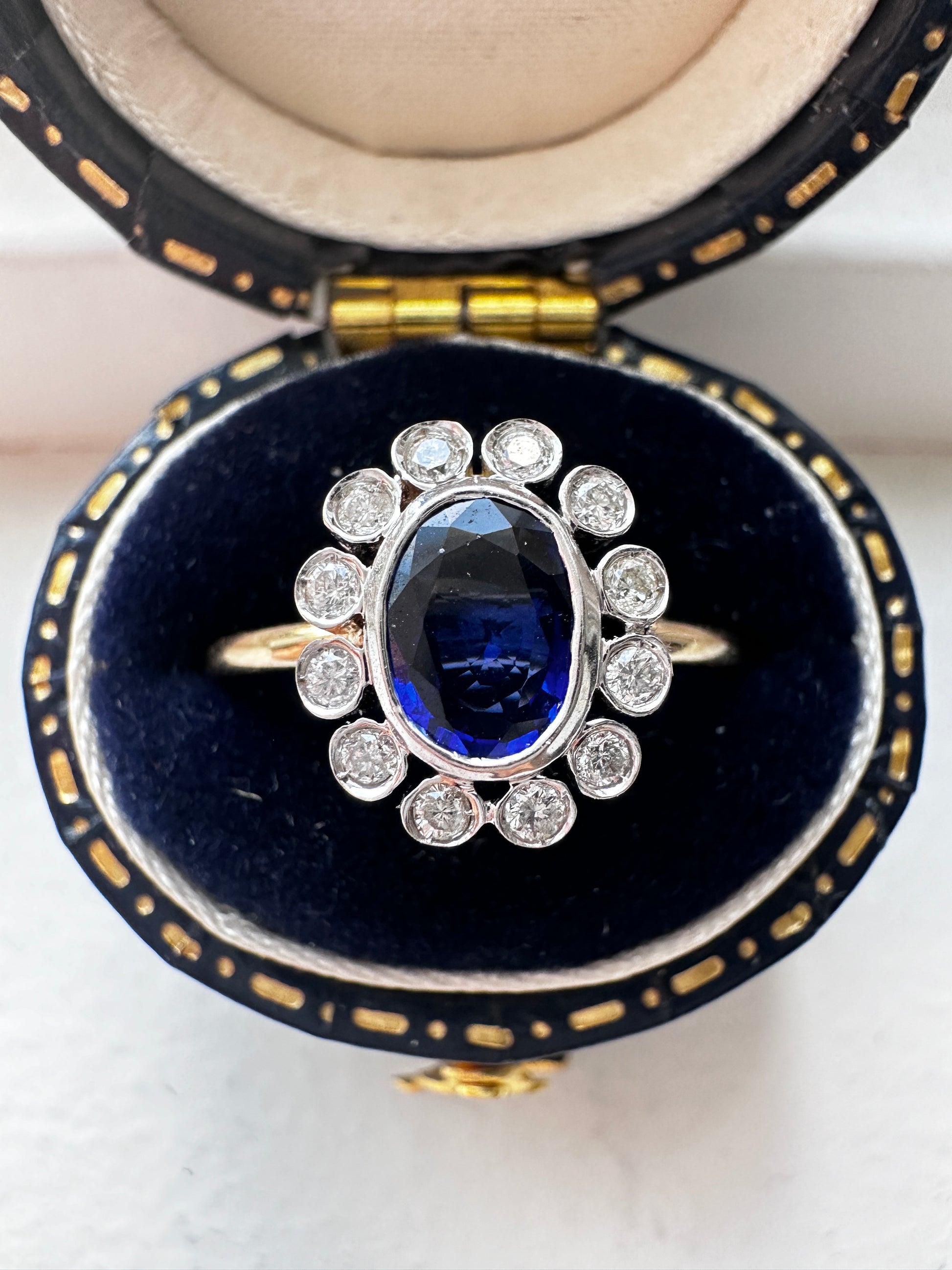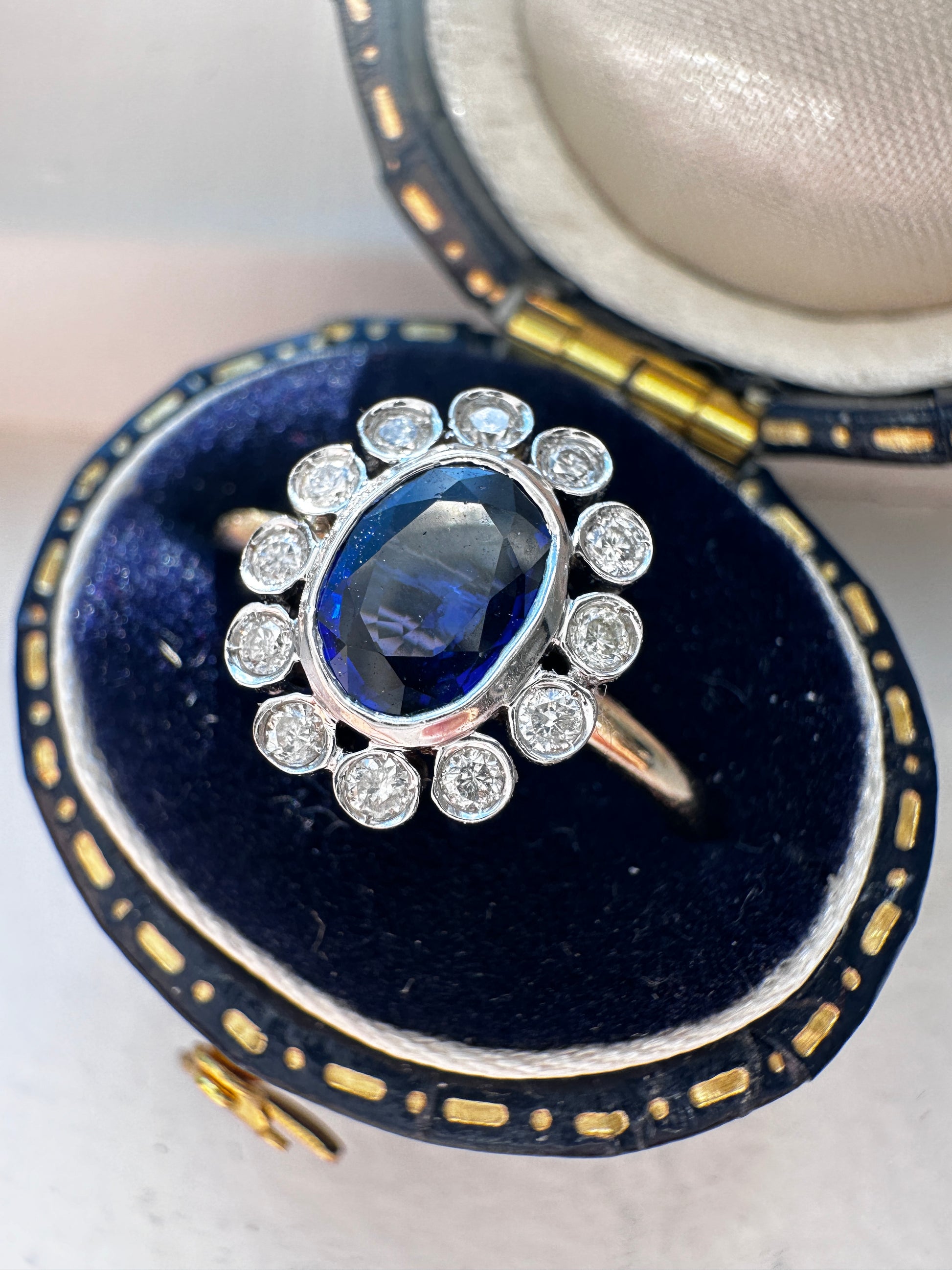 一枚爱德华时代风格的经典光环戒指,中央镶嵌一颗华丽鲜艳的深宝蓝色天然蓝宝石,总重 0.78 克拉,周围环绕着 12 颗耀眼的老式欧洲切割钻石,镶嵌在铂金戒指上,周围镶有 14K 金圆形戒圈。完美永恒的璀璨之物,可为您的宝石收藏锦上添花!