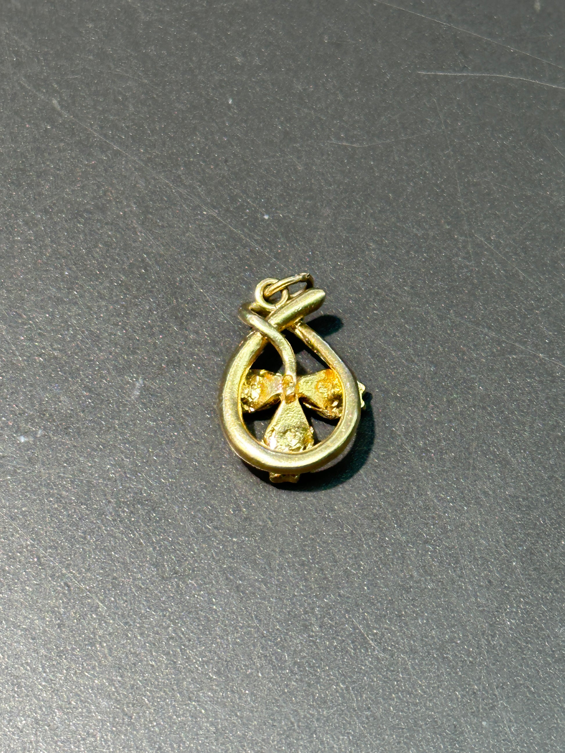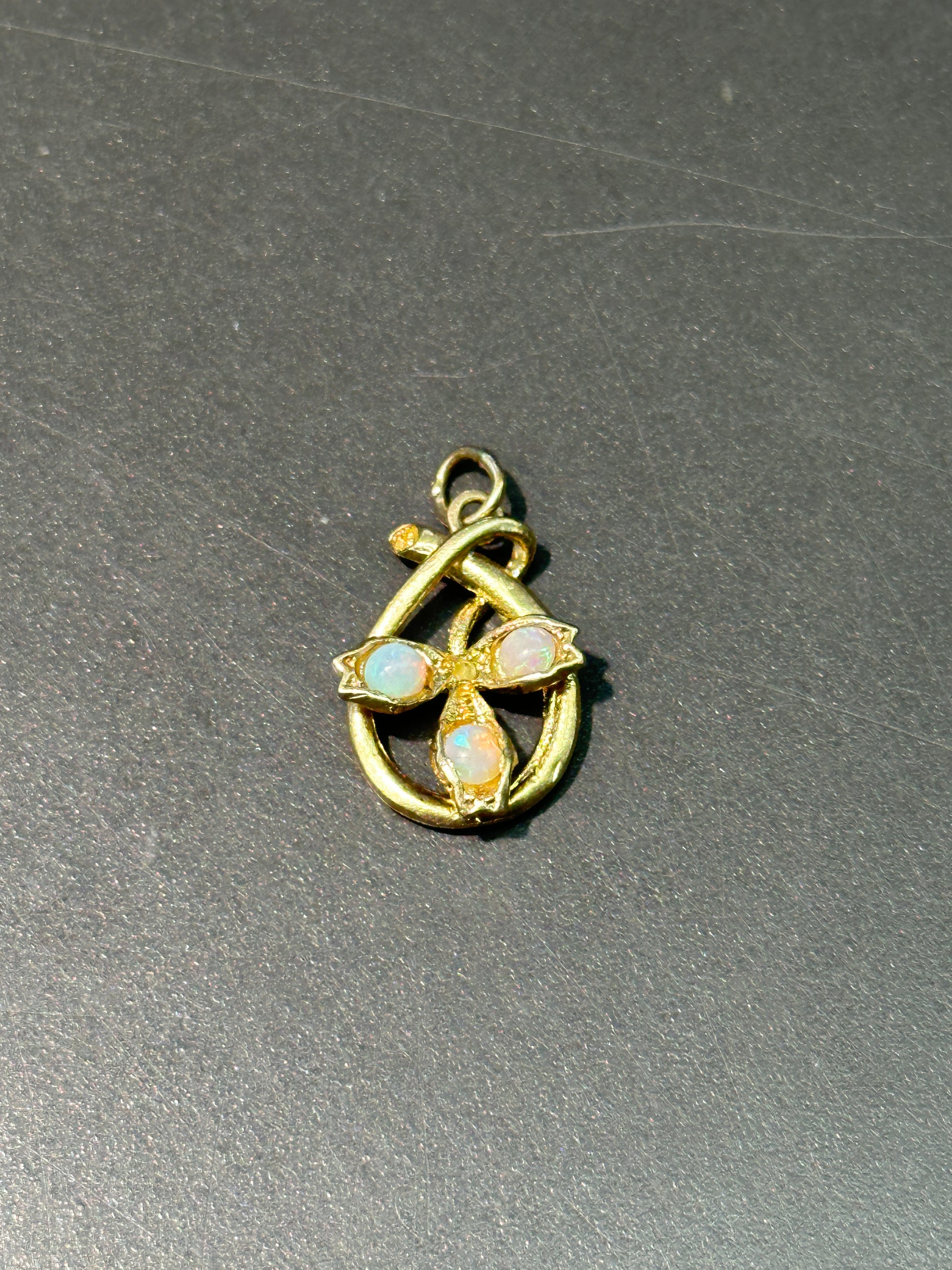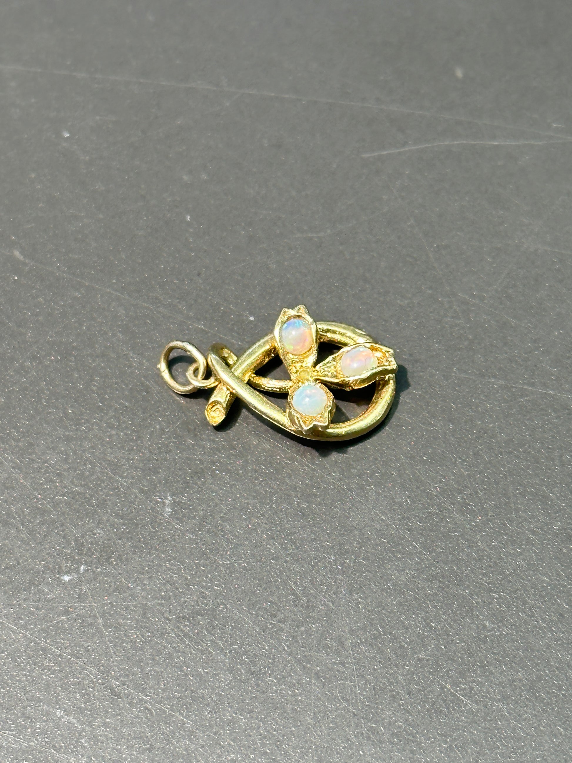 一种独一无二的新艺术风格幸运符,以 14K 黄金打造,以三叶草为特色,并点缀有三颗五彩纸屑状蛋白石。