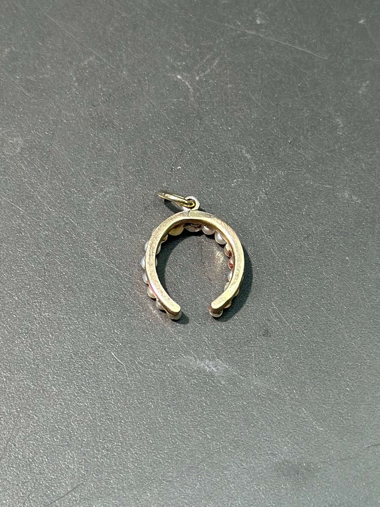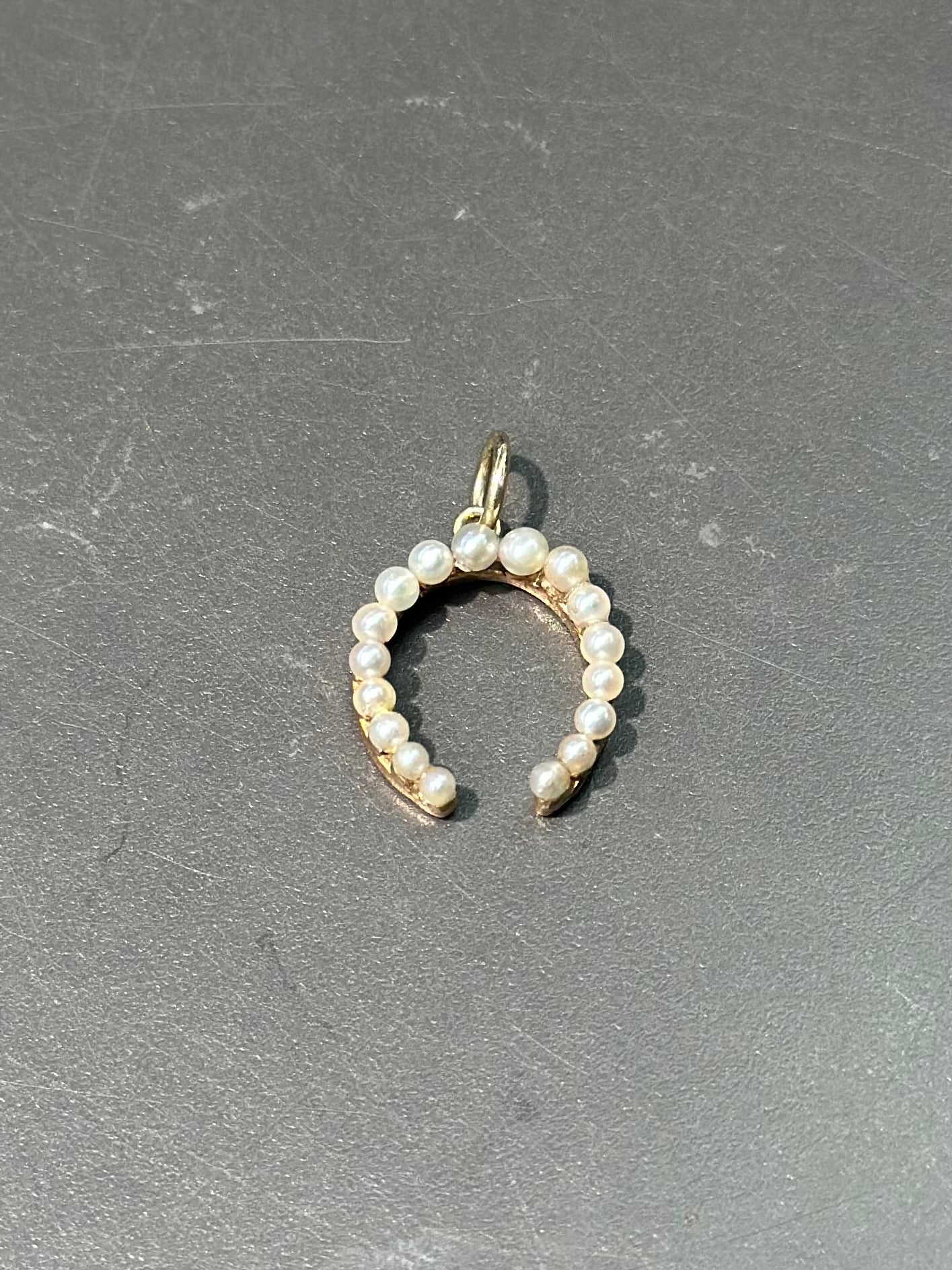 曾经是别针,现在变成了饰品!一款甜美可爱的 14K 金马蹄形饰品,饰有光泽的白色渐变珍珠。