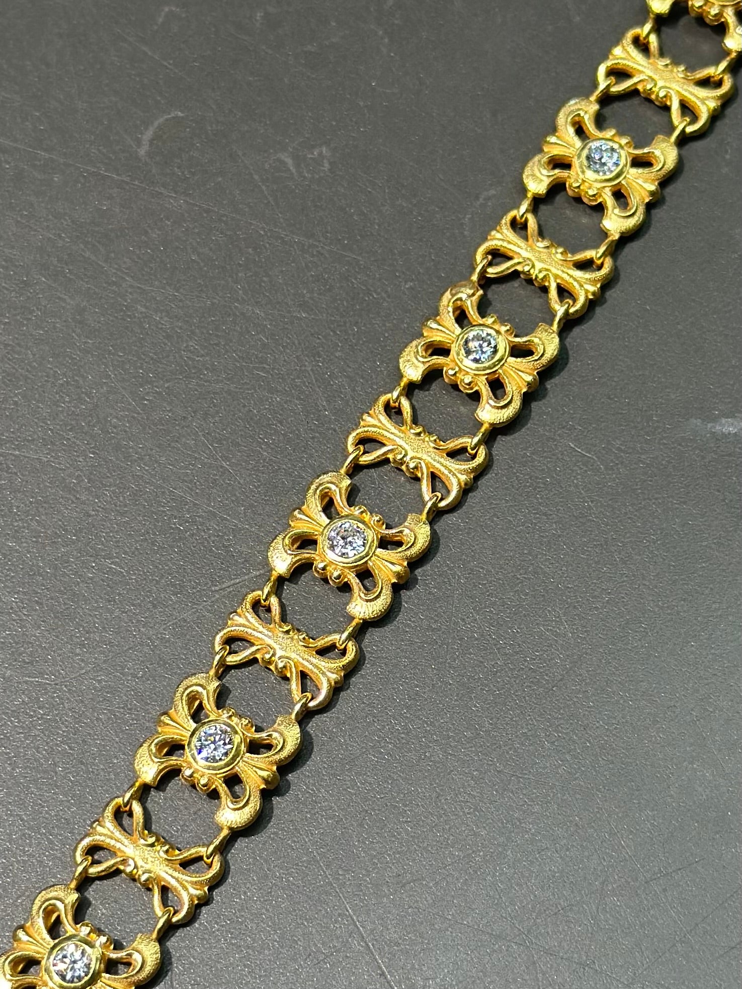 这款令人惊叹的手镯可追溯到新艺术运动时期,以 14K 金精心打造而成,每个链环上都有卷轴状图案细节,并镶嵌有 10 颗闪烁的白色钻石,总重约 1.2 克拉。