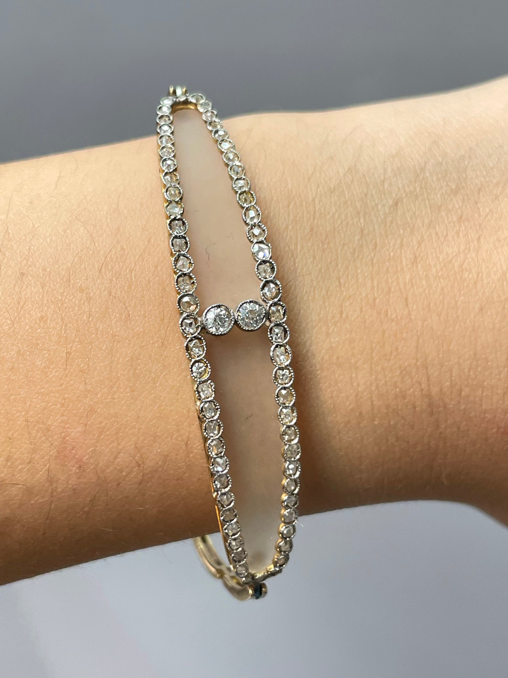 A graceful French Edwardian camphor glass bracelet, featuring a frosted rock quartz crystal centered with two sparkling European cut diamond, and a rim of tiny twinkler rose cut diamonds. Crafted in platinum topped 18K yellow gold. Finished with a box clasp.