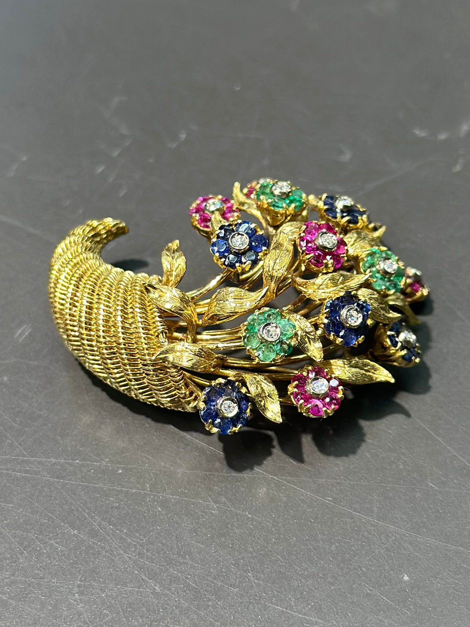 一枚华丽的复古蒂芙尼黄金颤动胸针,镶嵌着钻石、蓝宝石、红宝石和绿宝石。这枚胸针由天鹅绒般的 18K 金制成,纹理叶和金属线聚宝盆篮上的手工工艺令人惊叹。随着胸针的移动,每一朵花都会优雅地颤动,动作轻柔流畅。胸针上标有“蒂芙尼、意大利和 18K”。