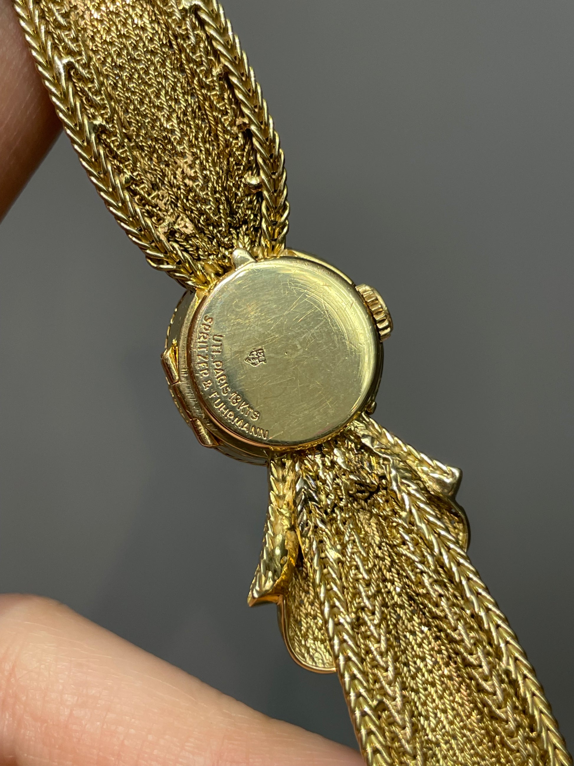 This fabulous watch is singed by UTI Paris Watch Co. designed as a hidden watch with a lovely mesh ribbon-bow design. The watch is manual, and is in perfect condition, keeps time accurately. Stamped with eagle head assay mark for French origin.