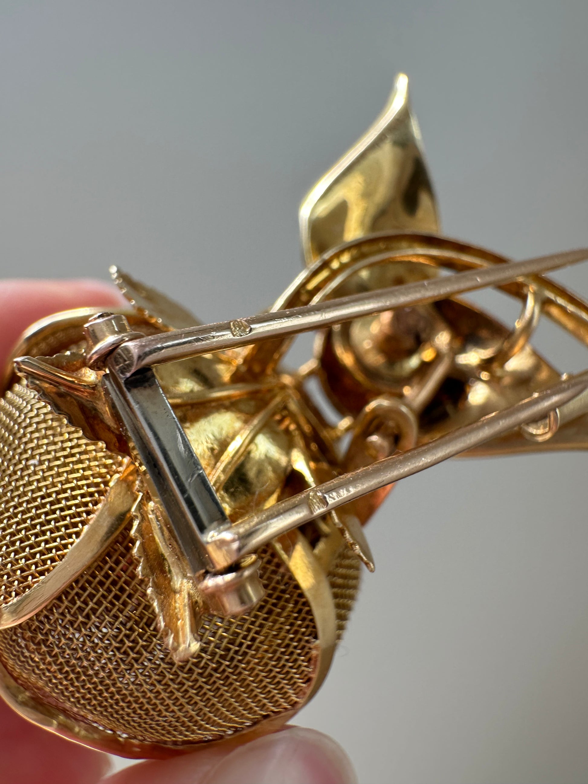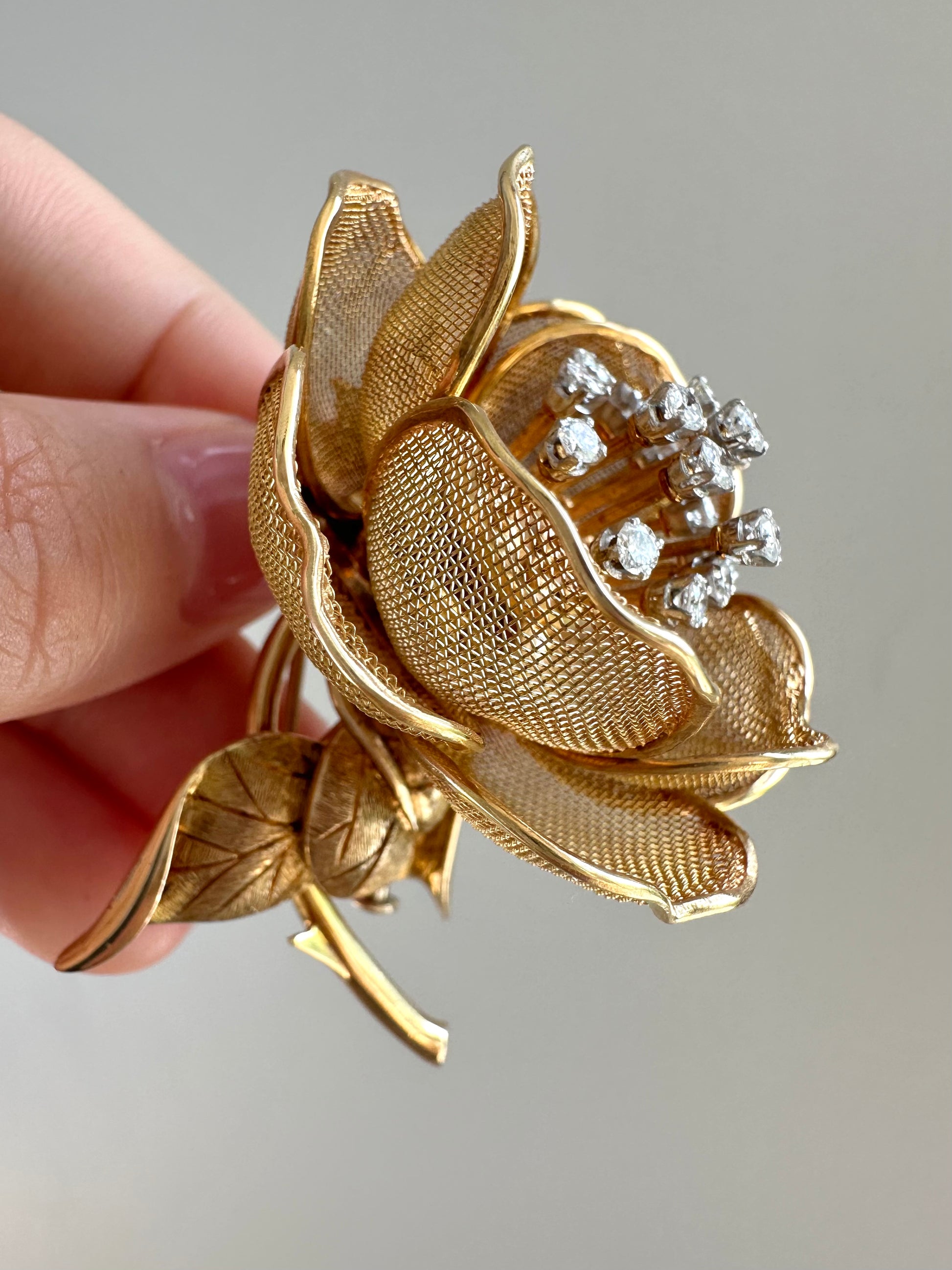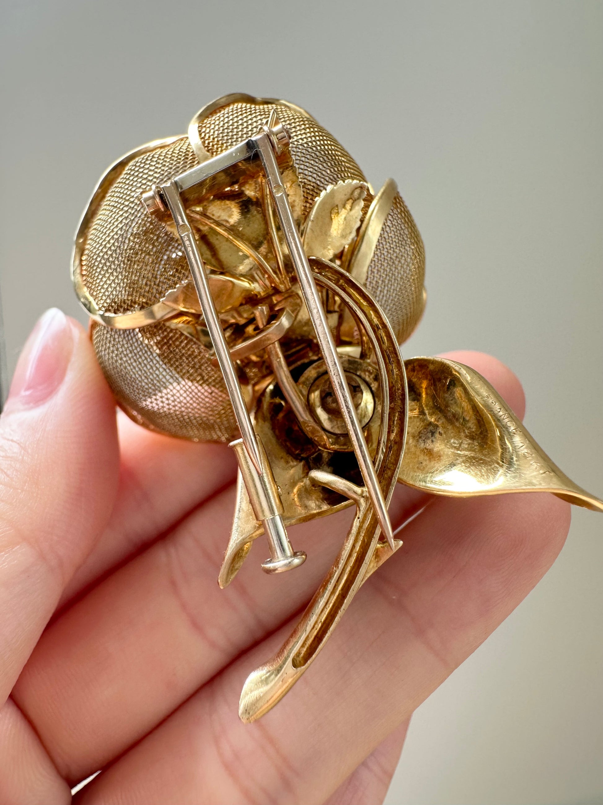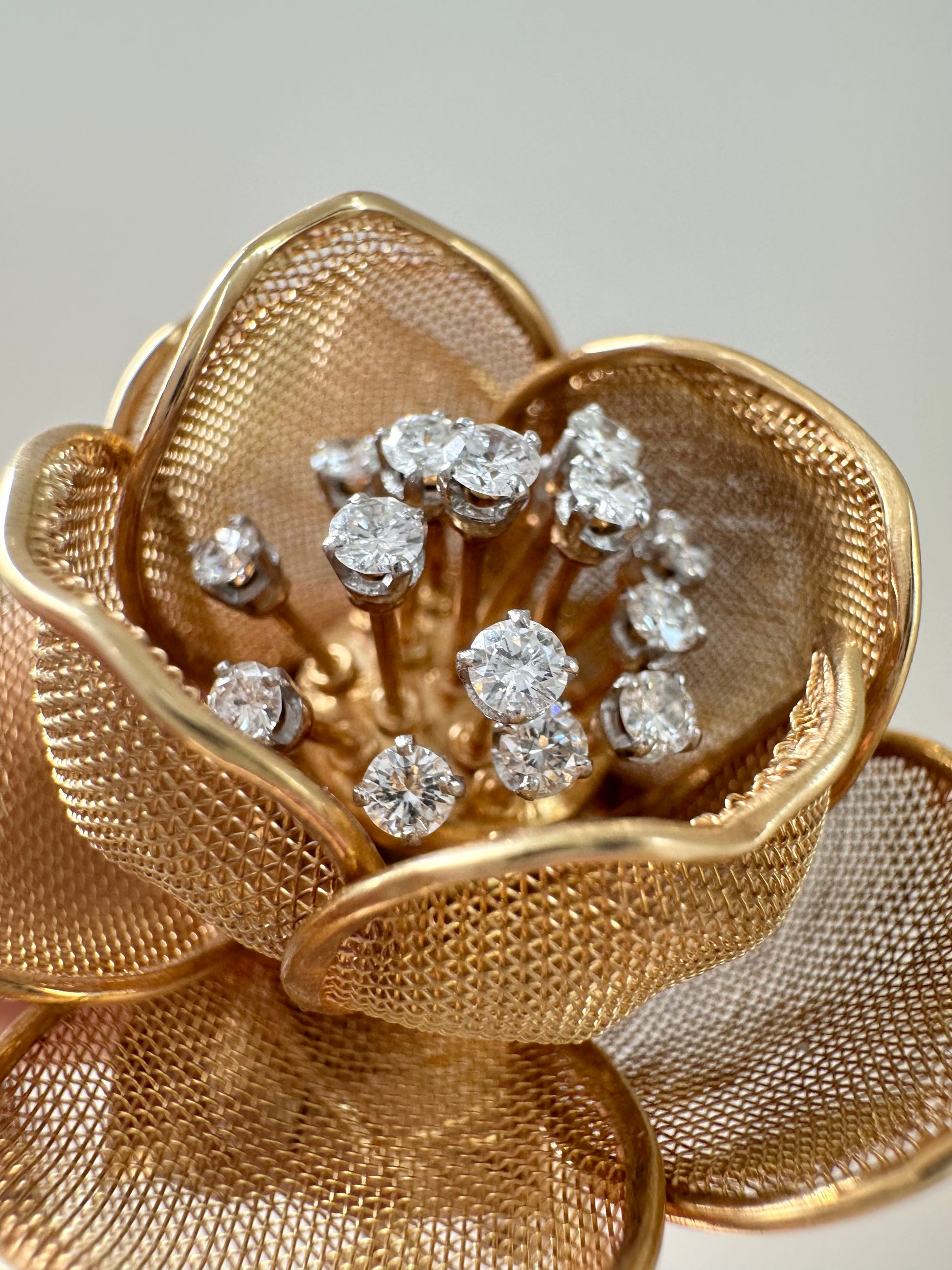 这款精美的法式镀金胸针采用 18K 金打造而成,带有可打开和关闭的网状踏板,采用花朵设计。中心镶嵌着闪闪发光的白色钻石,和谐地颤动着。特殊的颤动技术赋予花朵微妙而优雅的动感。这款胸针完美地为任何服装增添了一丝优雅气息,将经典魅力与永恒之美融为一体。