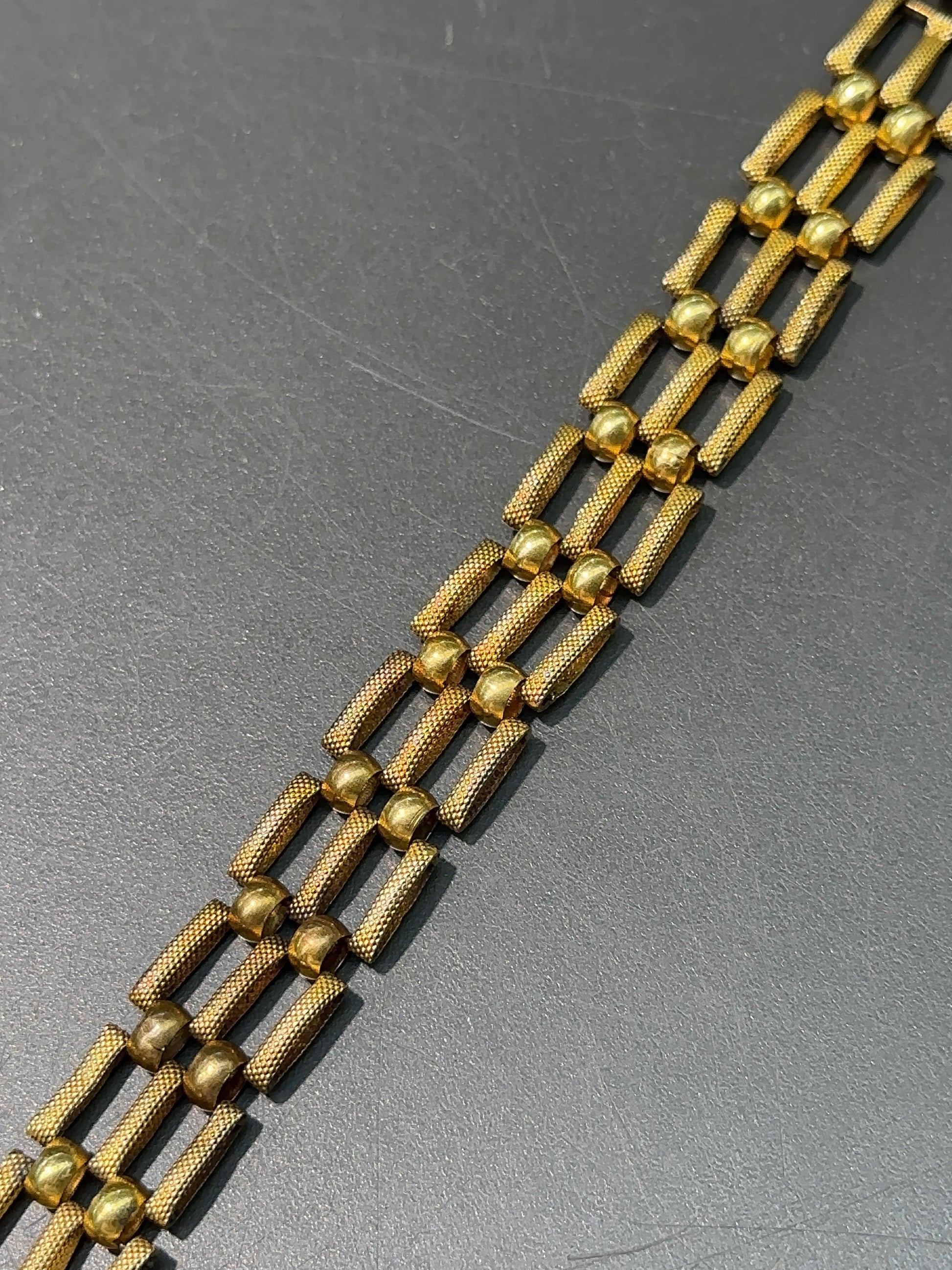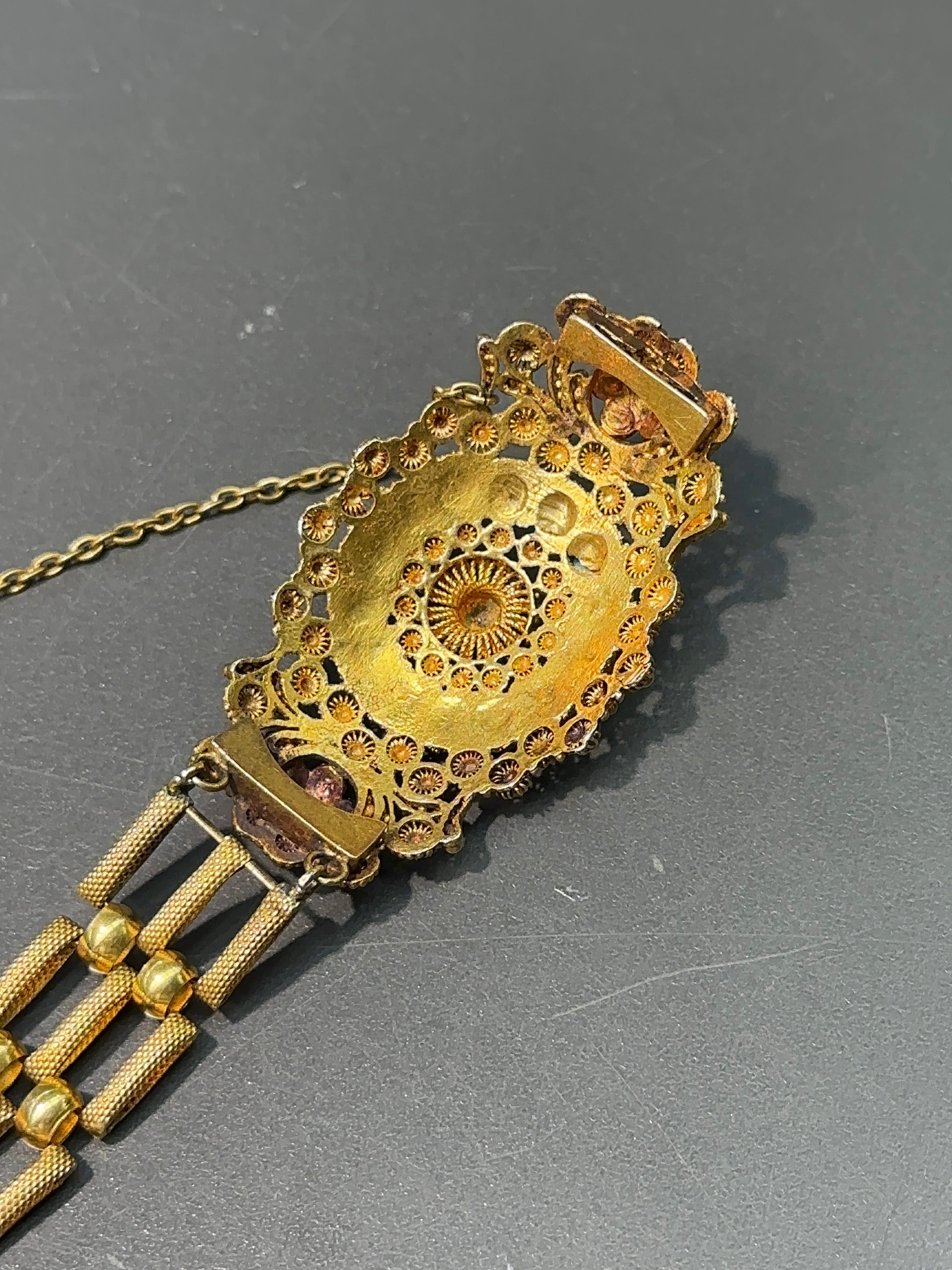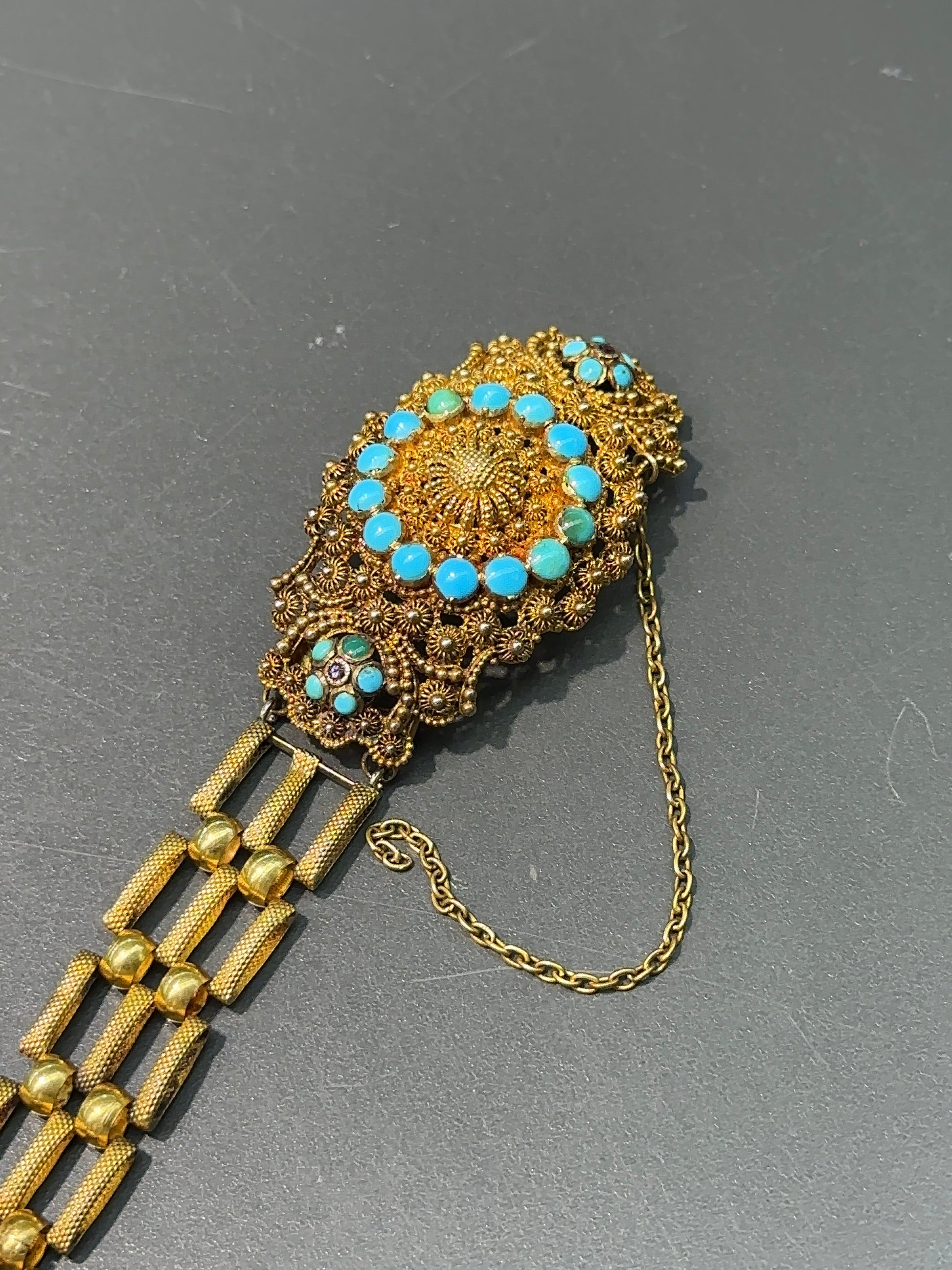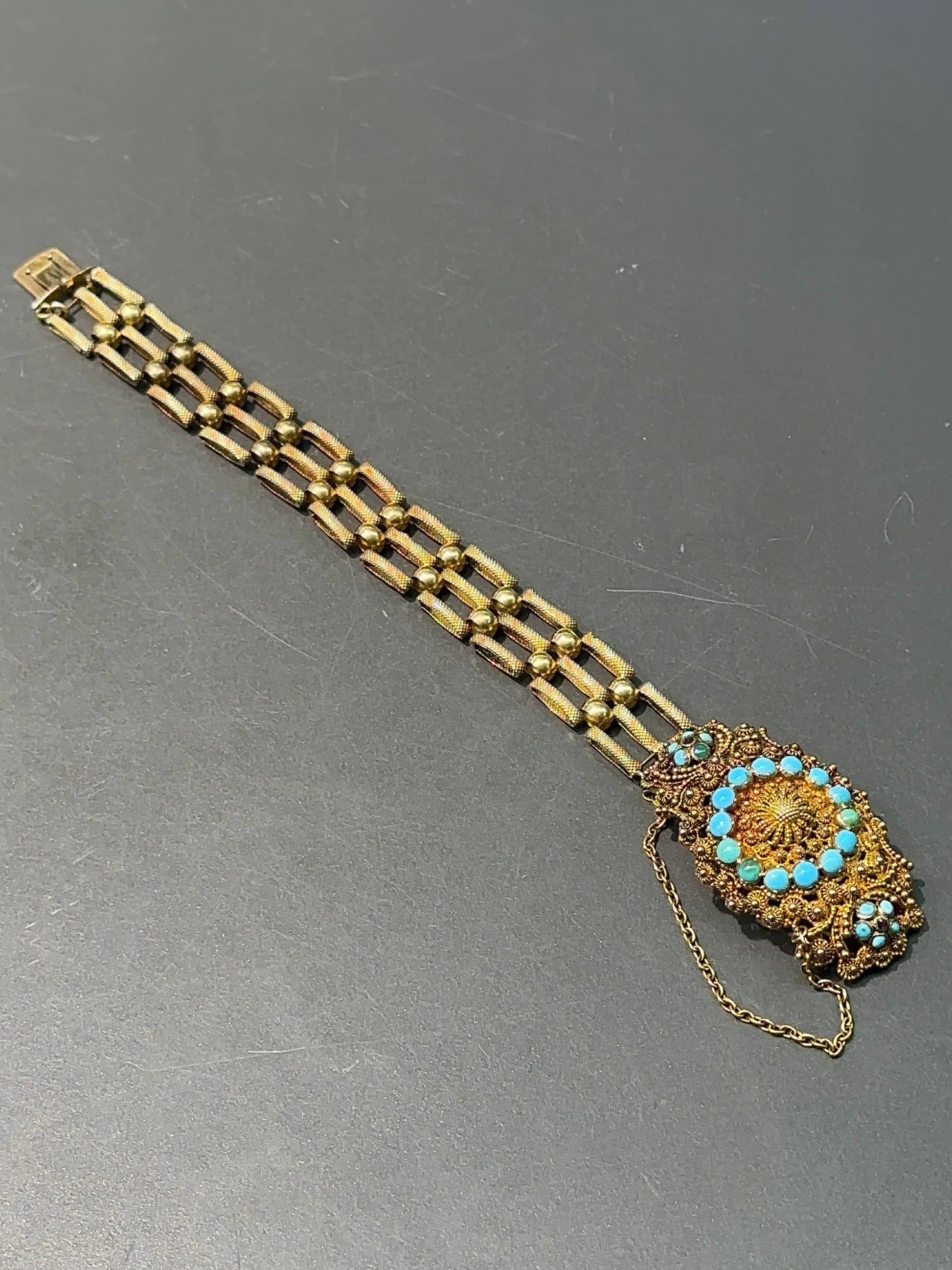 这款精美的手链可追溯至乔治王朝晚期,采用 18K 金手工制作,工艺精湛,通体饰有精致的金银线花纹。饰有鲜艳的知更鸟蛋蓝绿松石。