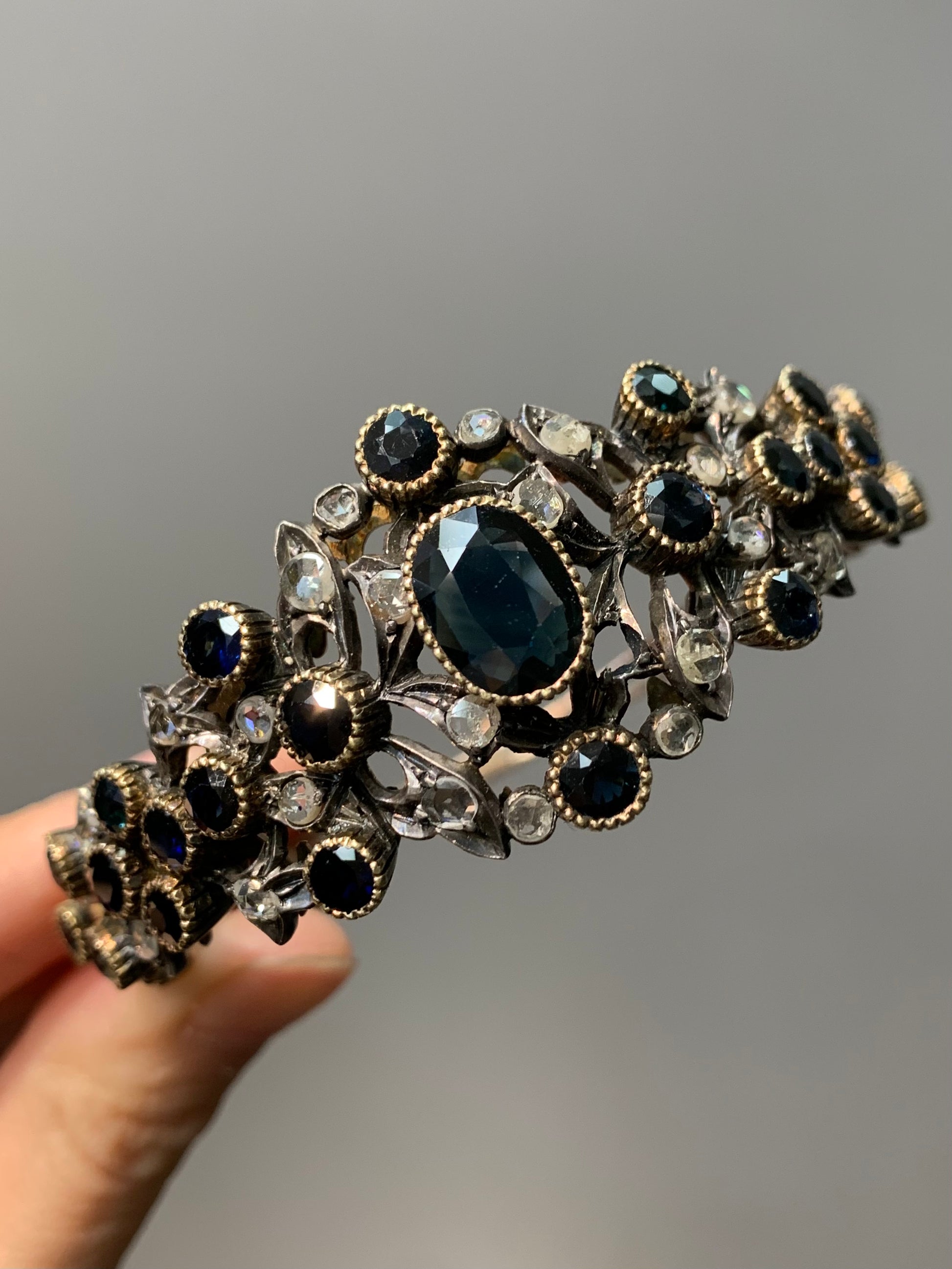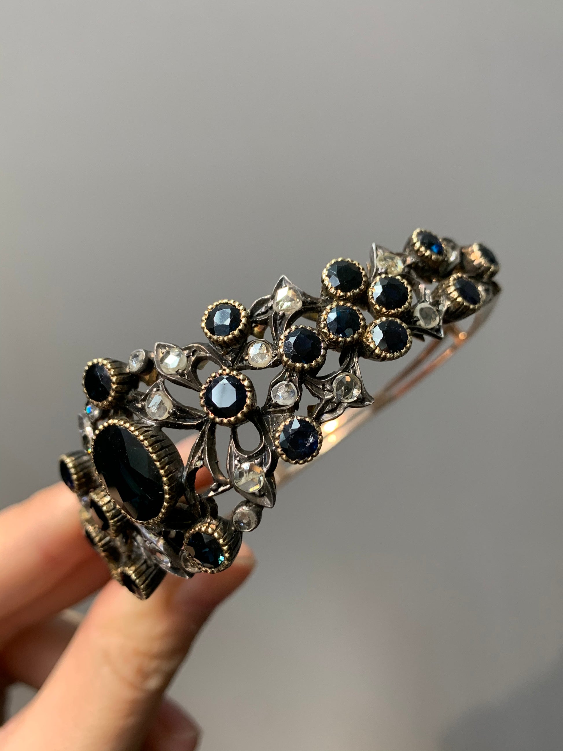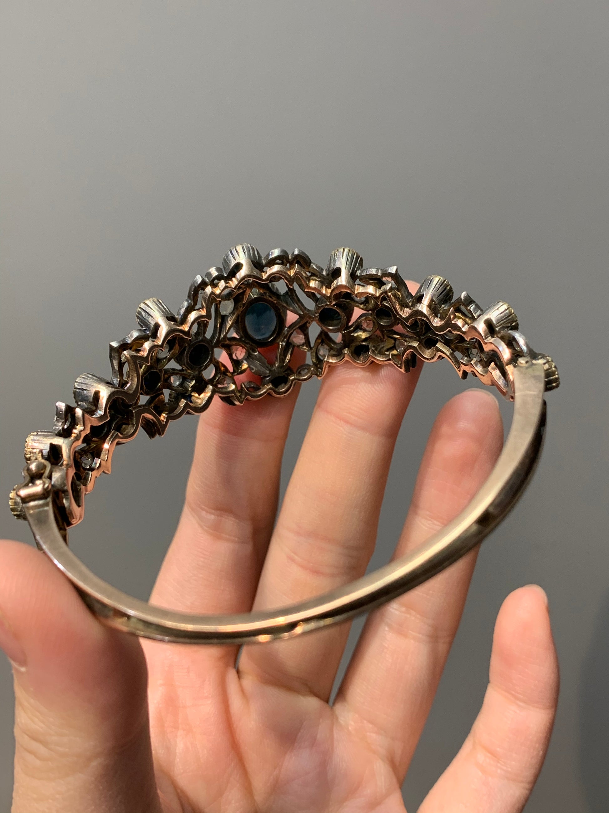 这款华丽的古董风格手链采用 14K 纯银打造而成。镶嵌约 2.0 克拉的闪亮玫瑰切割钻石和 4.0 克拉的蓝宝石。周长 7.0 英寸。