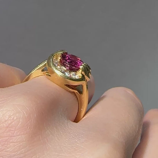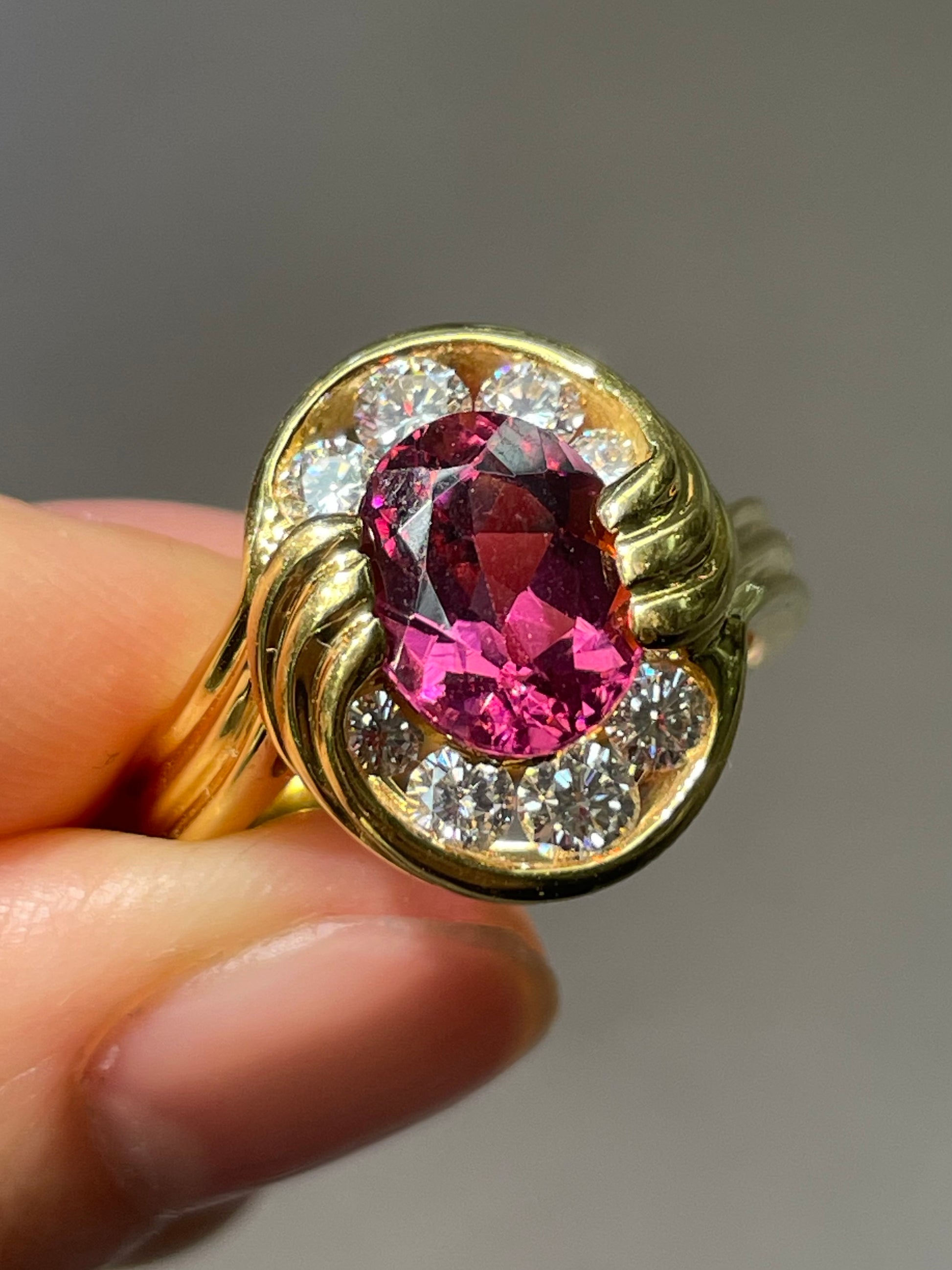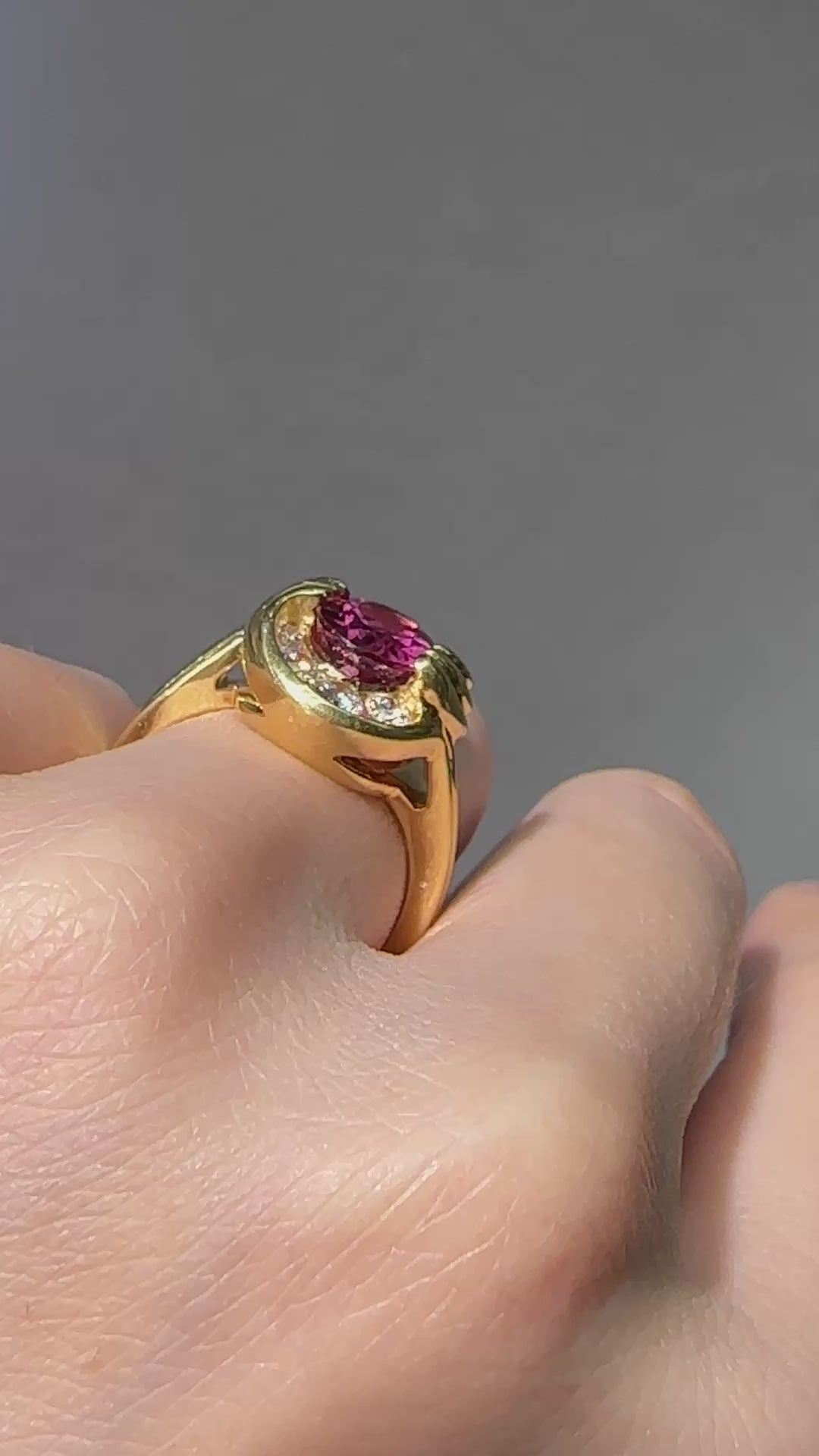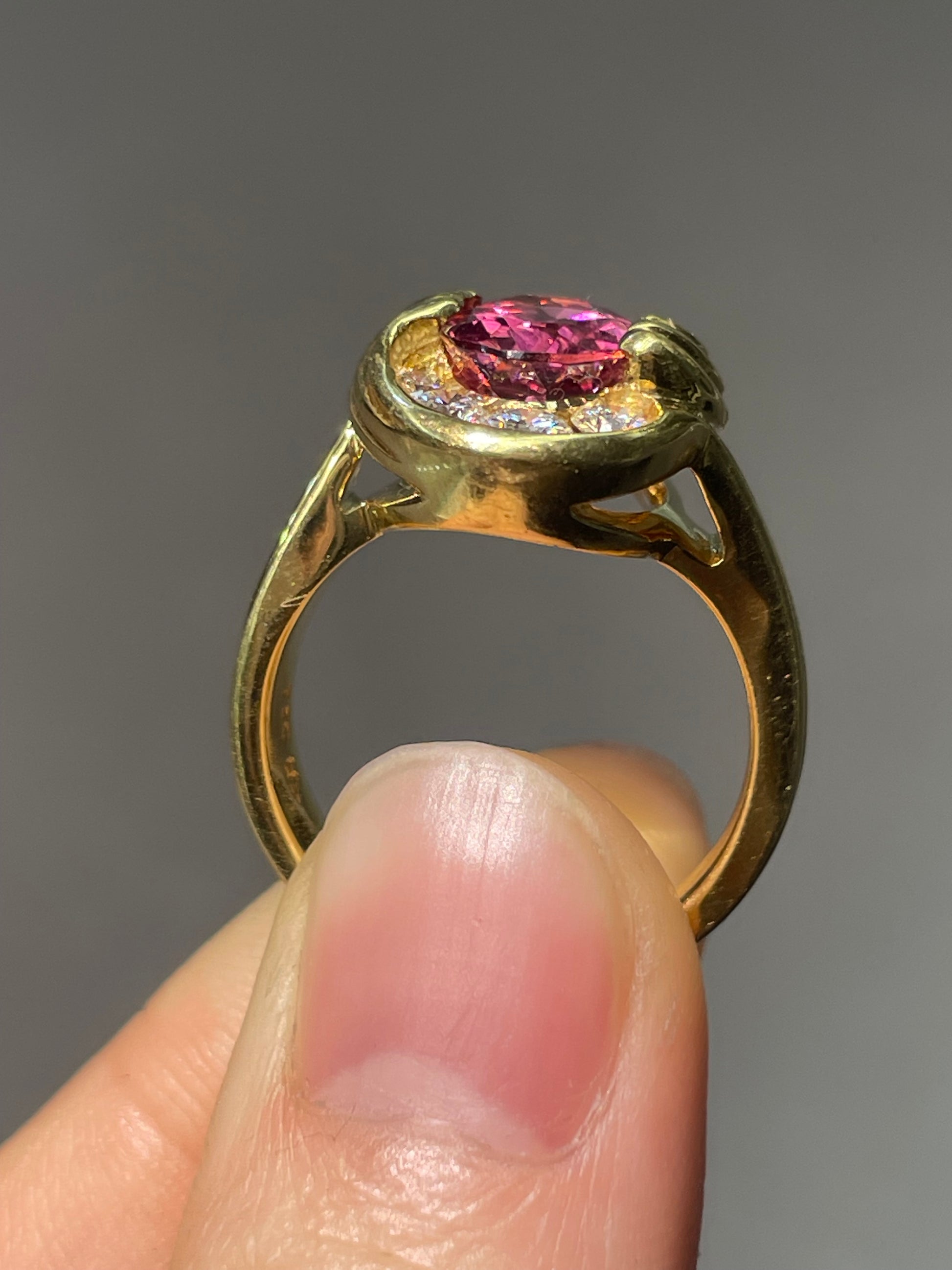 这款由 Richard Krementz 设计的引人注目的 18K 黄金红碧玺戒指绝对令人惊艳!戒指中央镶嵌着一颗 3.06 克拉的红碧玺(9.1 毫米 x 7 毫米),散发着令人难以置信的浓郁而饱和的覆盆子红色调。这颗充满活力的戒指周围环绕着一圈耀眼的钻石,每颗钻石都经过精心挑选,拥有无瑕的净度、卓越的 VS 级和近乎无色的 E 色。温暖的黄金镶嵌凸显了鲜艳的红碧玺和璀璨的钻石!无论是作为一件点睛之笔还是一份特别的礼物,这枚戒指一定会让所有看到它的人都为之着迷。