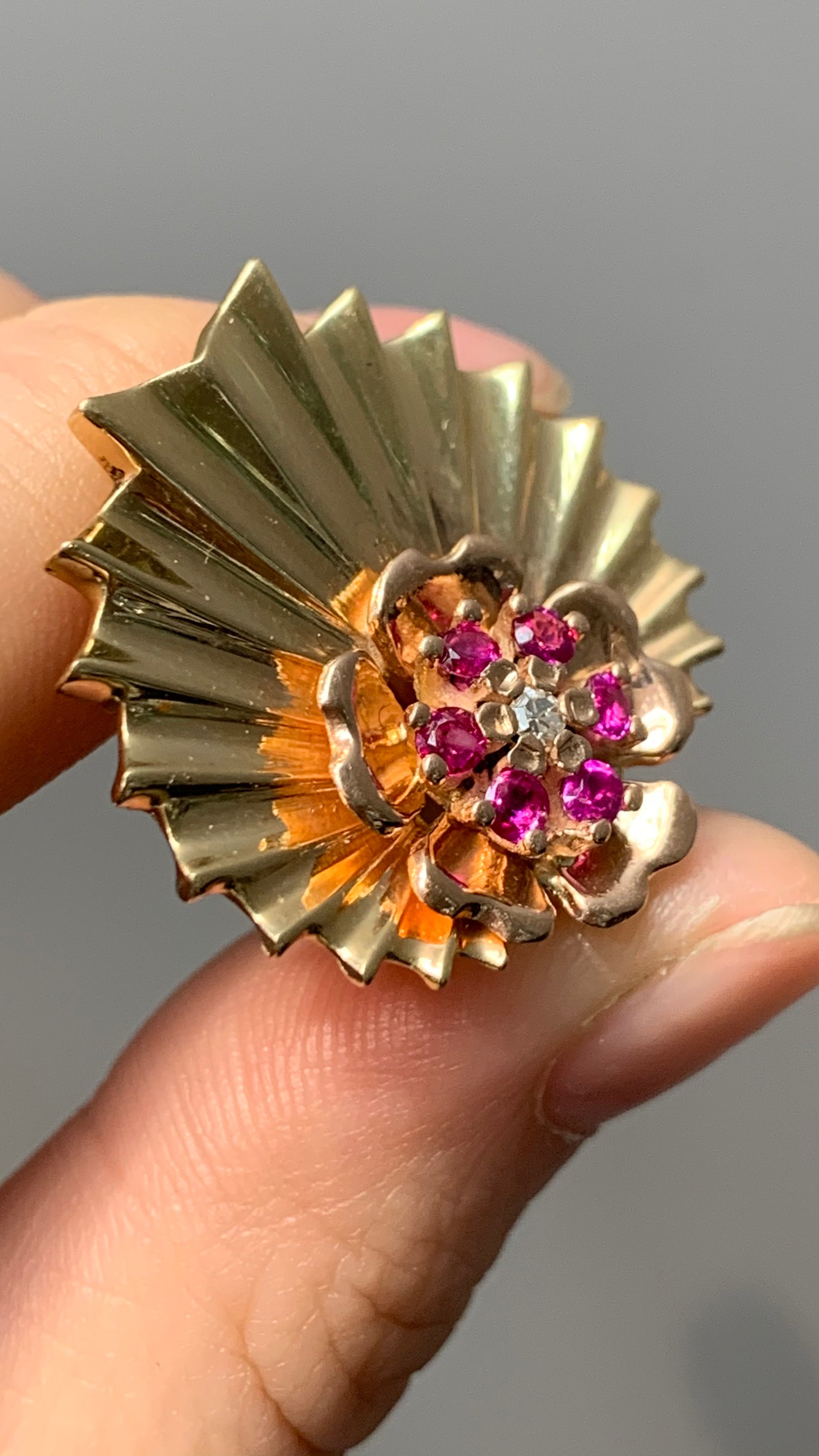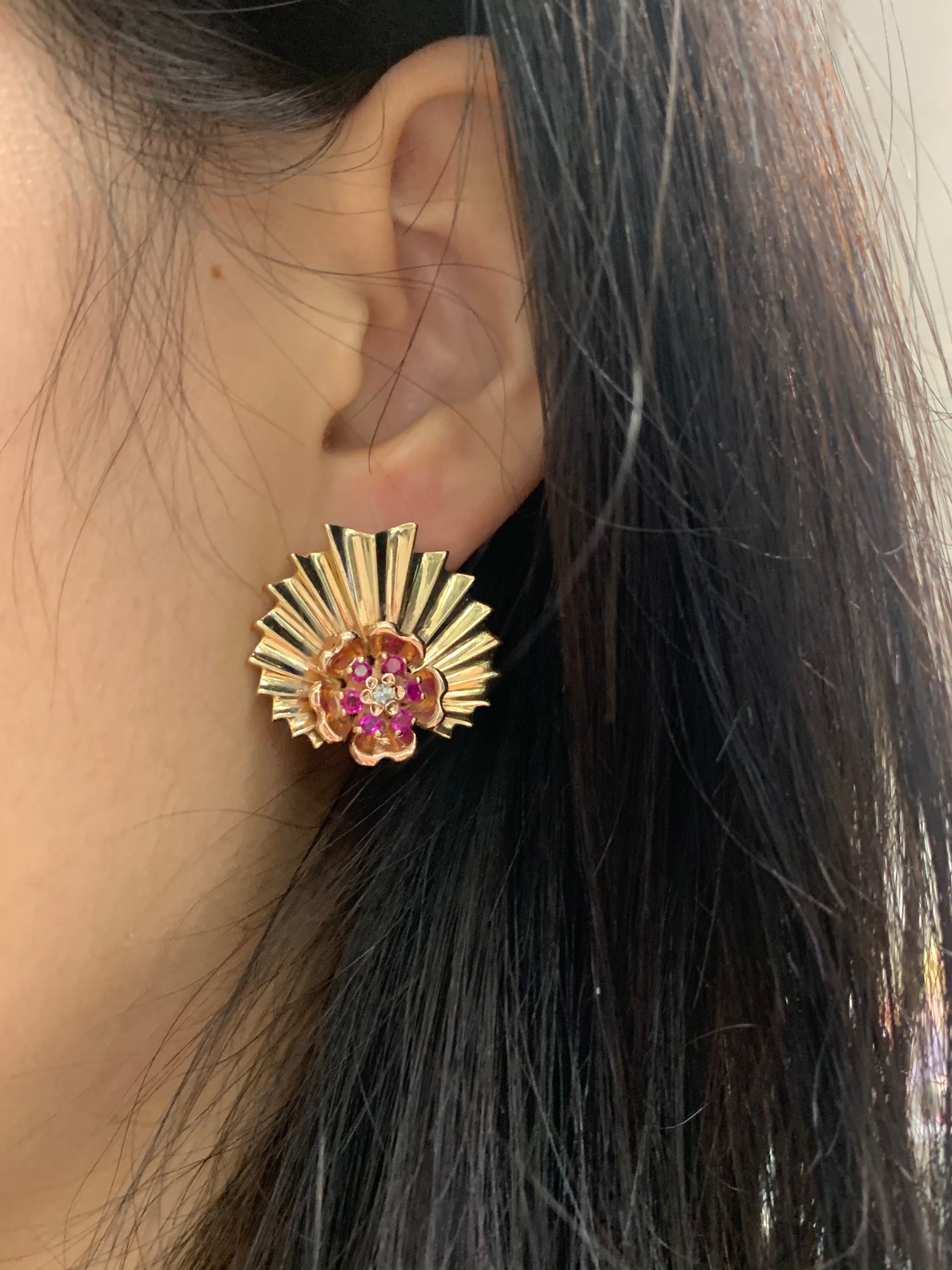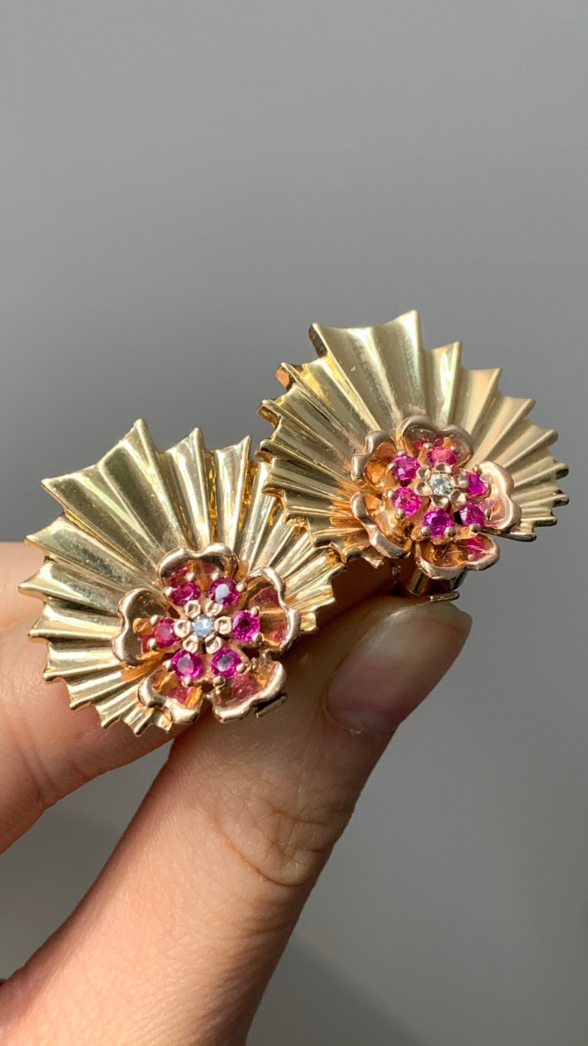 一款迷人的复古耳环,形似扇子,由放射状的饰片组成。饰片上点缀着鲜艳的粉红色红宝石,构成花瓣,中间镶嵌着一颗明亮的白色钻石。