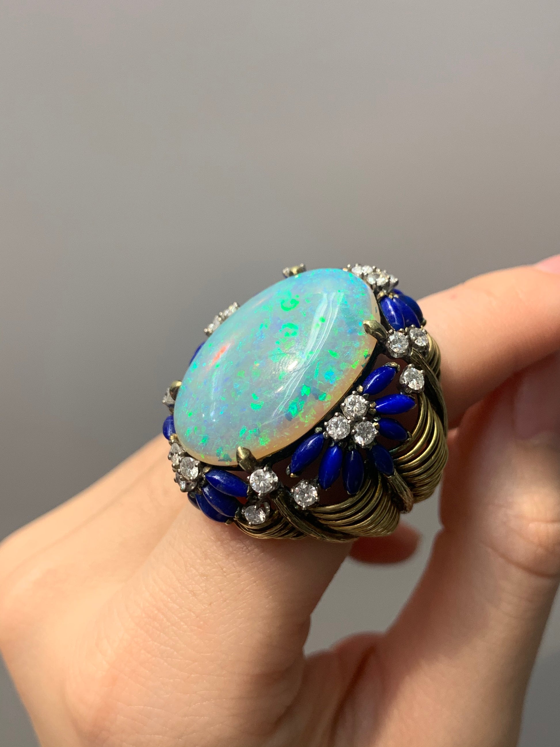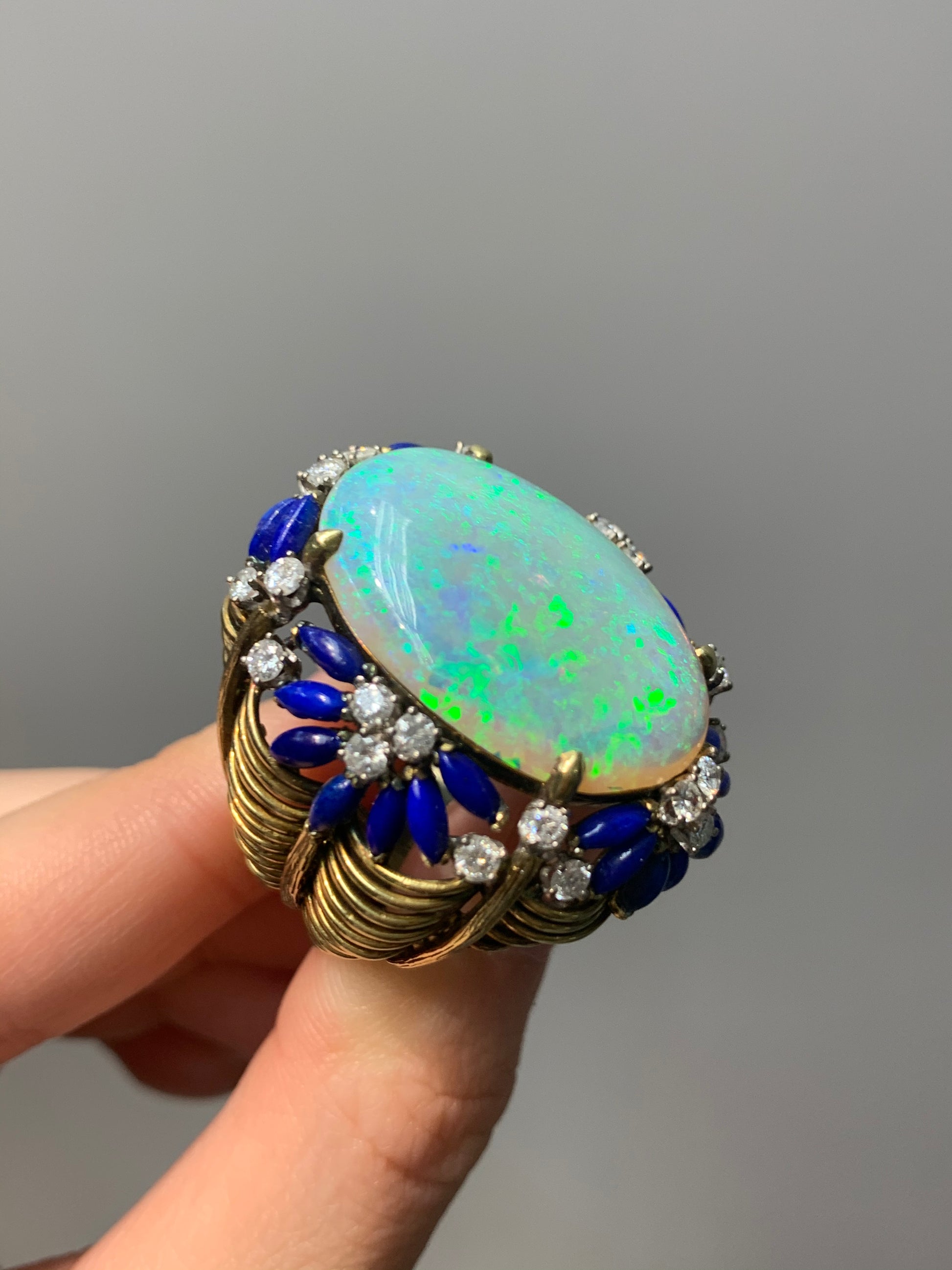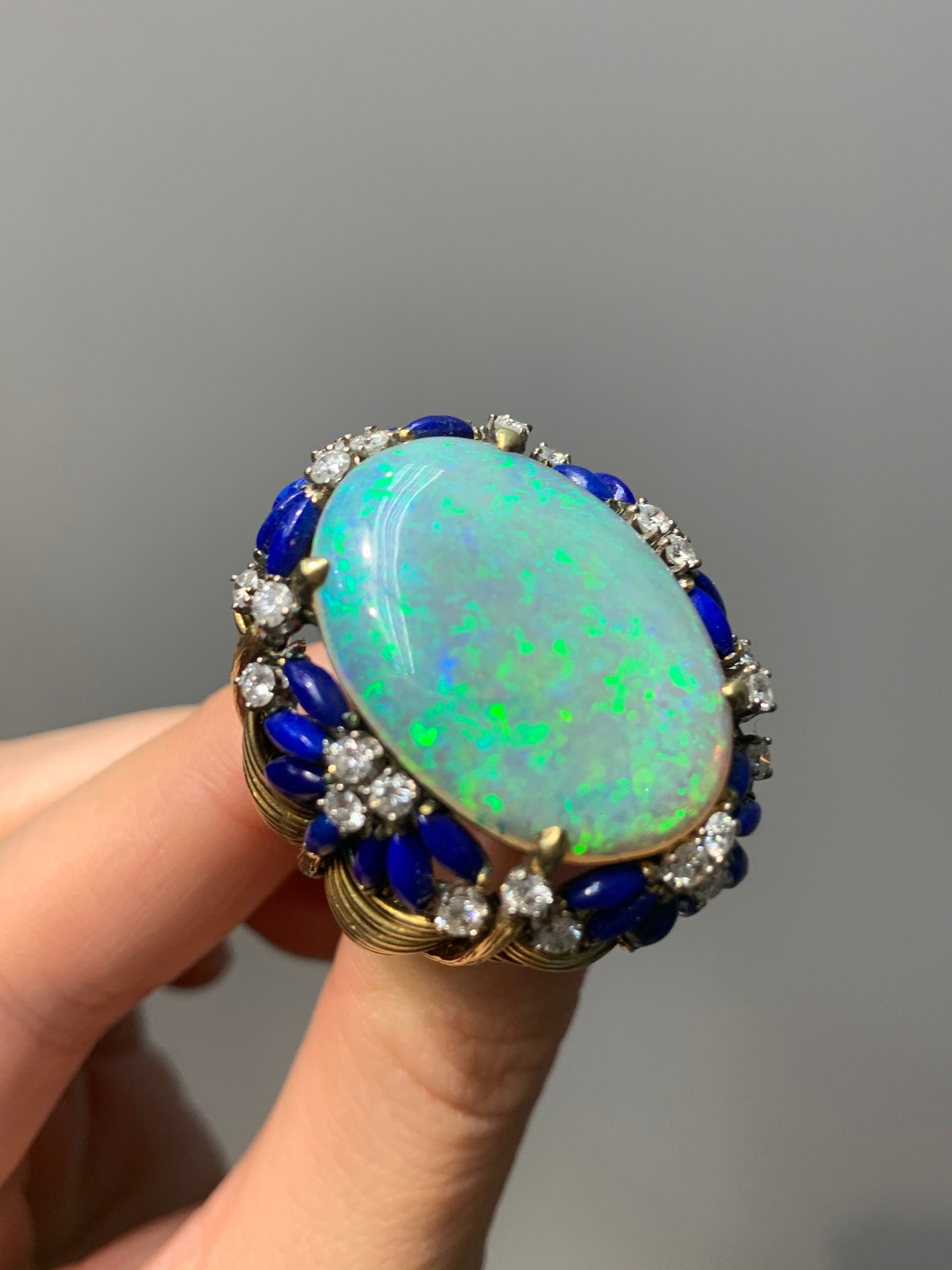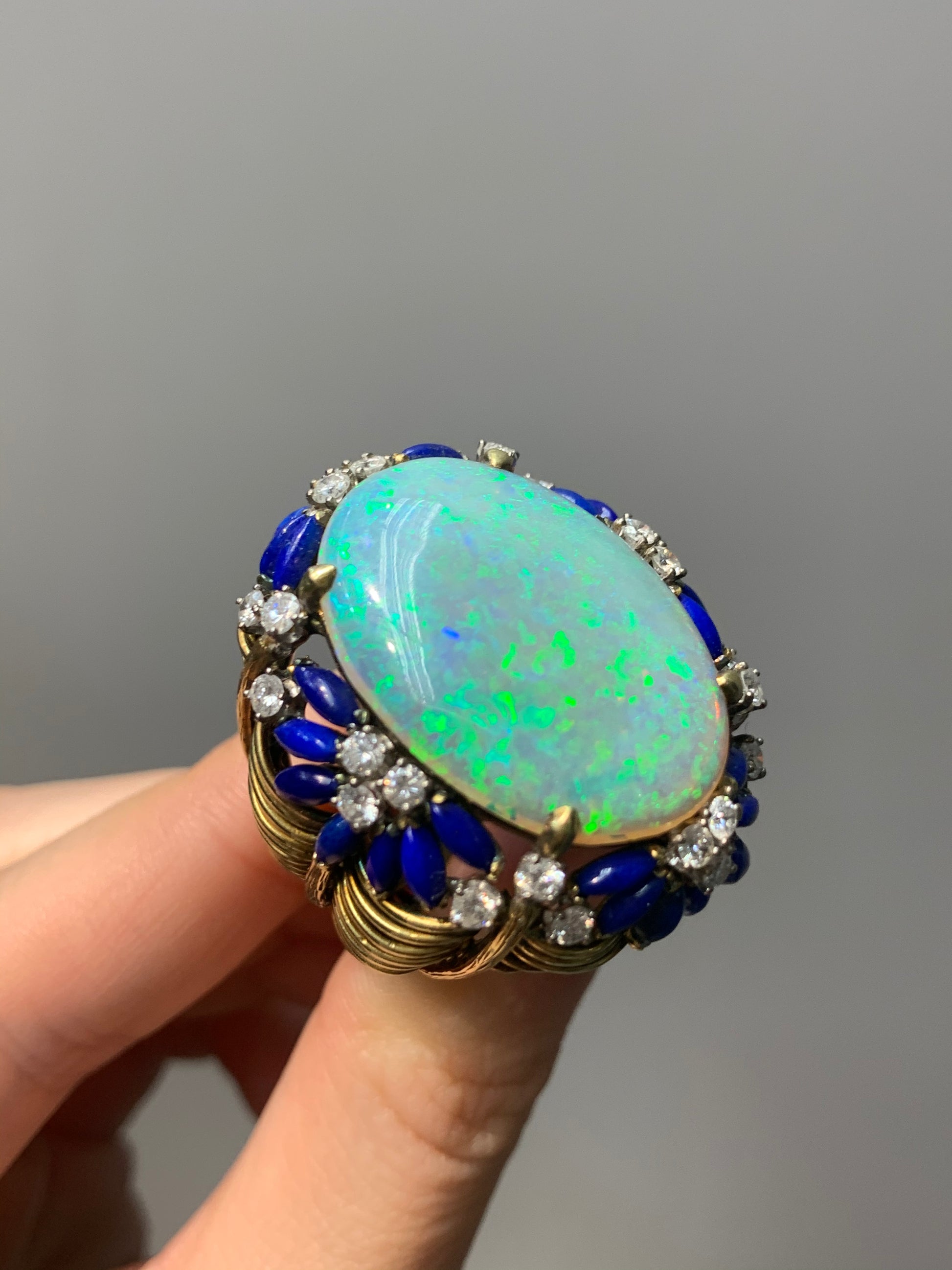 一枚华丽而迷人的复古蛋白石宝石戒指,镶有一颗天然大蛋白石凸圆形宝石。中心蛋白石从各个角度闪烁着绿蓝紫的奇异色彩。蛋白石周围镶嵌着一簇簇深蓝色钴青金石和璀璨的白钻石。真正独一无二的作品!