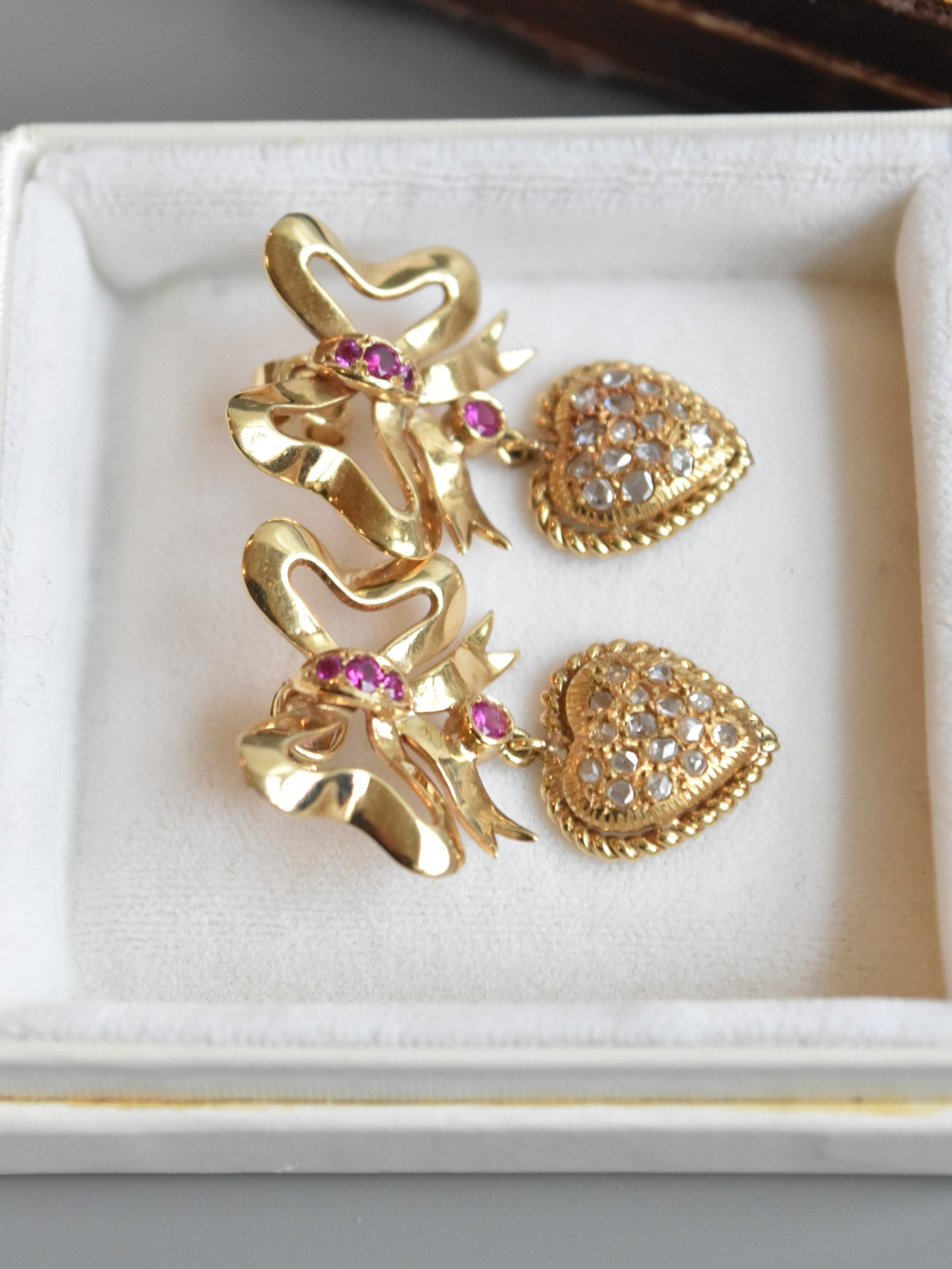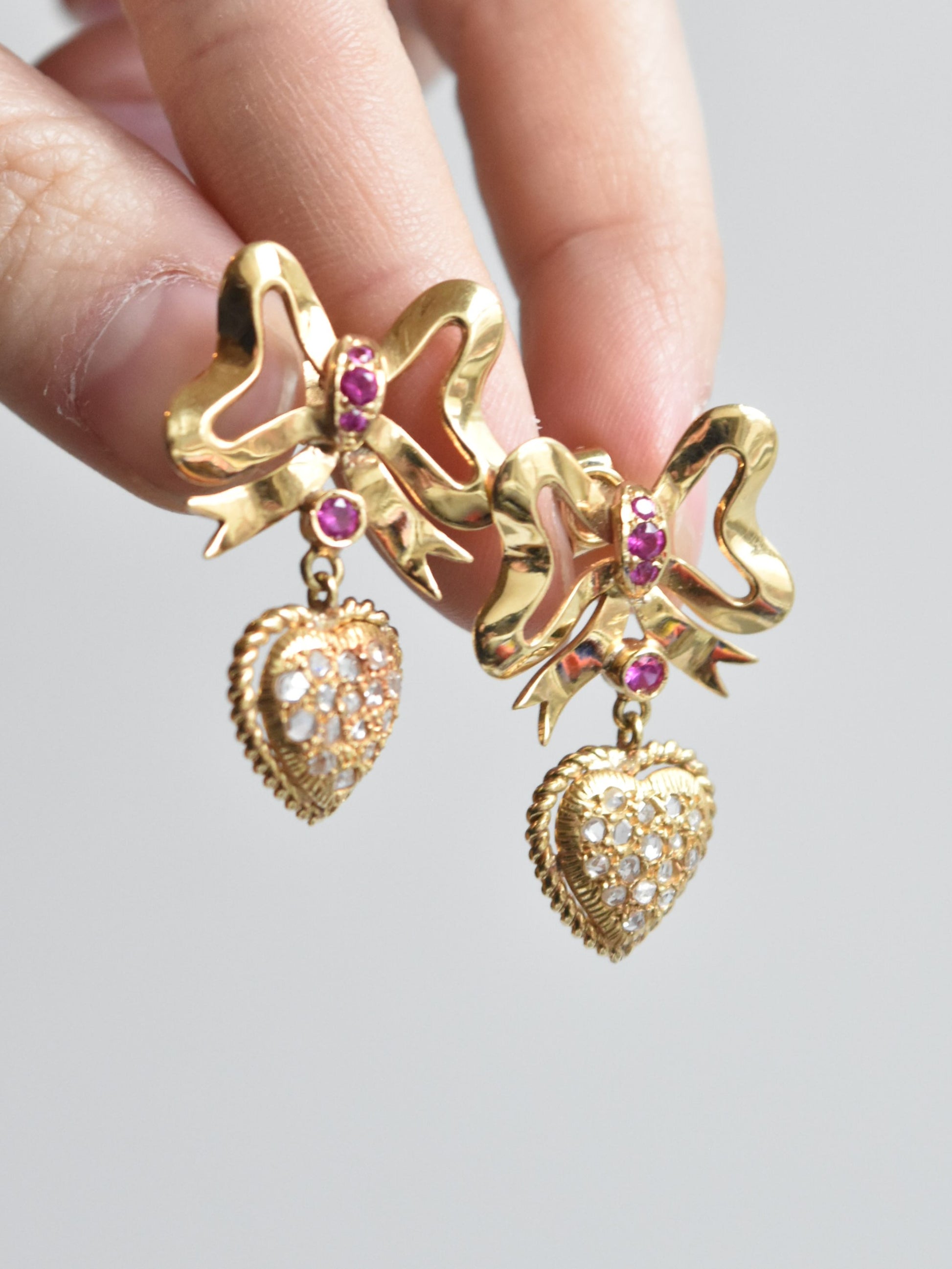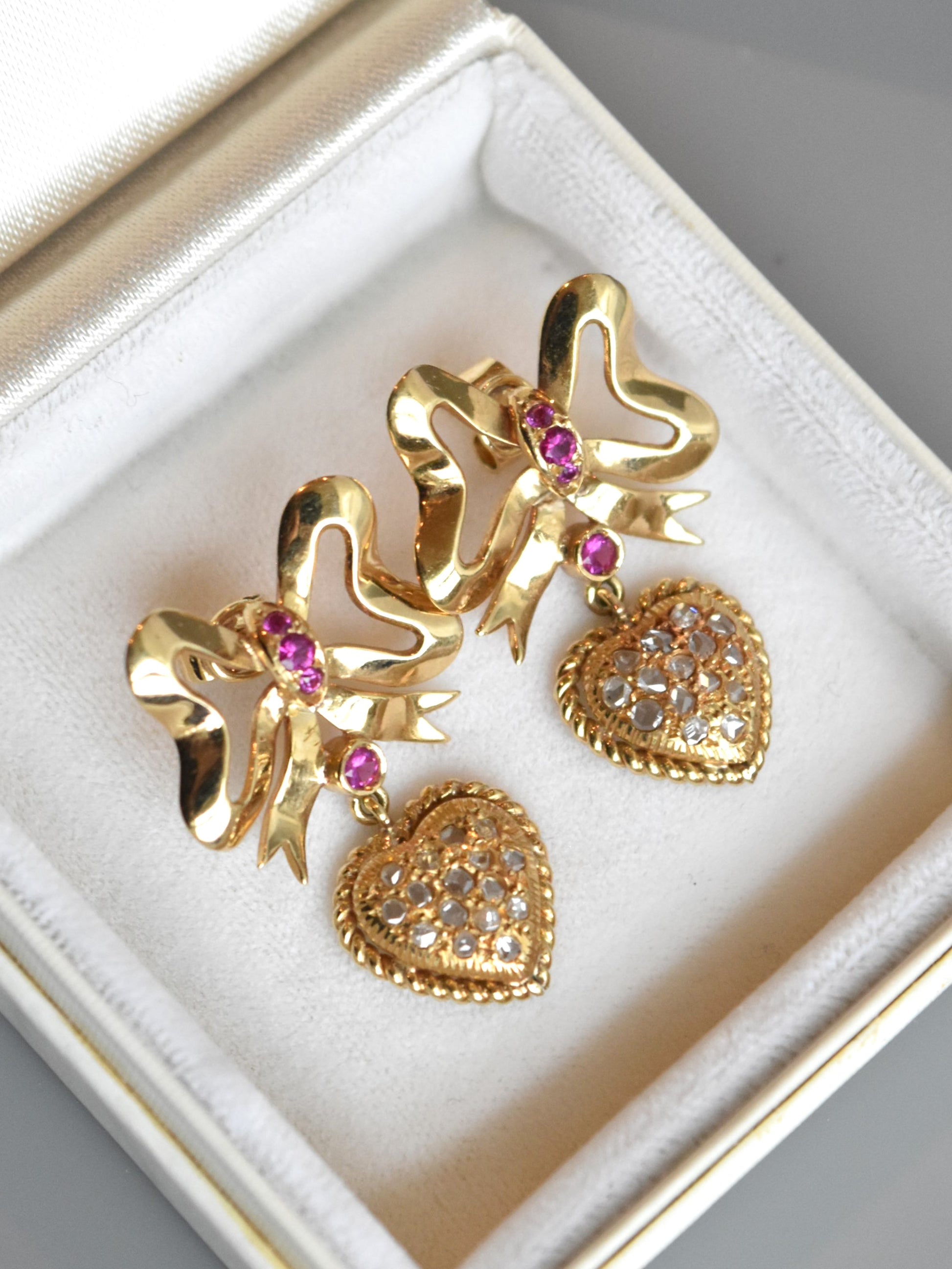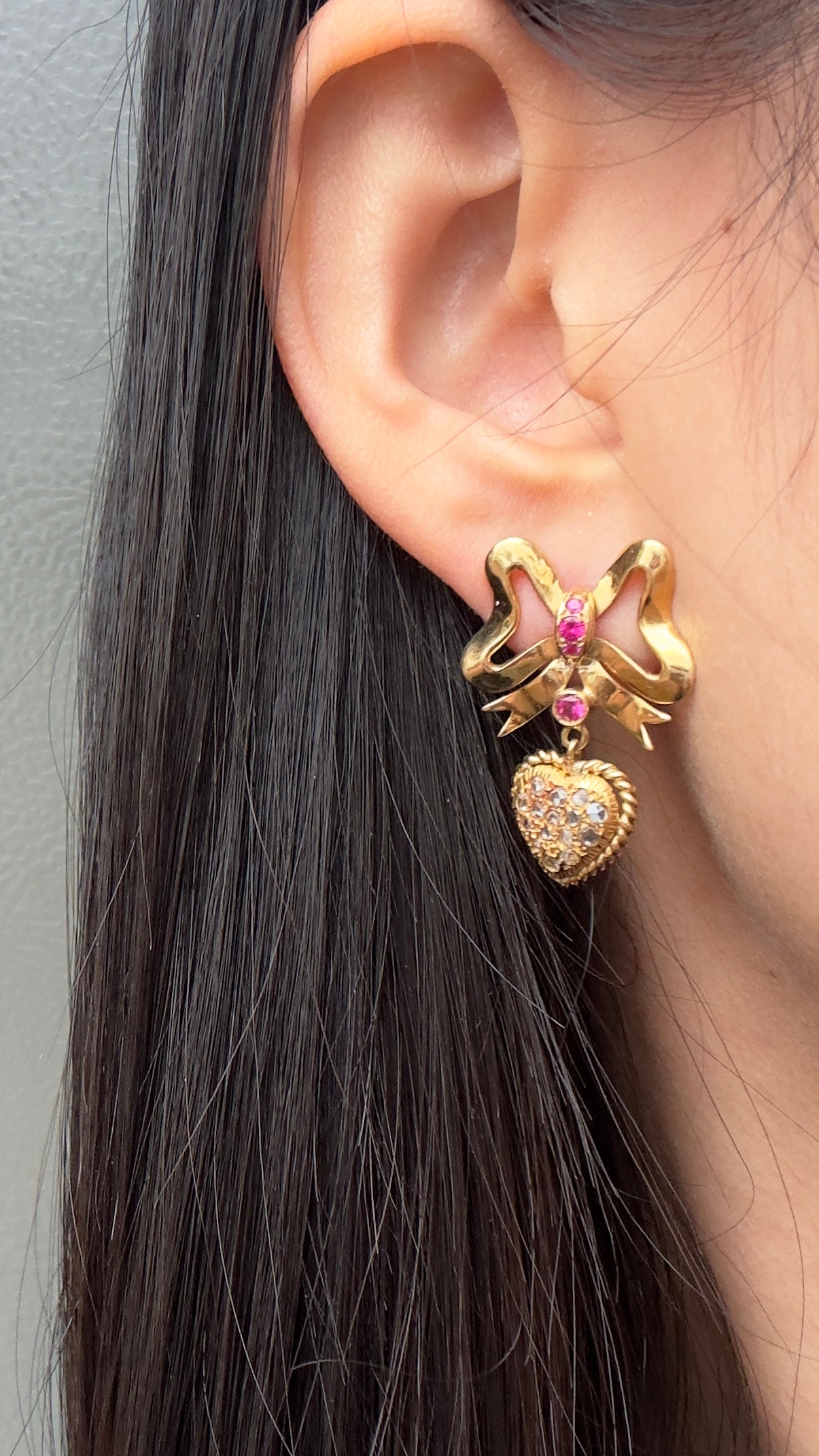 一对极其甜美的蝴蝶结和心形耳环,采用 18K 金打造,镶嵌有约 0.60 克拉的闪亮白玫瑰切割钻石和鲜艳的粉红色合成红宝石。垂下 1.5 英寸,宽度为 0.9 英寸。