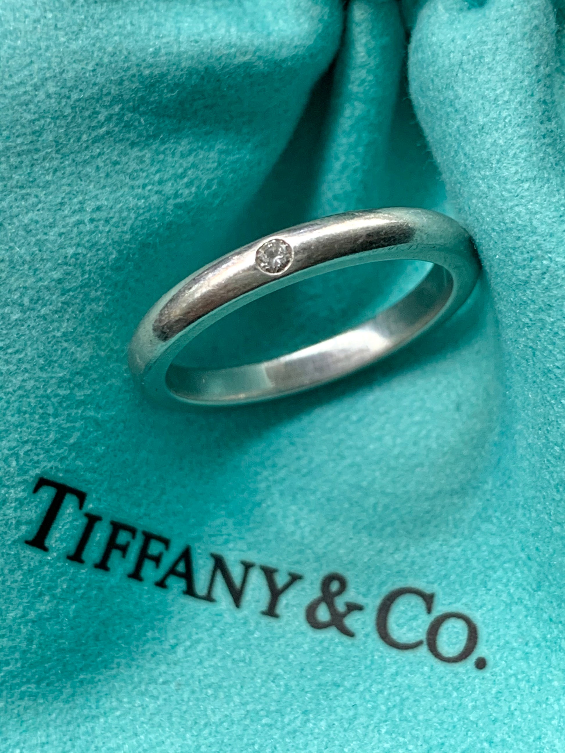 非常适合叠戴,单独佩戴也十分优雅。这款 Tiffany & Co. 戒指上镶有一颗 0.02 克拉的铂金圆形明亮钻石。随附 Tiffany & Co. 包。