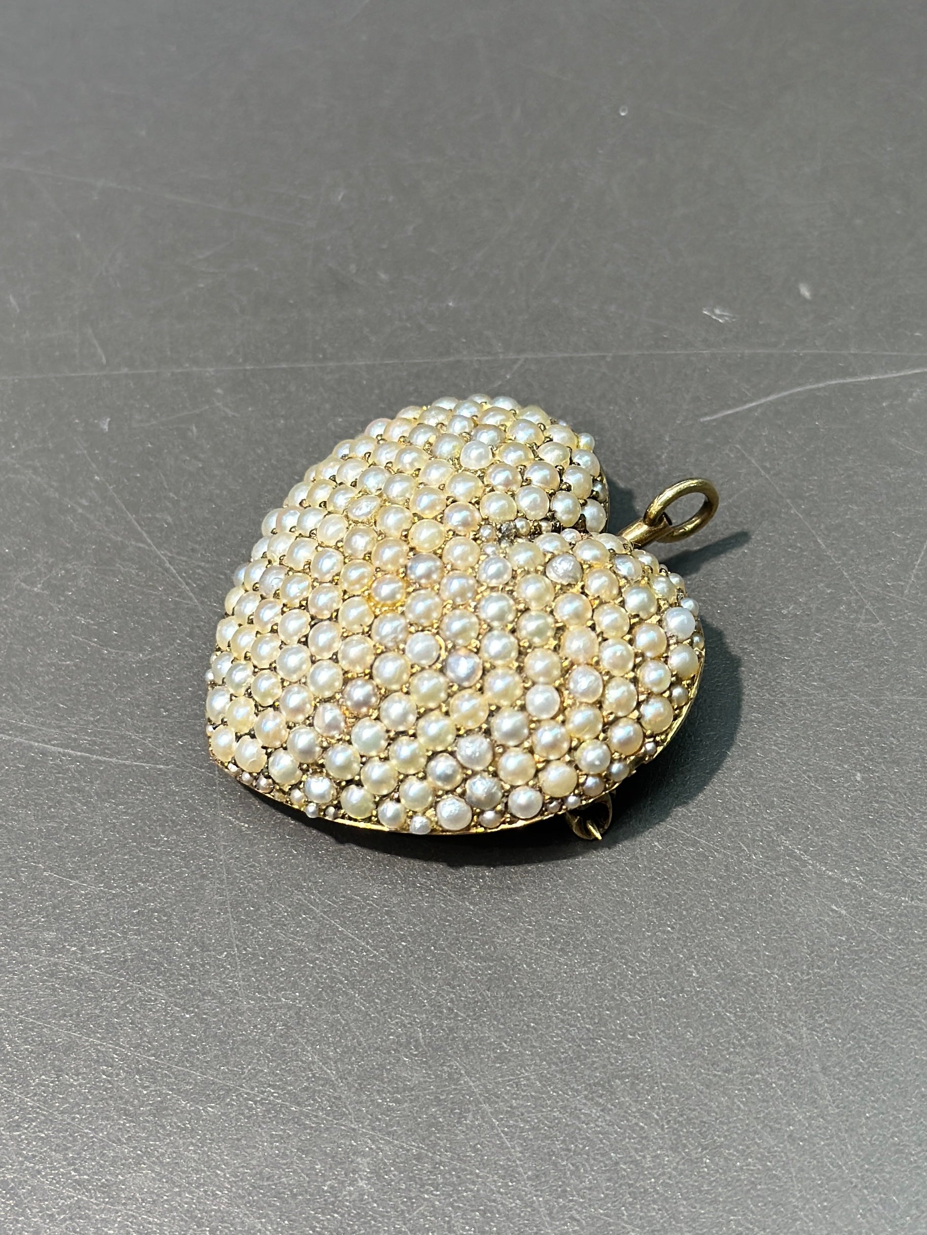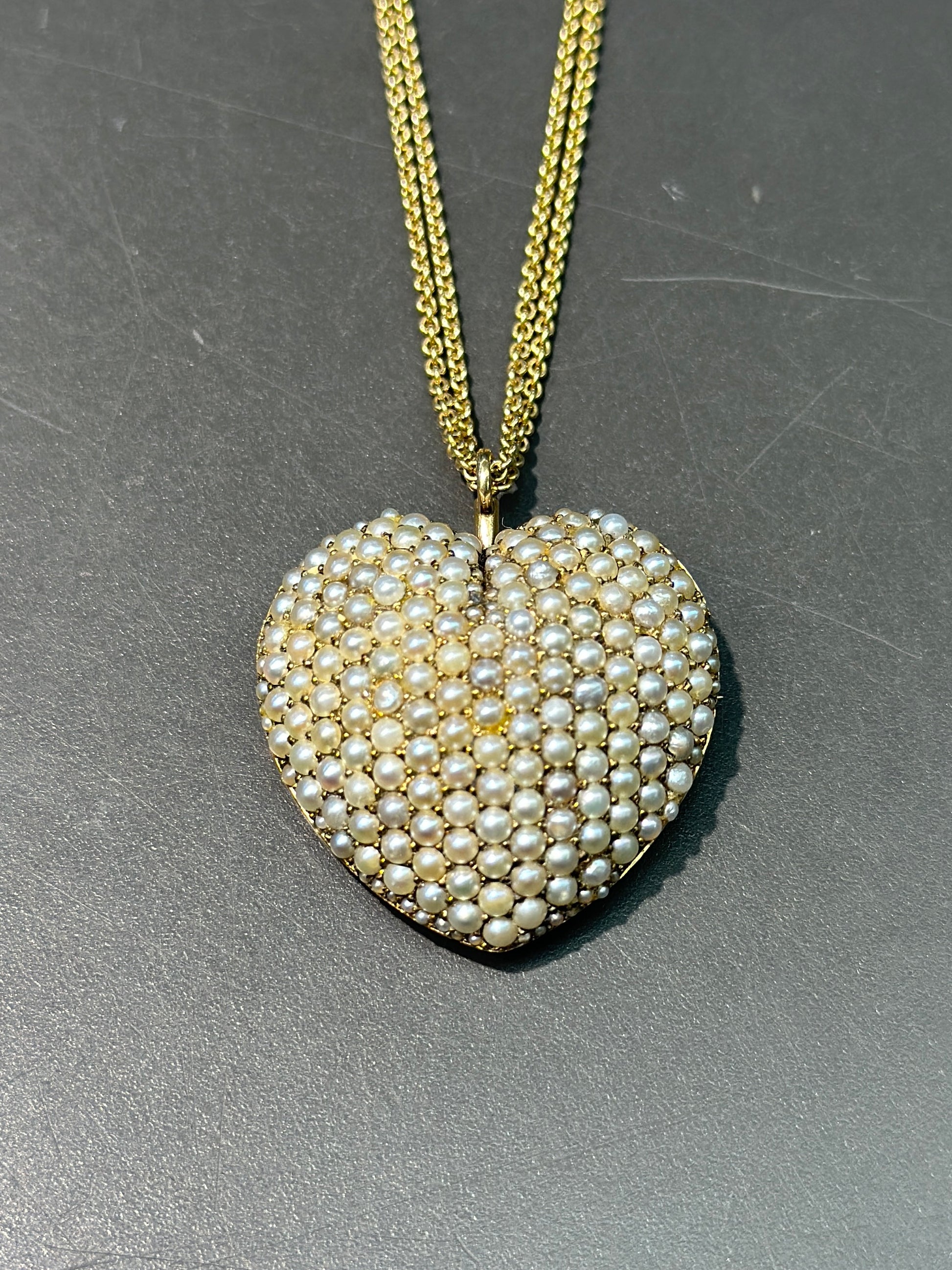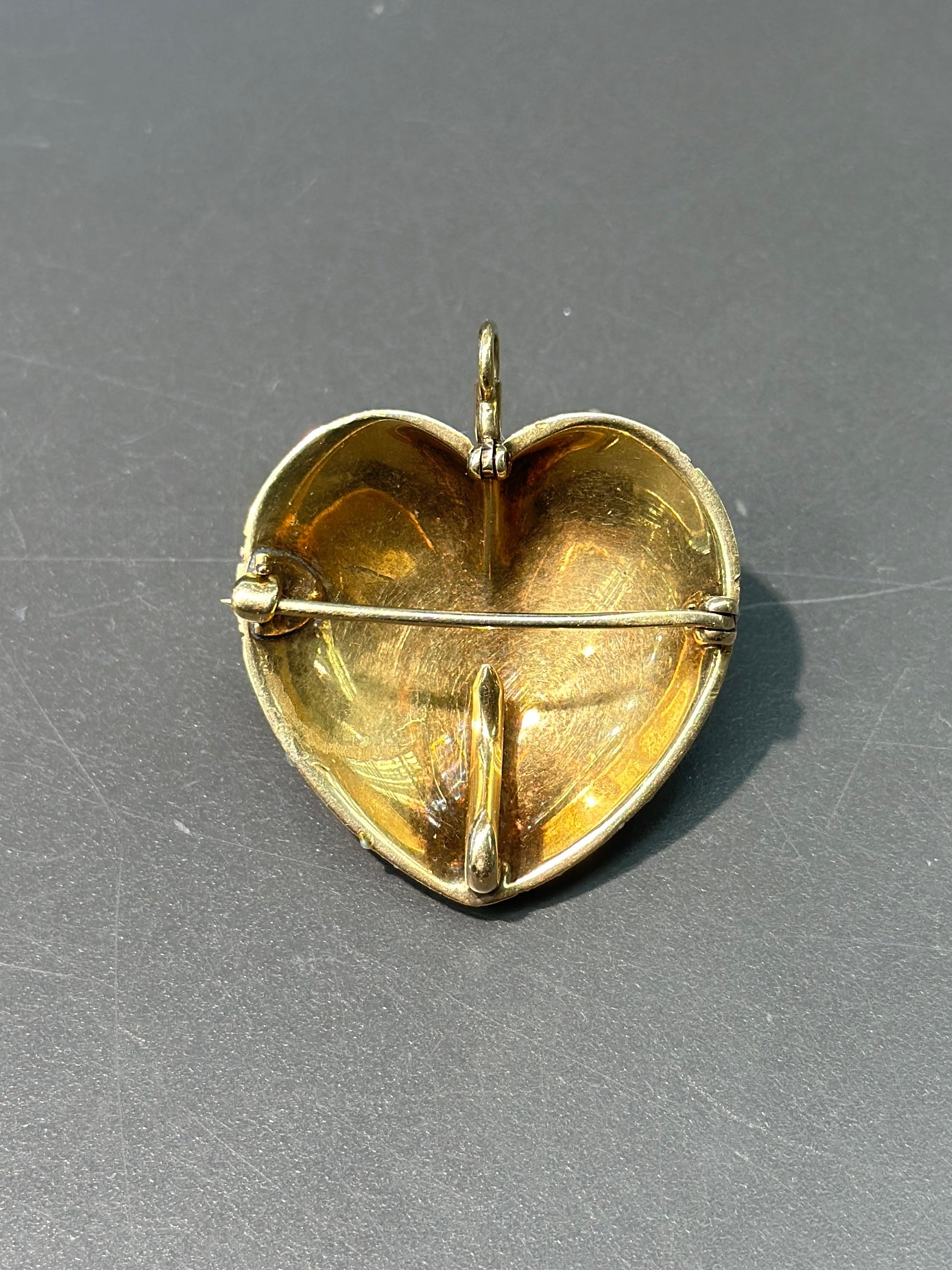迷人的古董心形吊坠/胸针,可追溯至 20 世纪初,饰有乳白色珍珠。采用 14K 金手工制作。