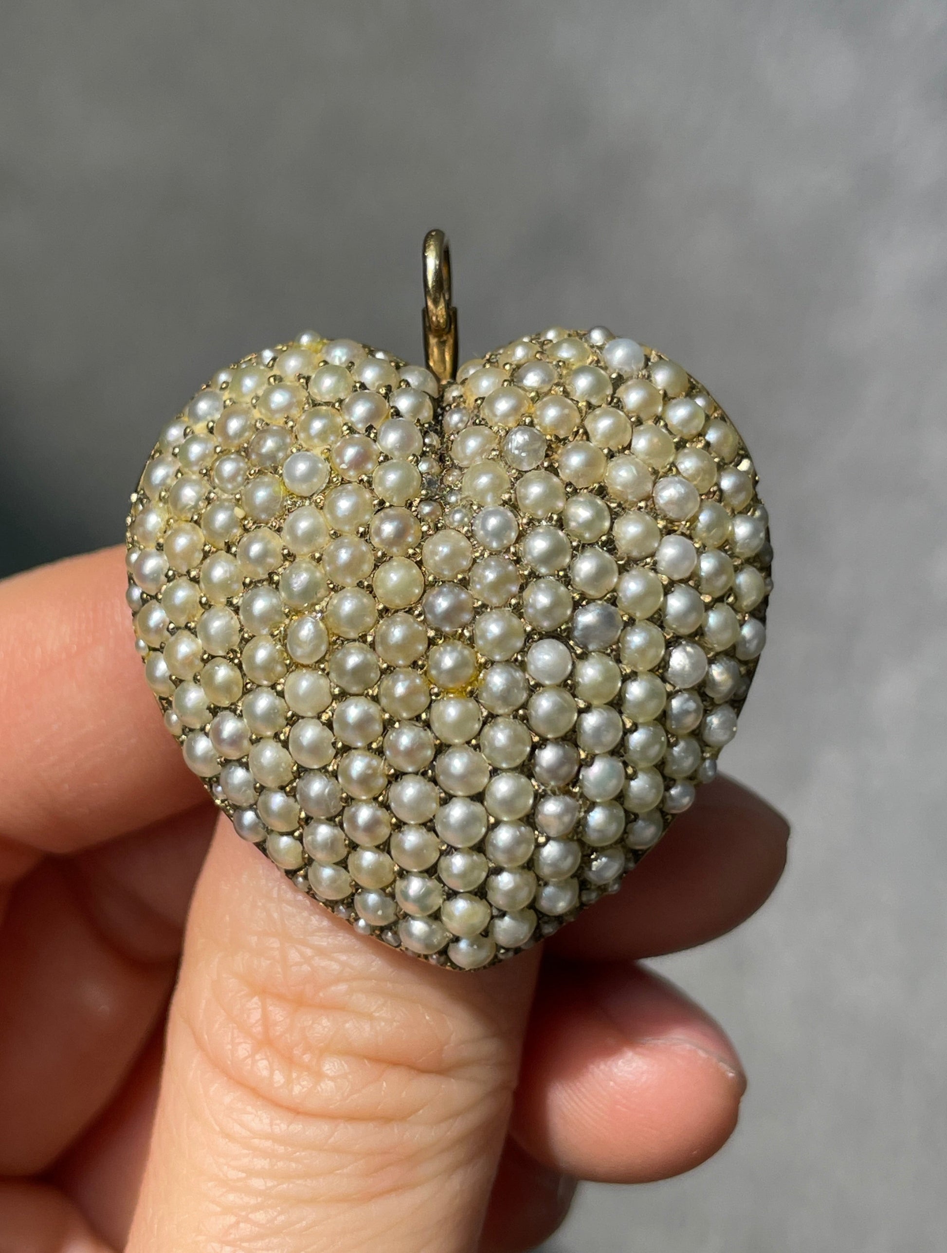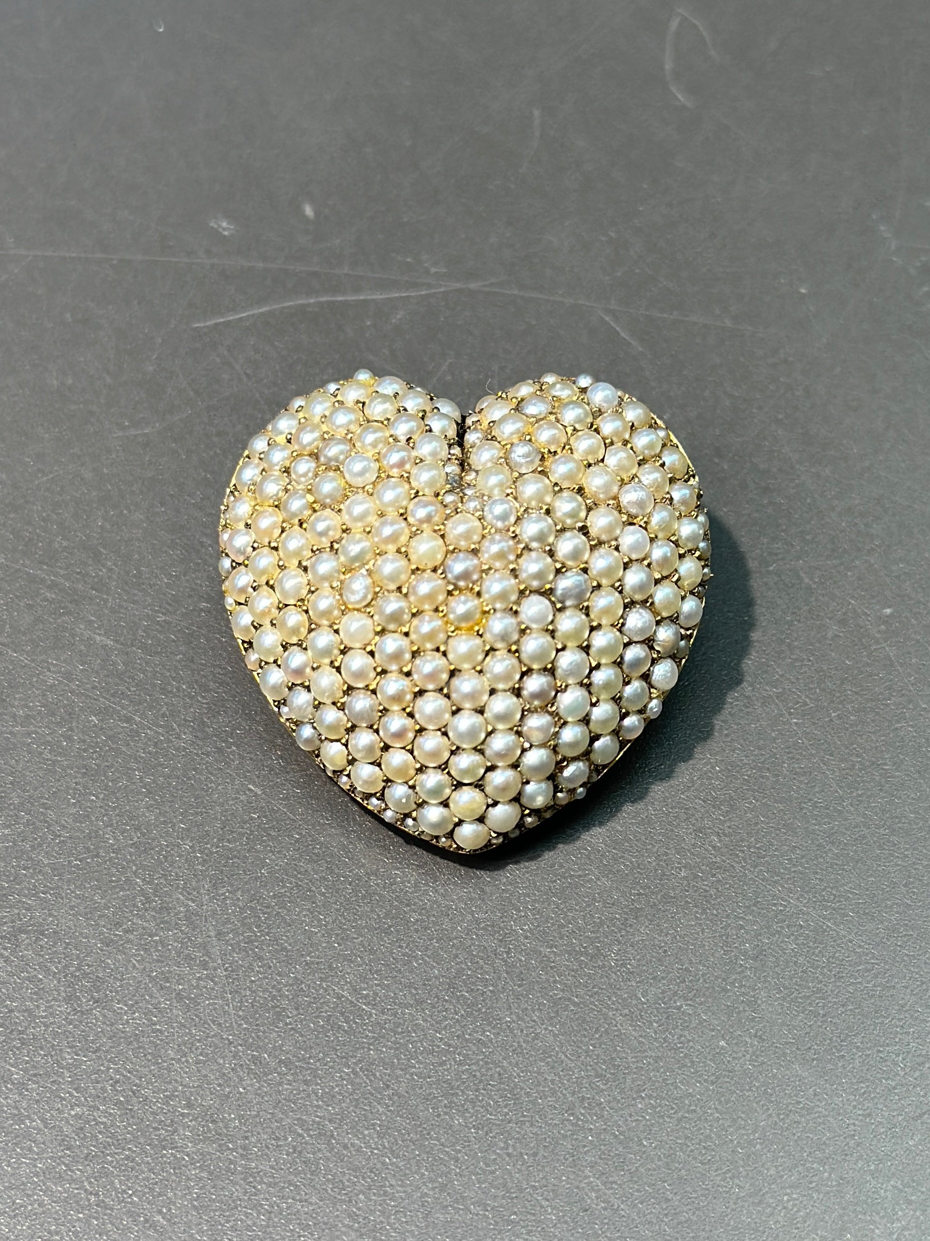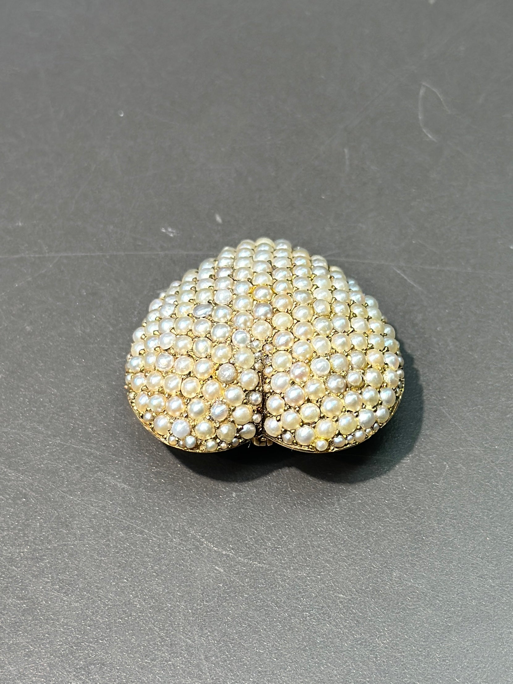 迷人的古董心形吊坠/胸针,可追溯至 20 世纪初,饰有乳白色珍珠。采用 14K 金手工制作。