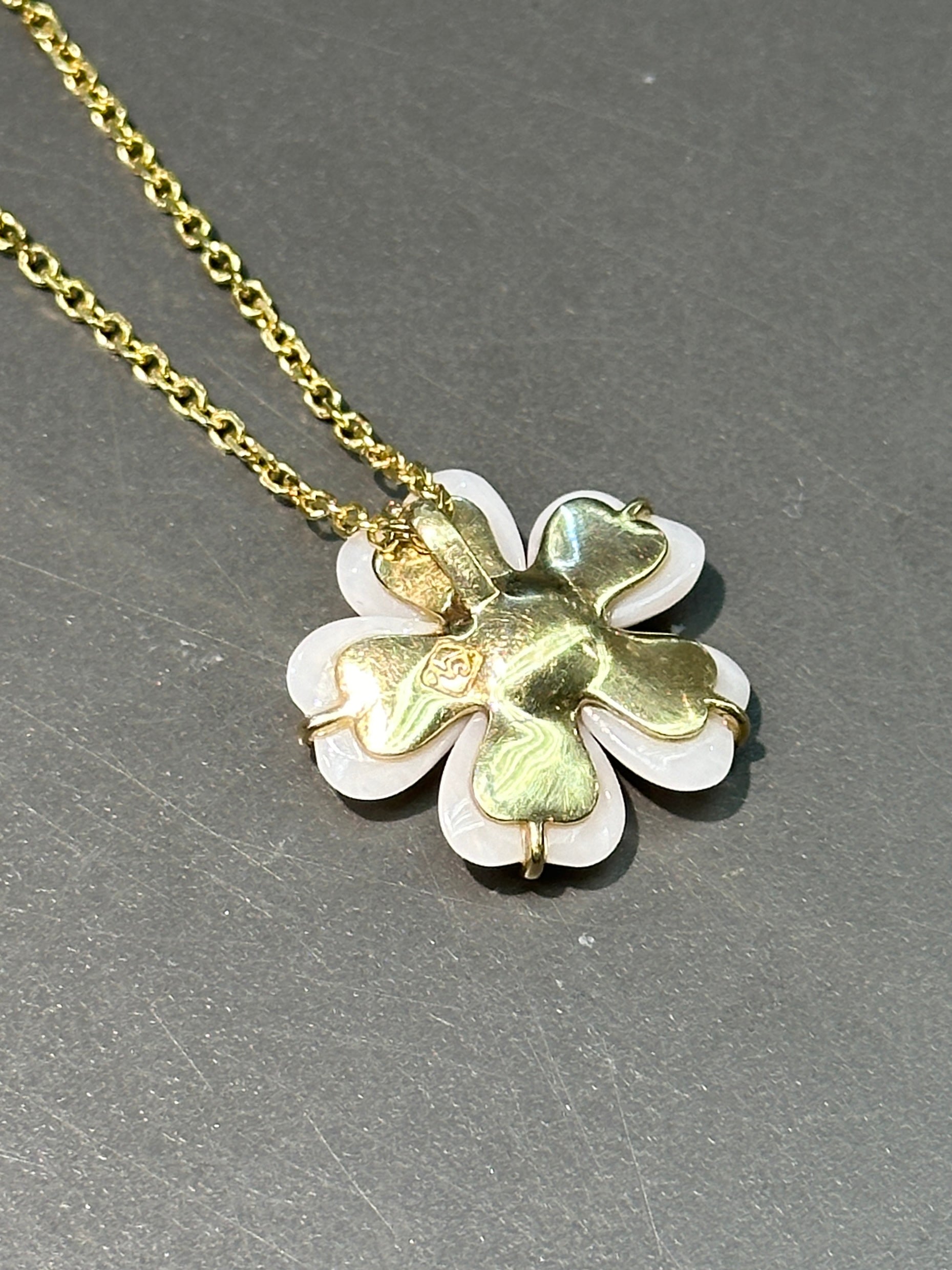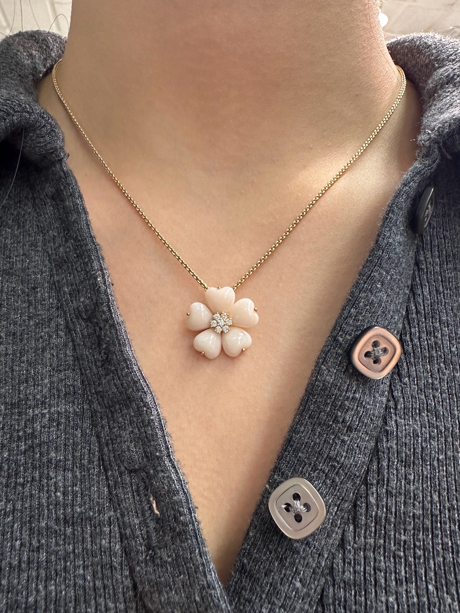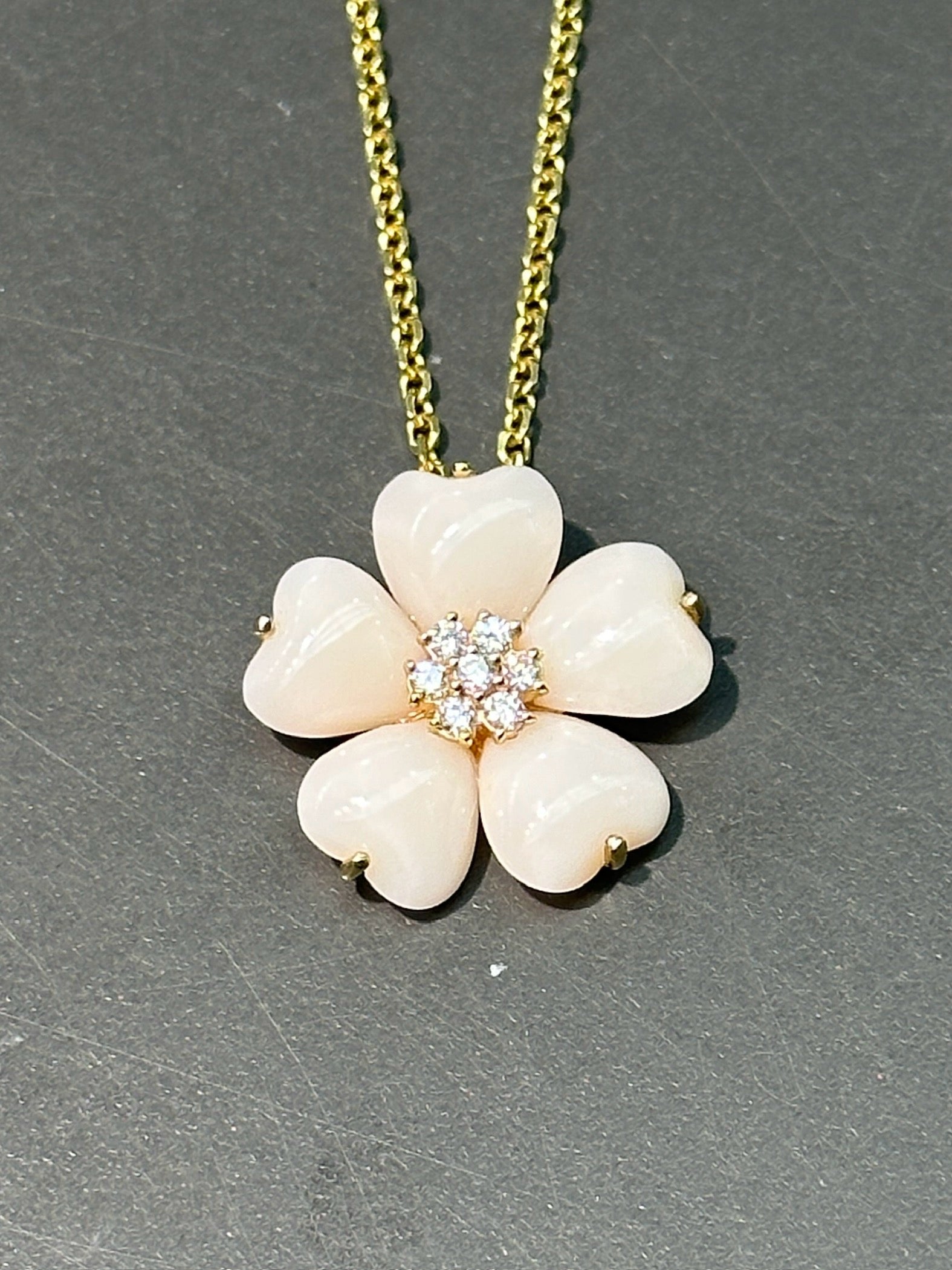 令人惊艳的珊瑚花吊坠由 5 颗淡粉色天使皮珊瑚心组成,中间点缀着一簇闪闪发光的白色钻石。采用 14K 黄金打造。