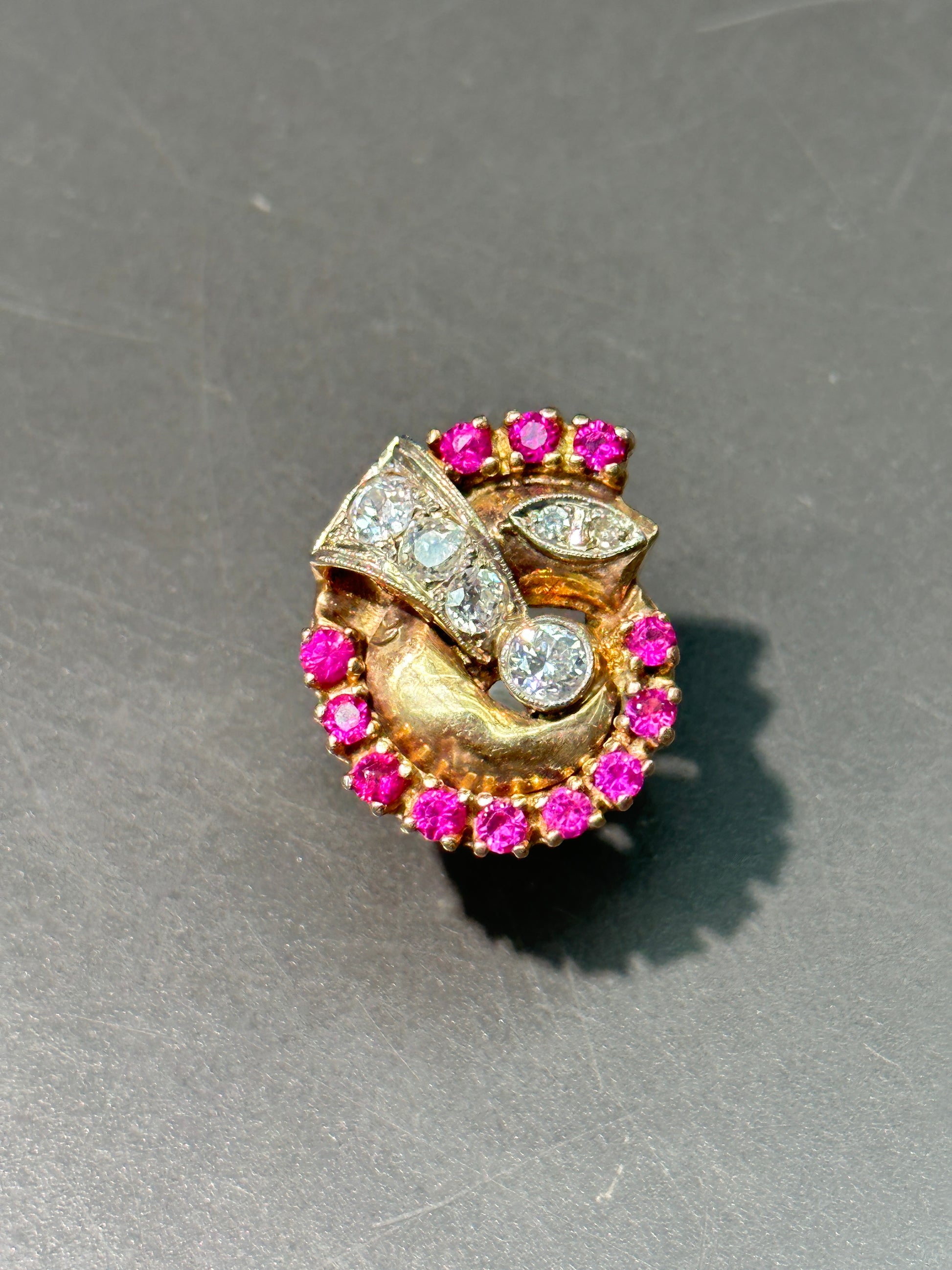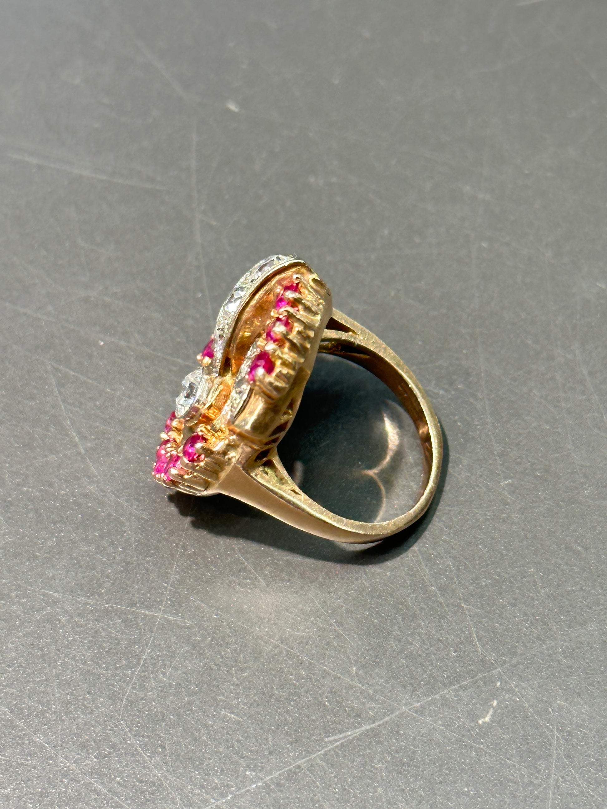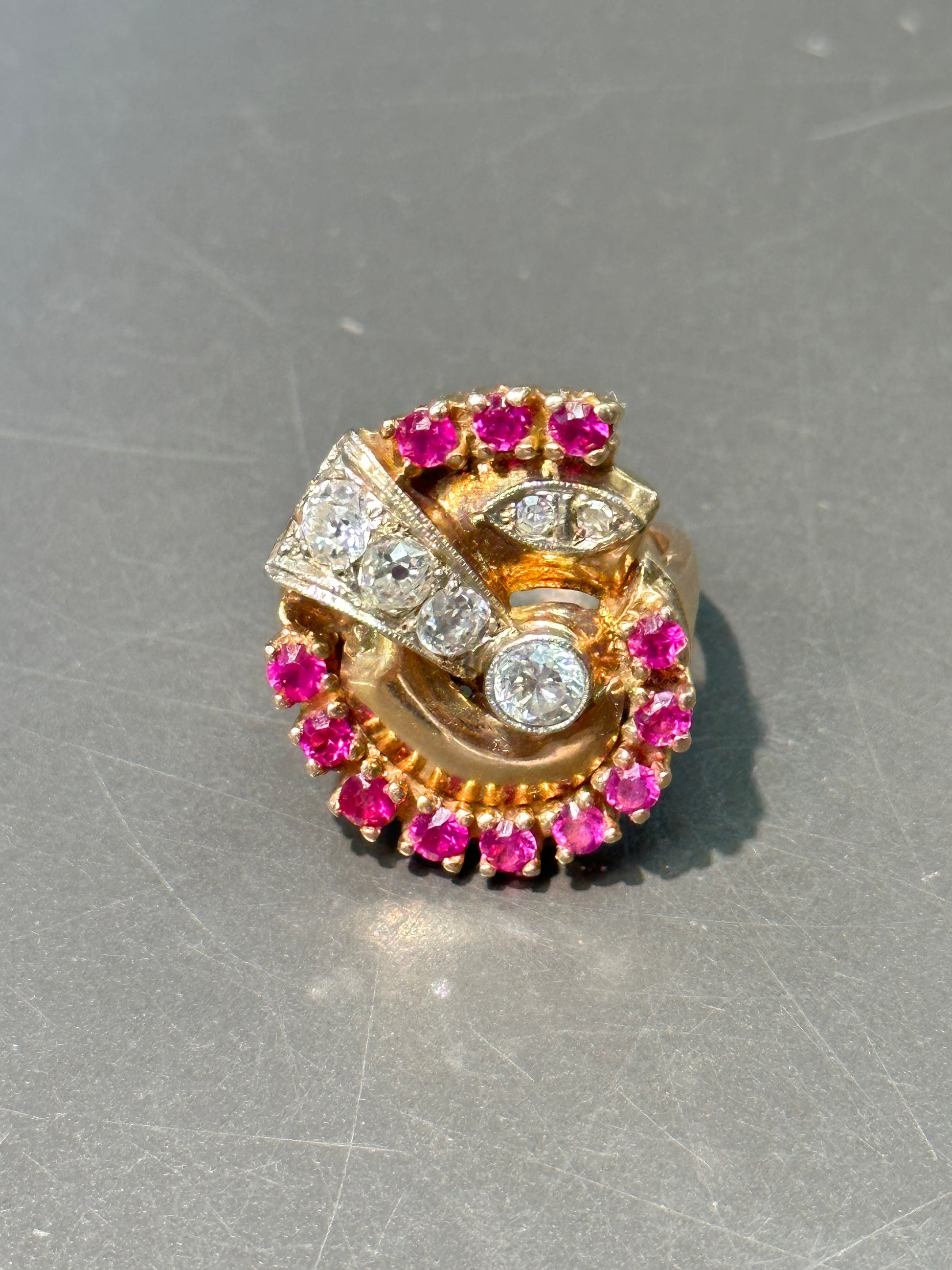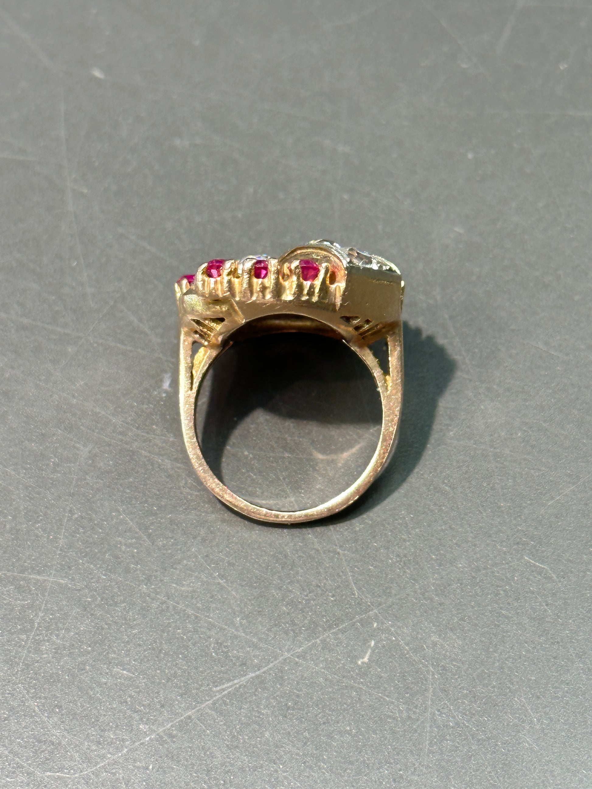一枚迷人的复古时代坦克戒指,周围镶嵌着鲜艳的粉红色红宝石和 1.55 克拉闪闪发光的白色大块欧洲切割钻石。设计精美,铂金镶嵌在闪闪发光的 14K 玫瑰金上。目前尺寸为 6。