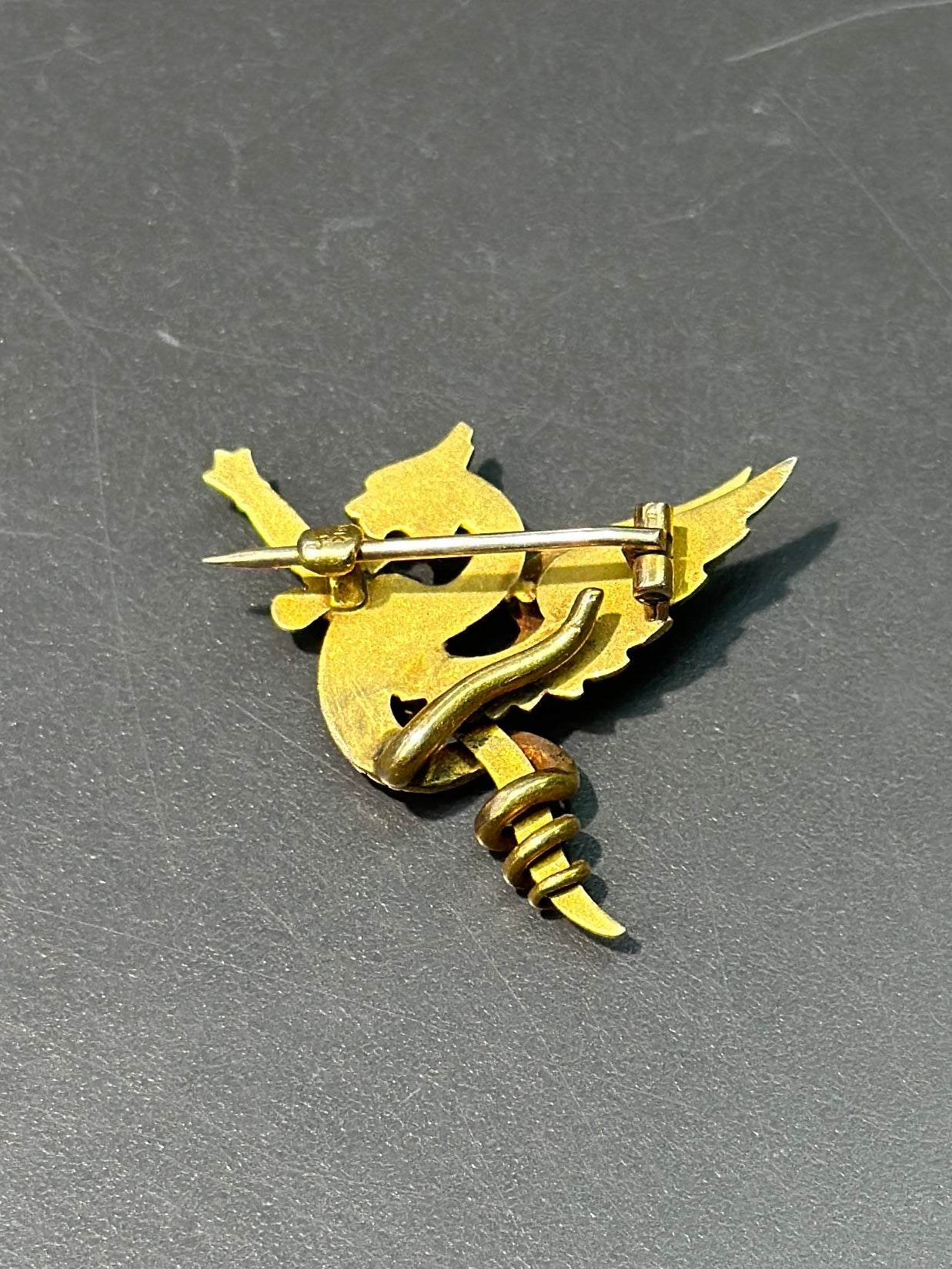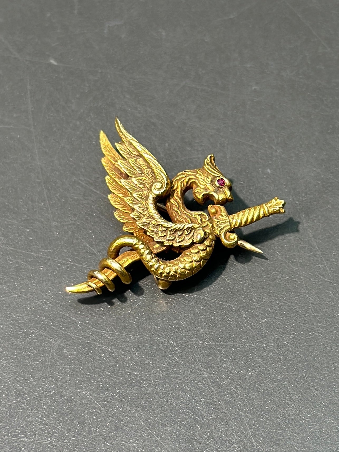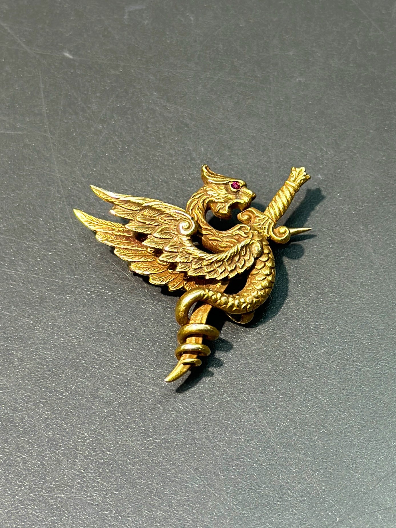 可追溯到 20 世纪初,一枚异想天开的 Rikers Bros. 狮鹫胸针,饰有红宝石眼睛,手持宝剑。采用 14K 黄金精心雕刻而成。