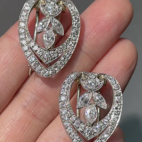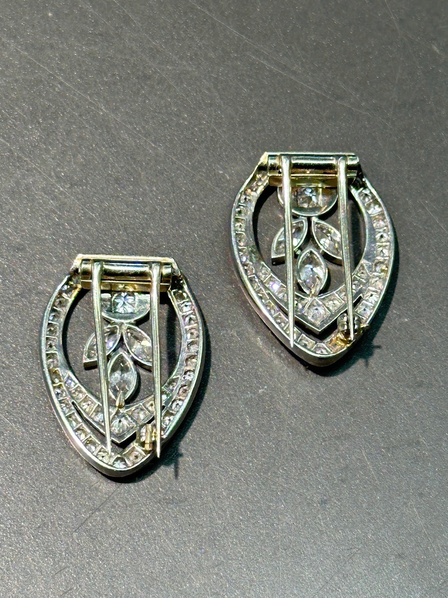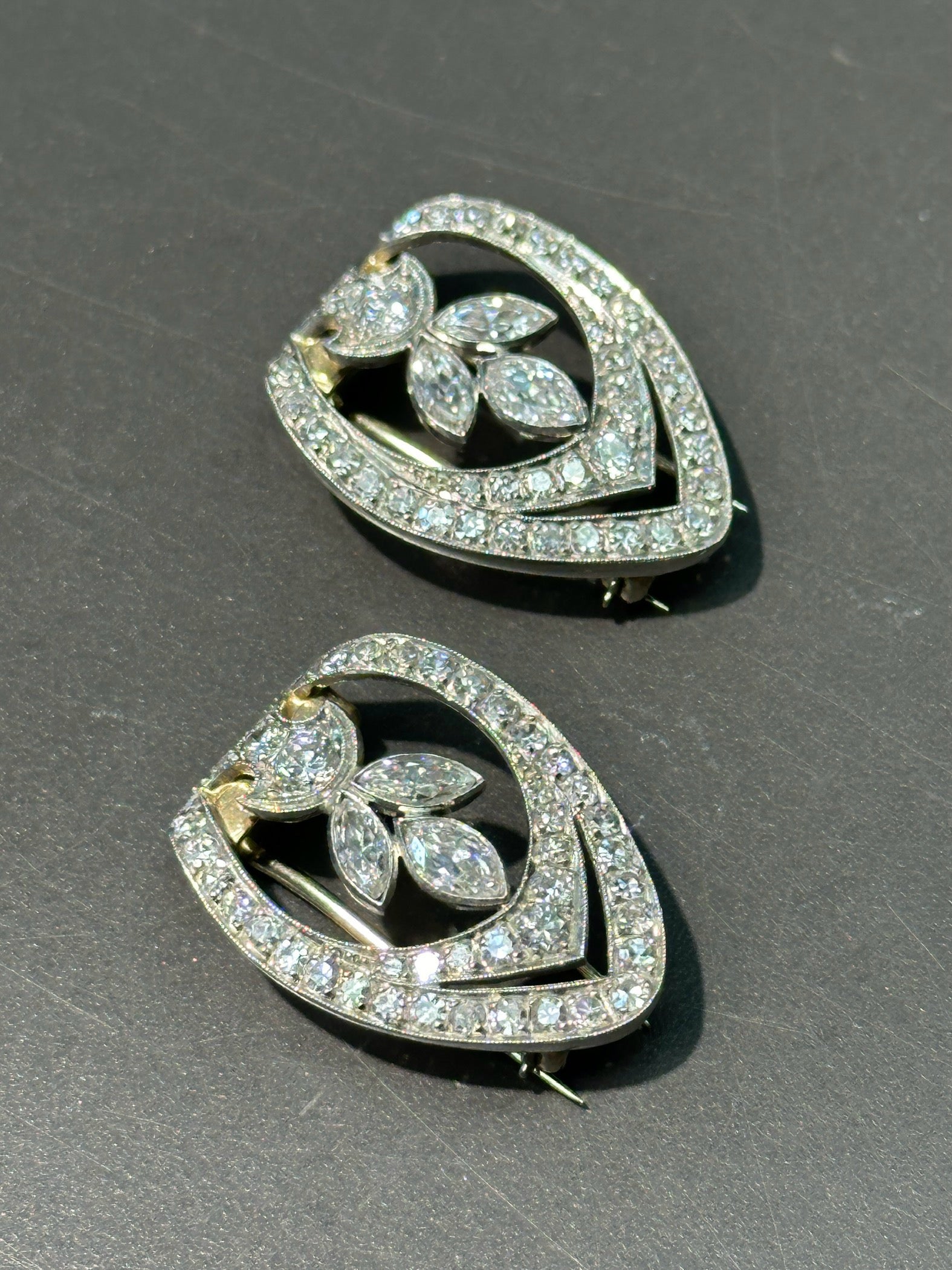 这对双夹式胸针可追溯到装饰艺术时期,由铂金制成,令人惊艳夺目。它镶嵌着一颗 3.6 克拉的冰白色闪亮马眼形钻石和老式欧洲切割钻石,闪耀夺目。