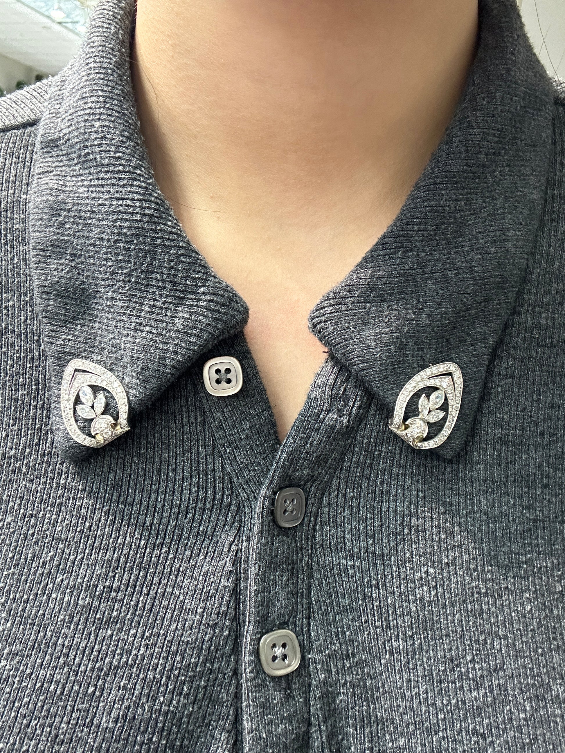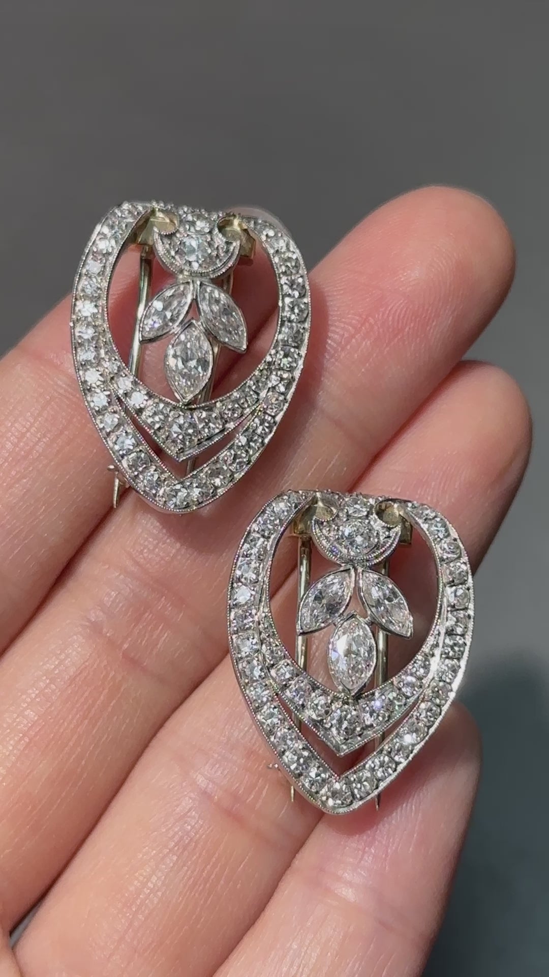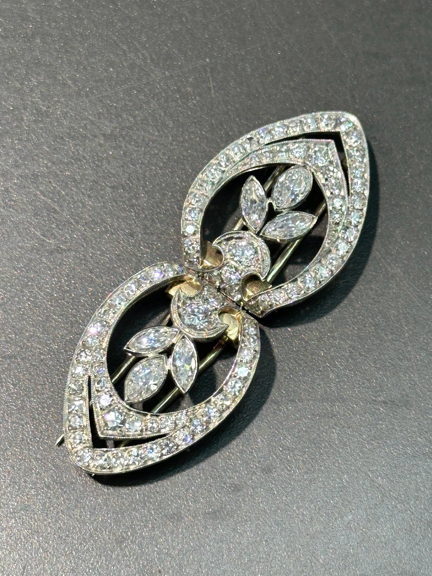 这对双夹式胸针可追溯到装饰艺术时期,由铂金制成,令人惊艳夺目。它镶嵌着一颗 3.6 克拉的冰白色闪亮马眼形钻石和老式欧洲切割钻石,闪耀夺目。
