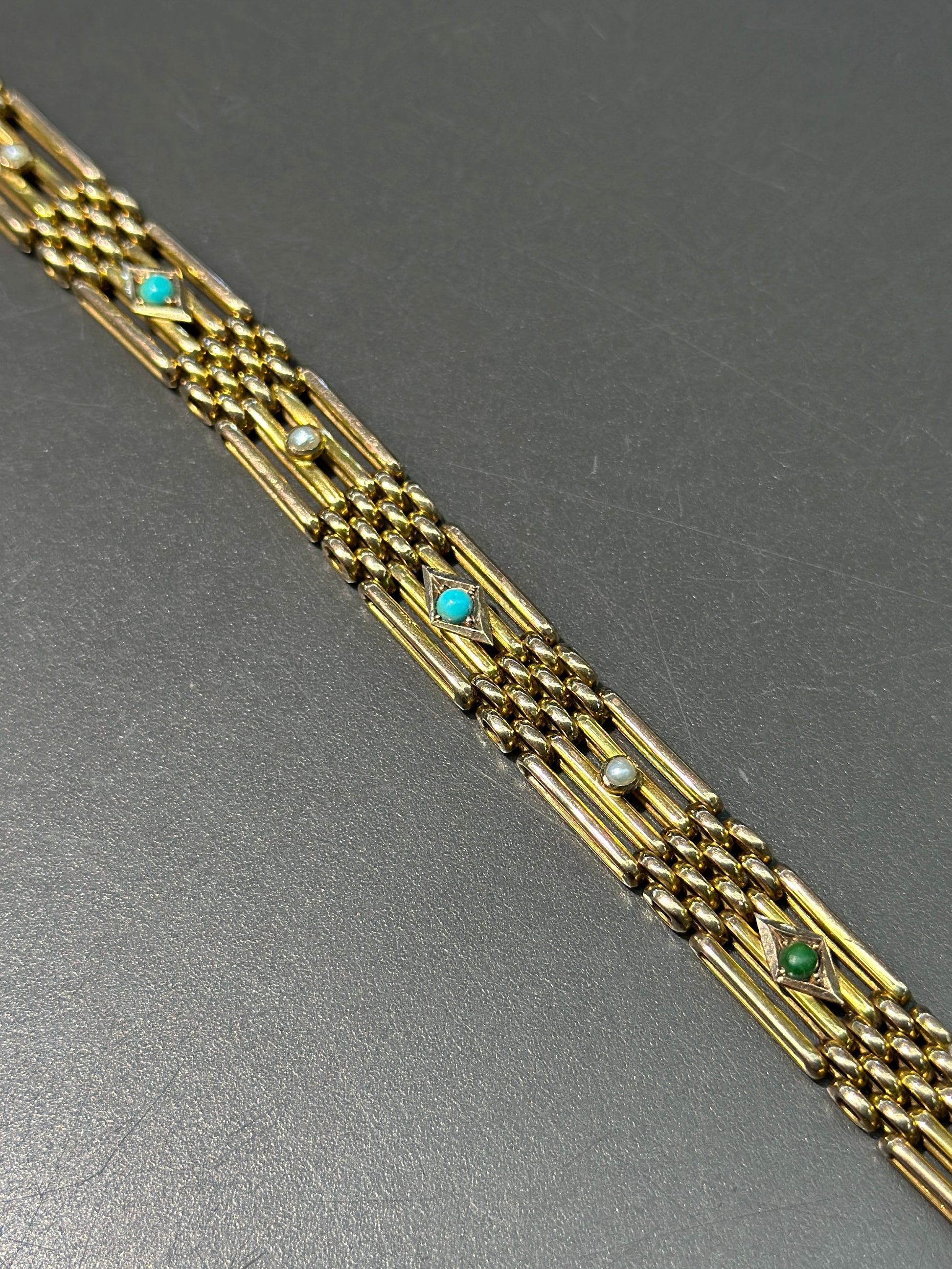 维多利亚风格的门环手链采用 9K 金精心打造,饰有光泽的白色珍珠和绿松石。配有挂锁和安全扣。