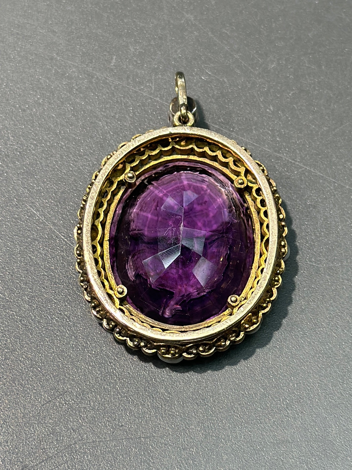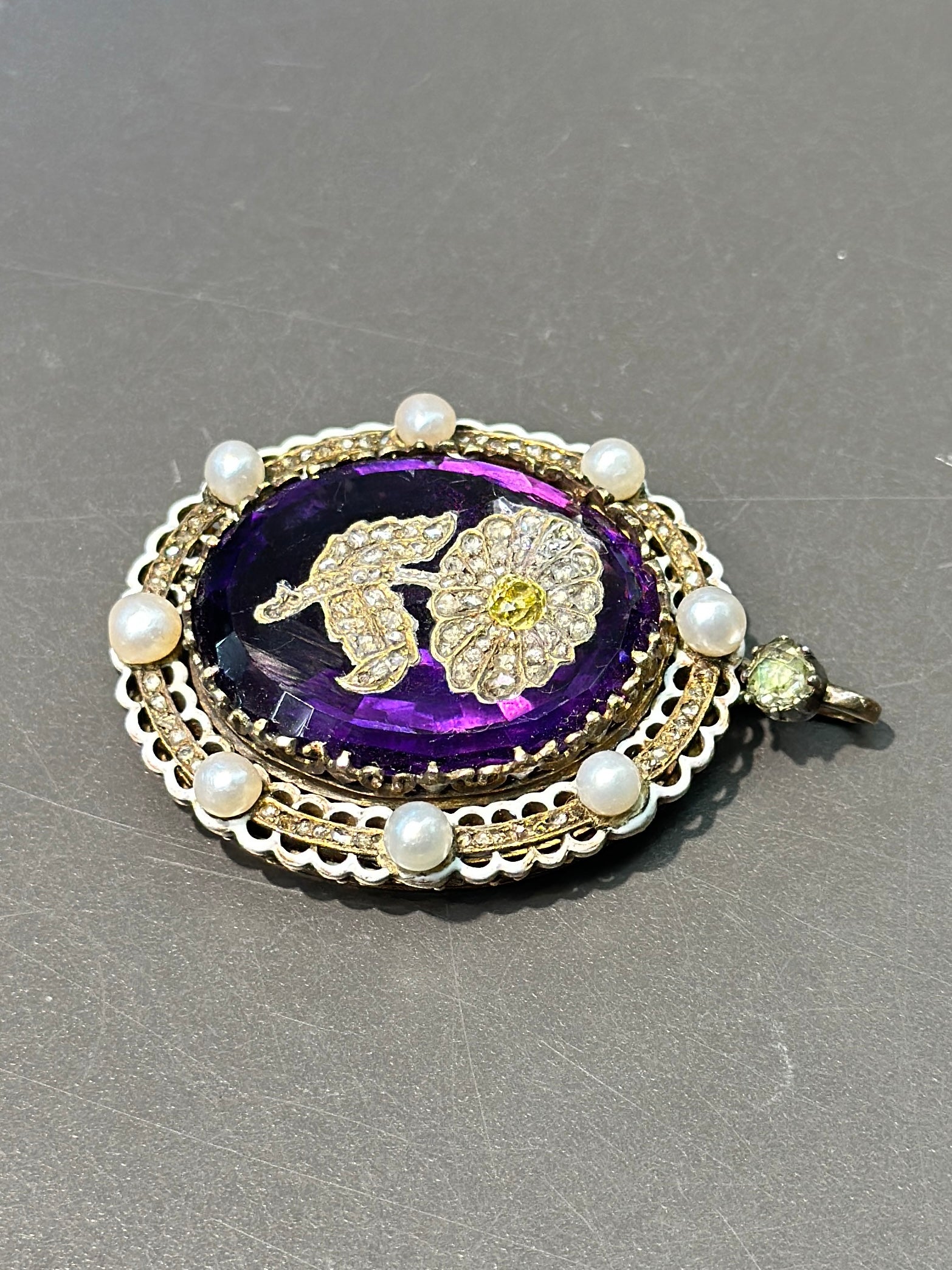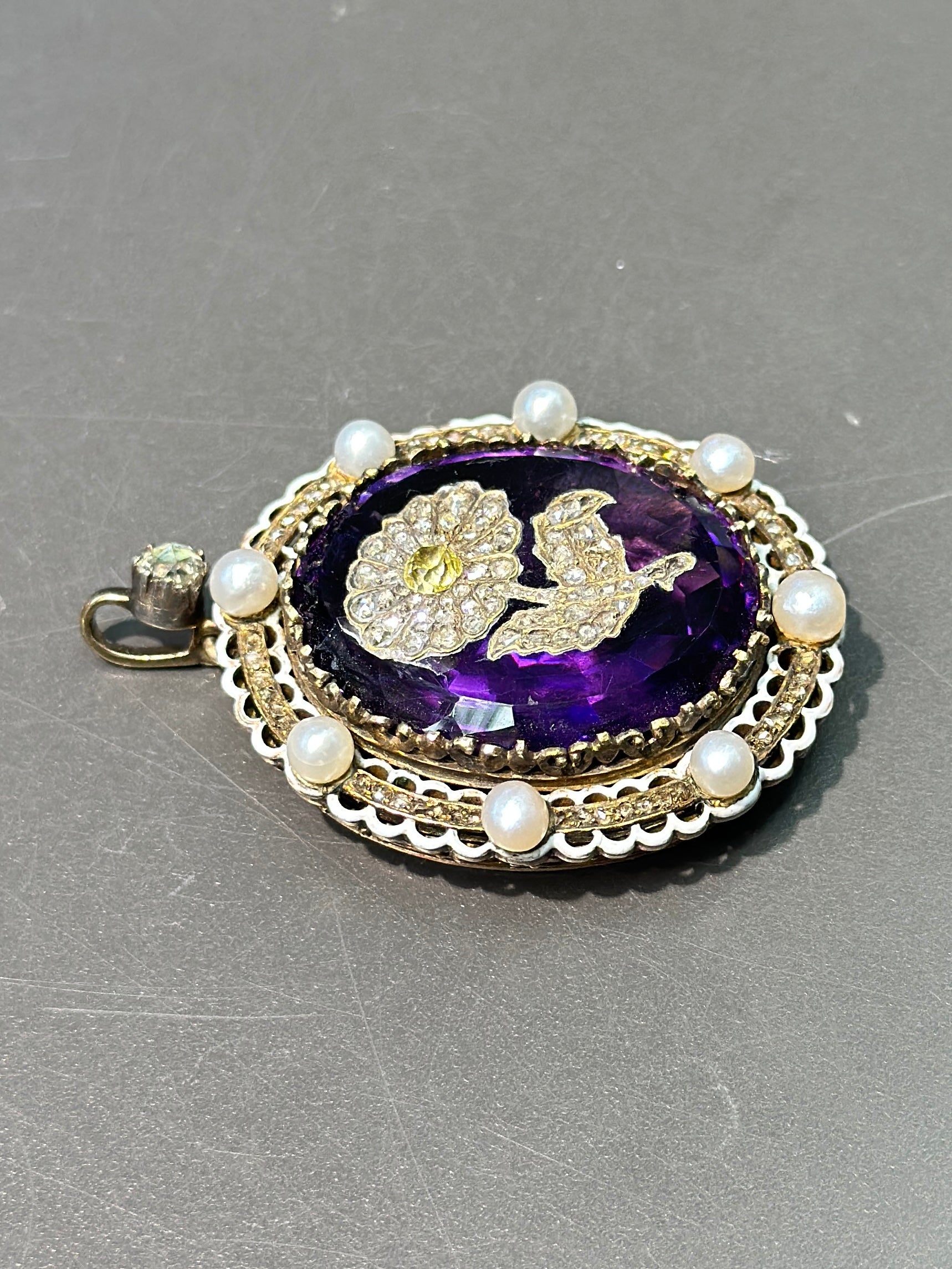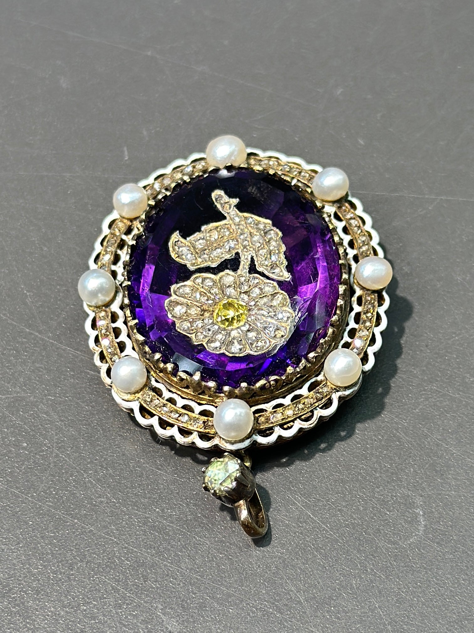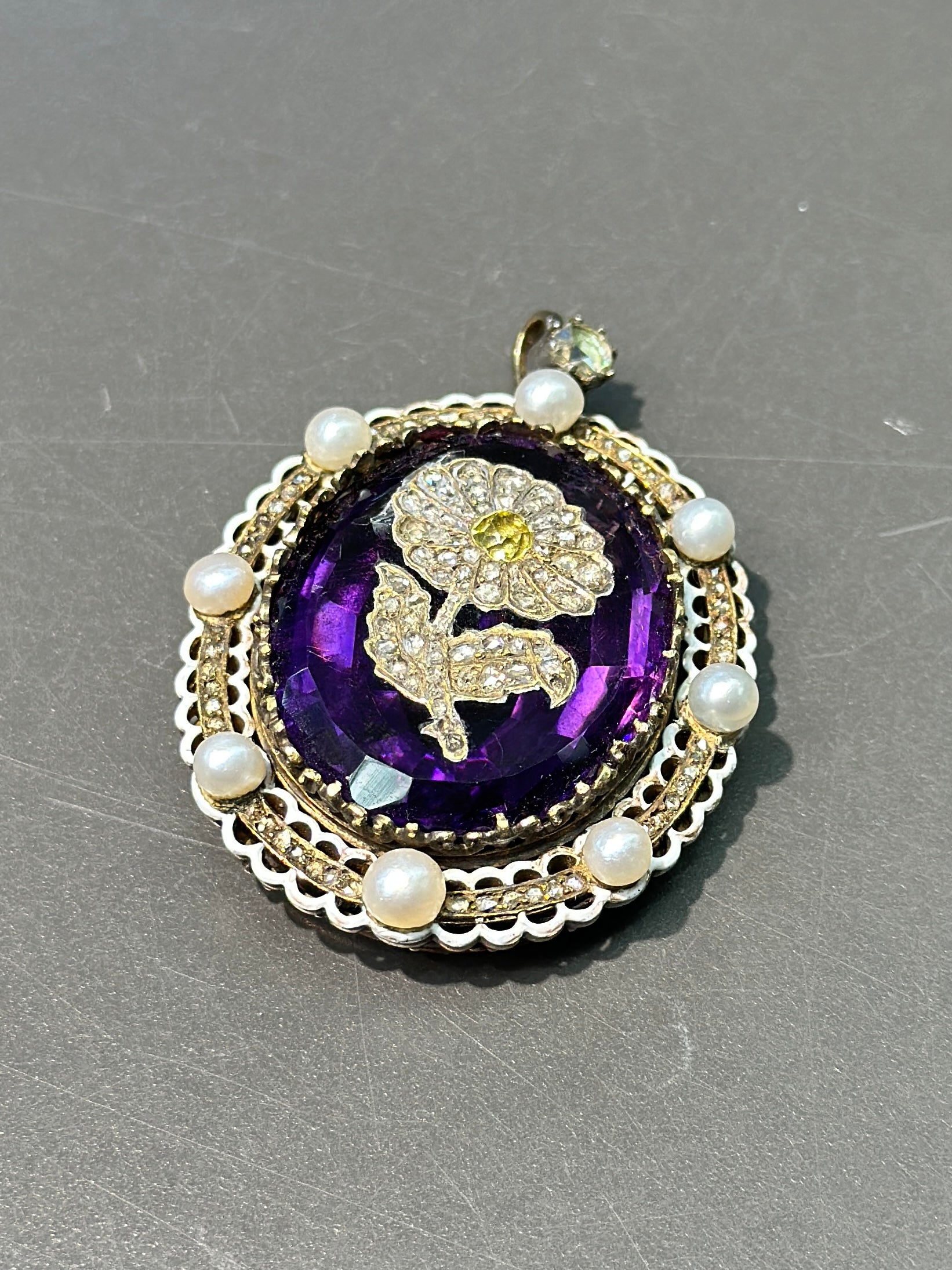 一款神奇而又异想天开的维多利亚风格吊坠,以一颗闪闪发光的多面紫水晶为中心,镶有一颗盛开的日光,日光下镶嵌着闪闪发光的玫瑰切割钻石。饰有白色珐琅,周围镶嵌着天然海水珍珠。