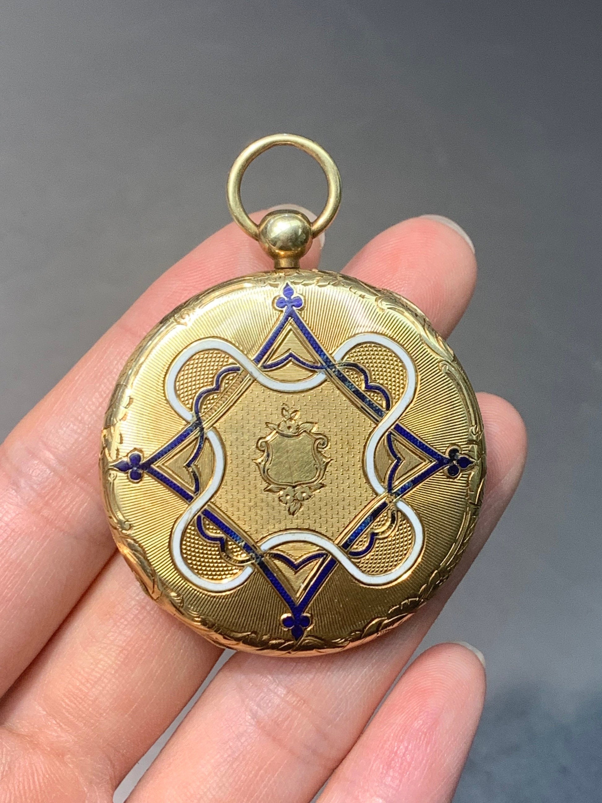 这款项链的两面均采用珐琅制成,以 14K 金精心打造,带有复杂的花卉图案。