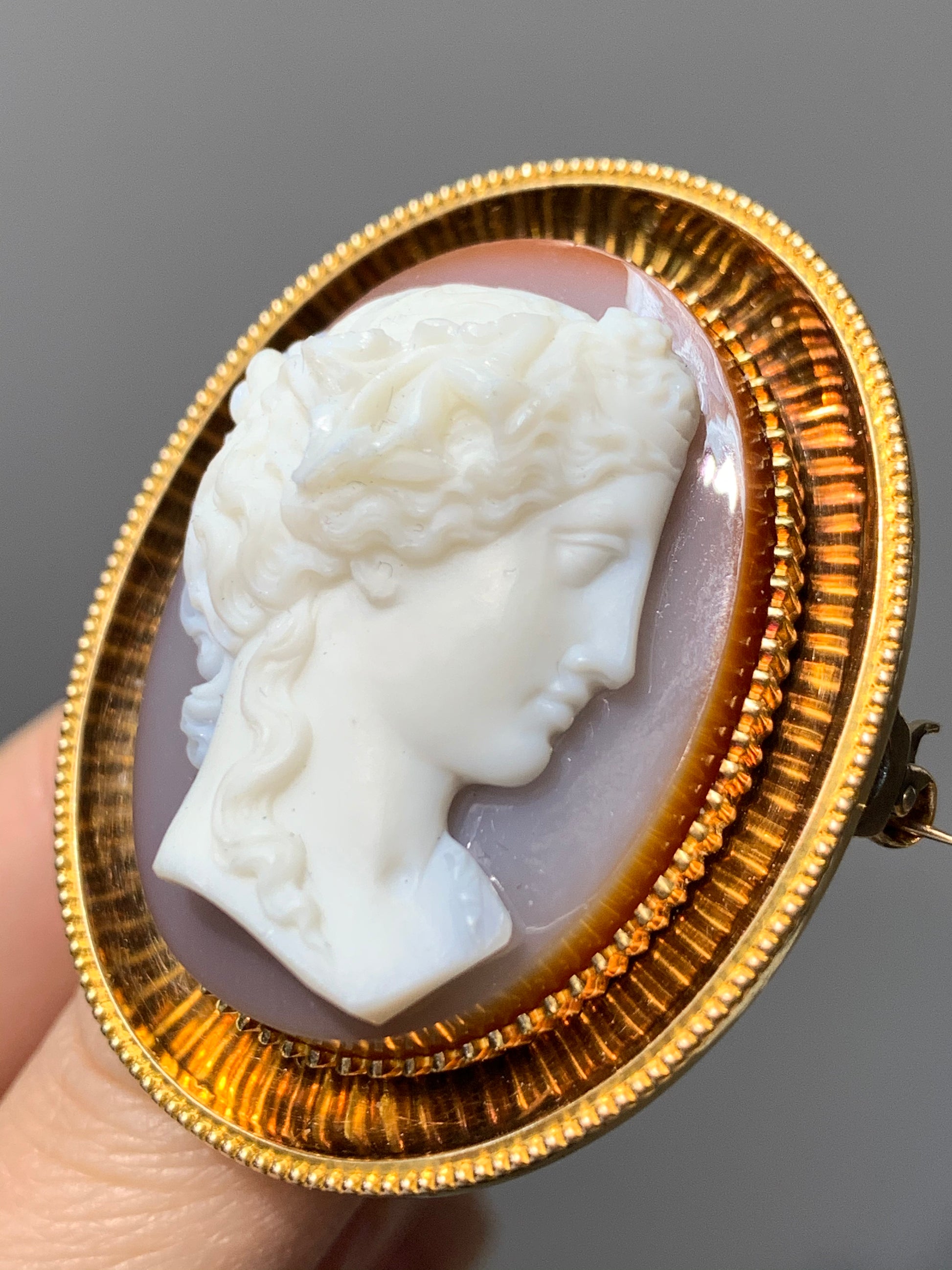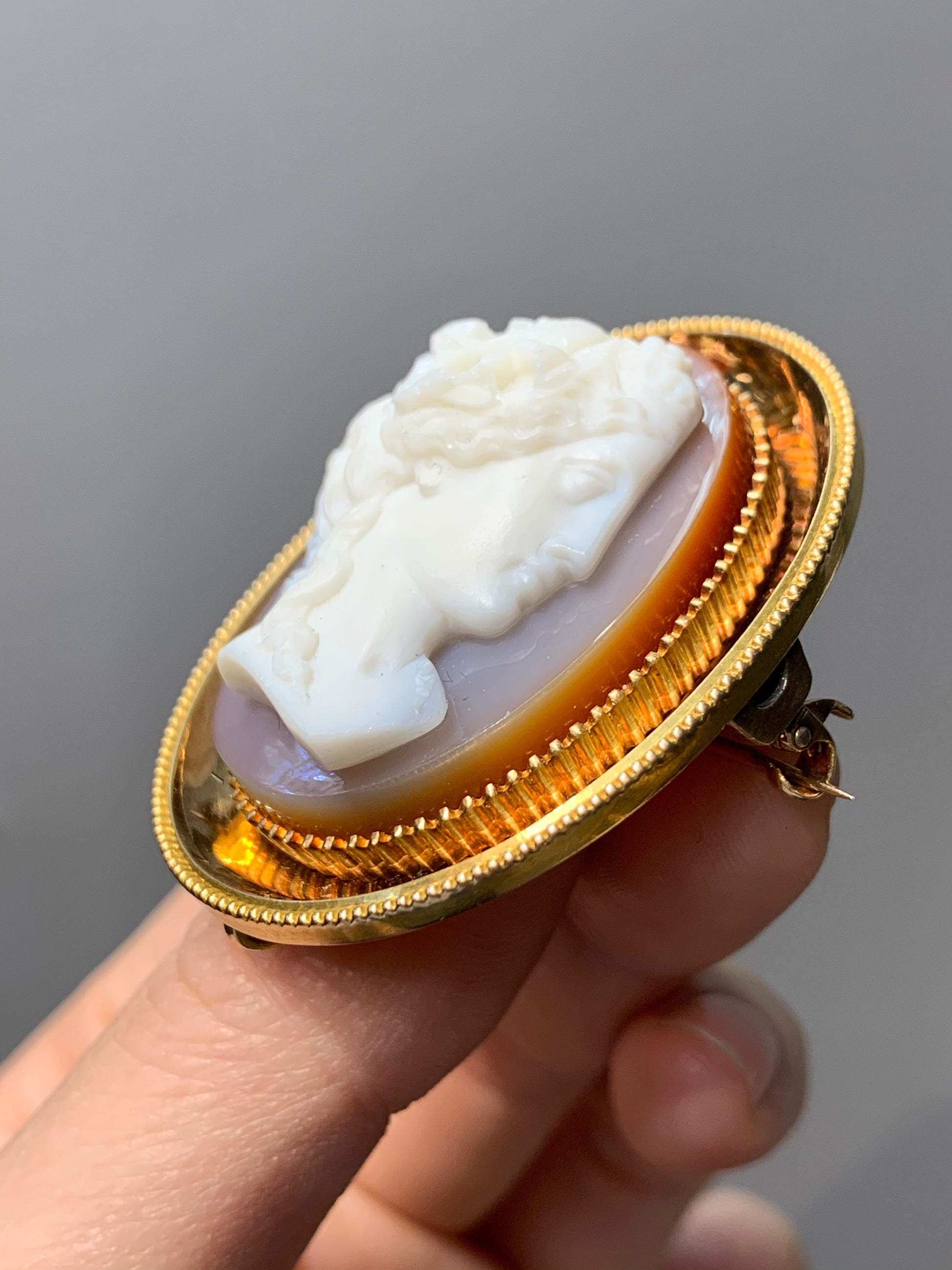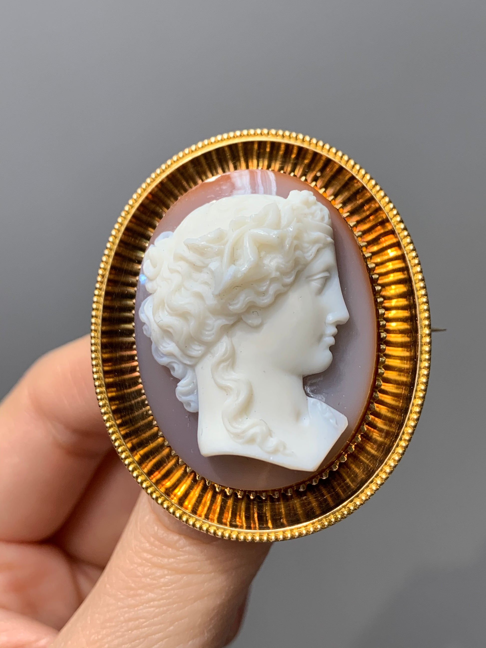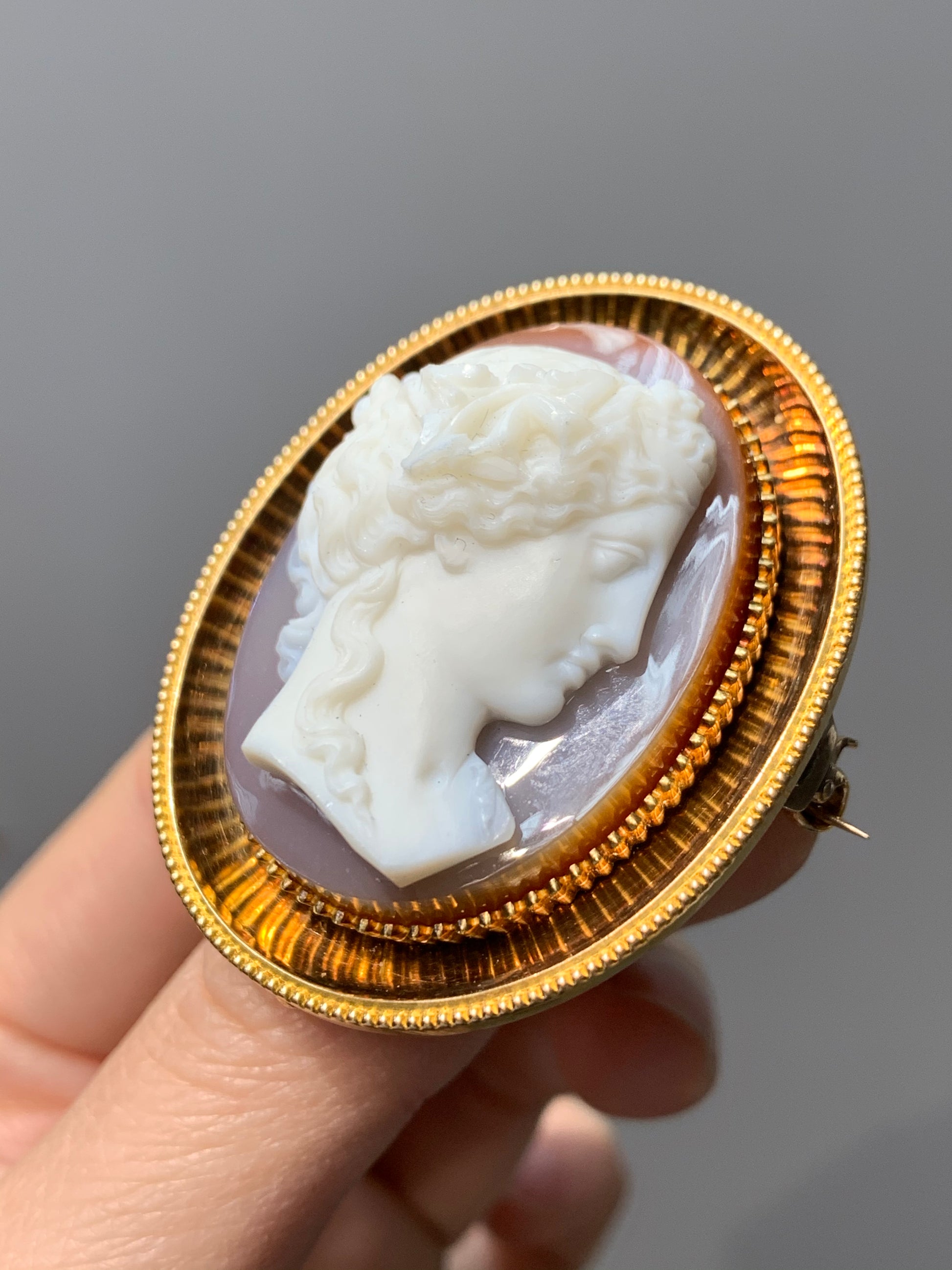 从侧面看这件作品,感觉就像透过一座镜子屋。这枚胸针采用 14K 黄金制成,镜面凹面可反射雕刻的内镶齿。浮雕描绘了一位女士的详细侧面。