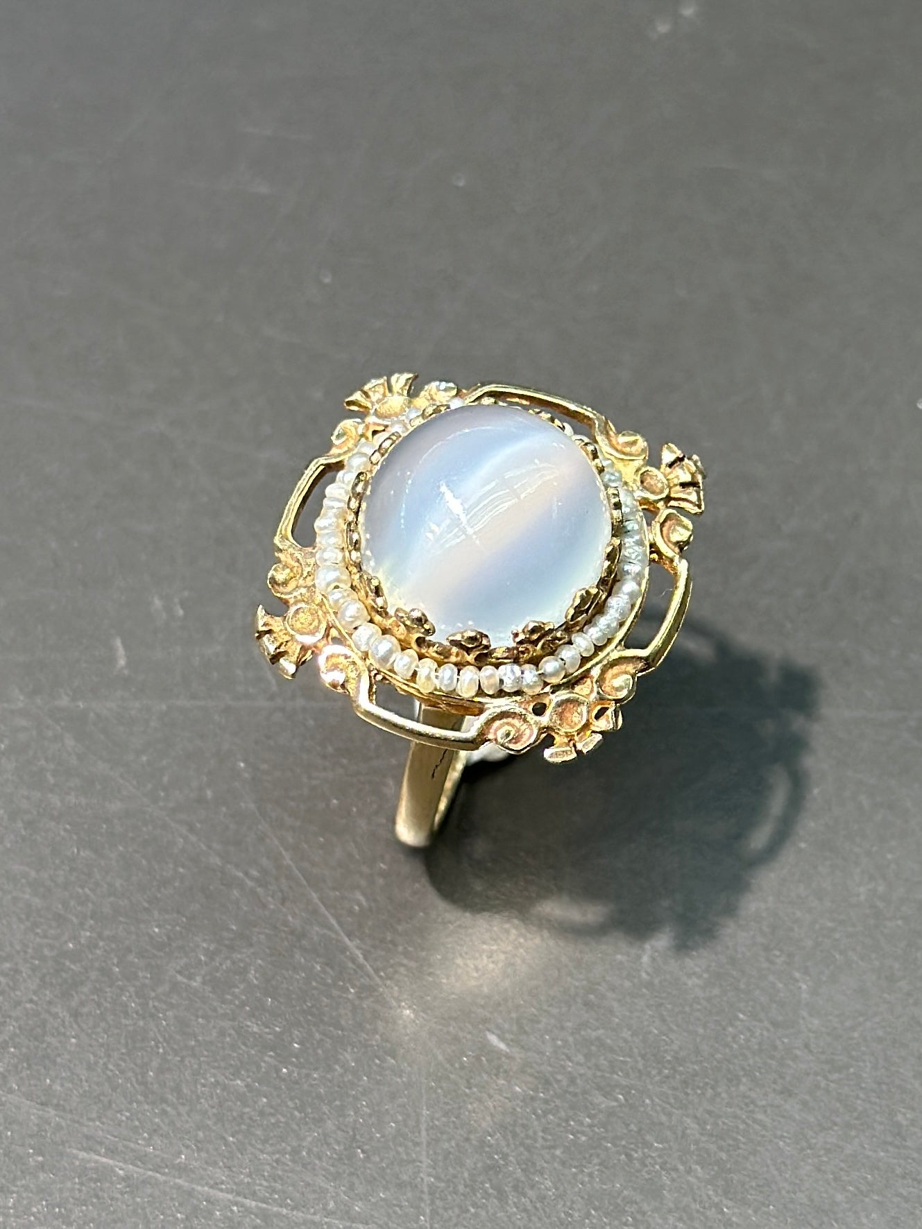 梦幻迷人的猫眼月光石凸圆形宝石,底色为白色,反光为淡蓝色。整体饰有图案细节,周围环绕着一圈细小的珍珠。