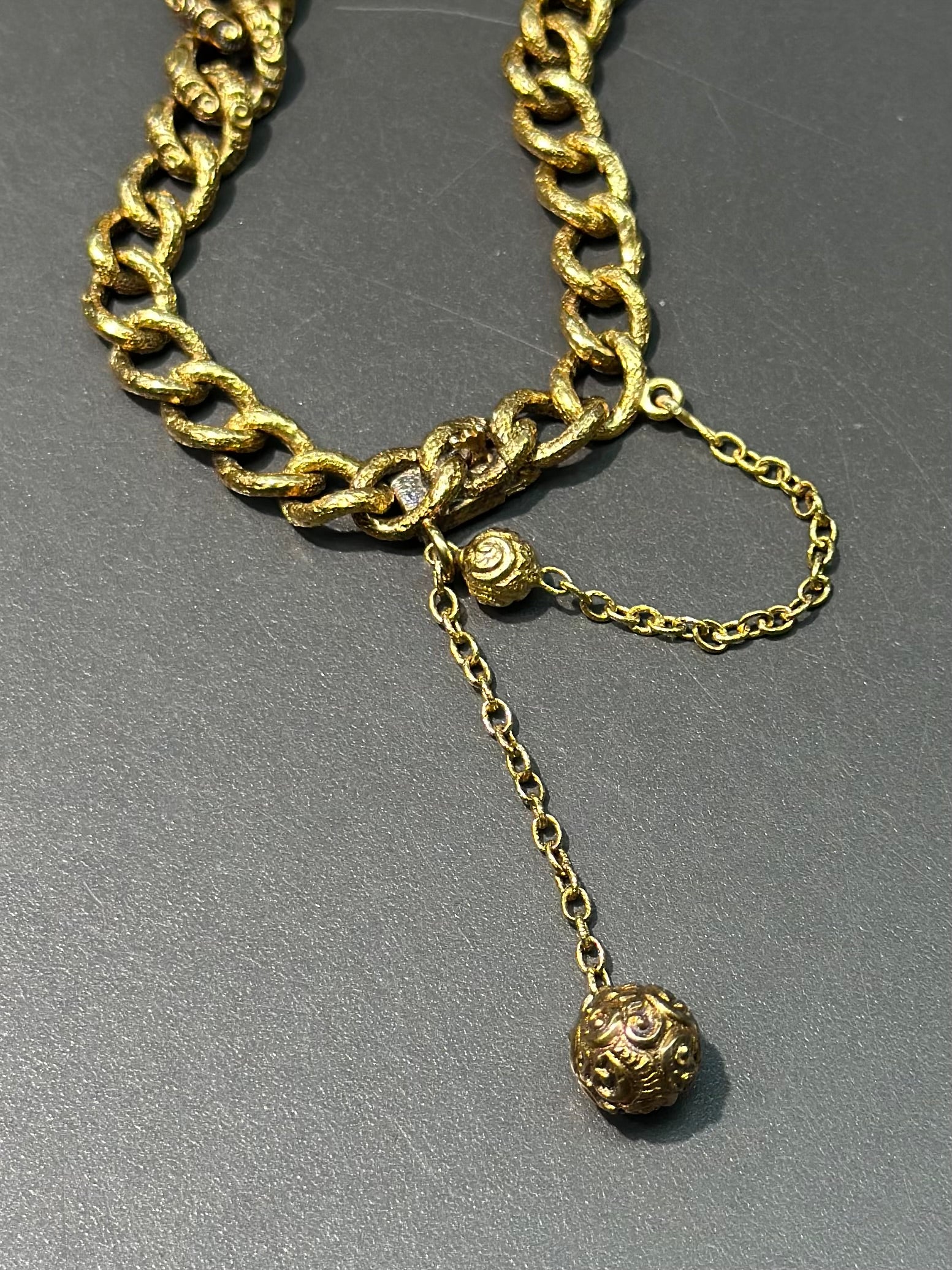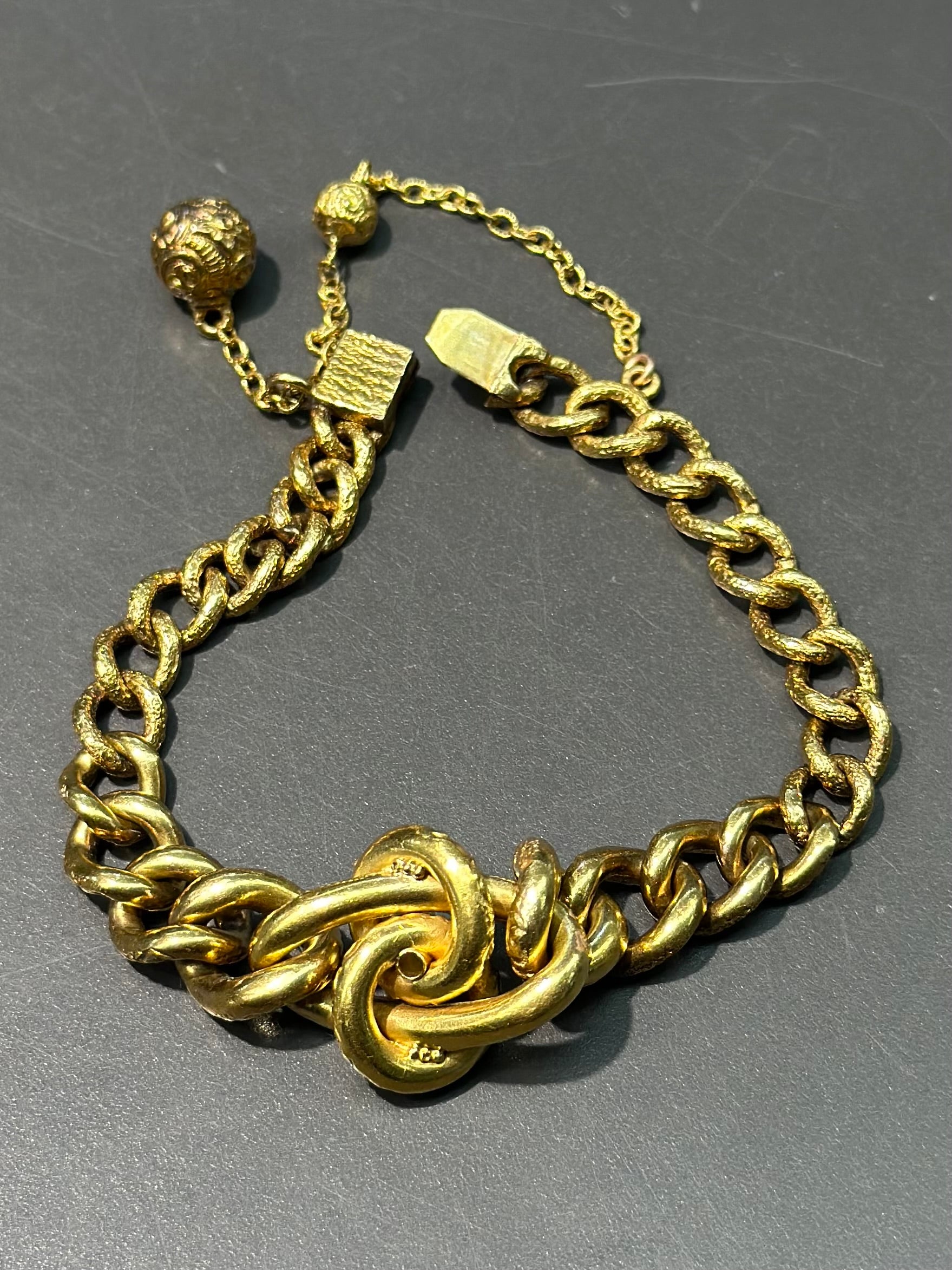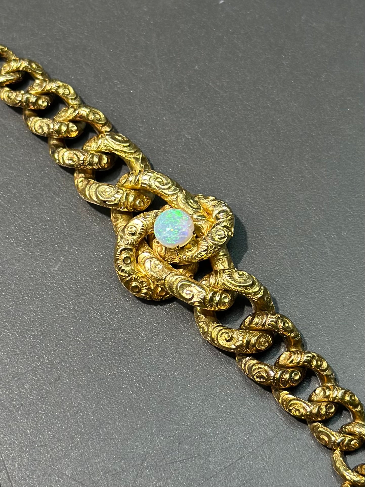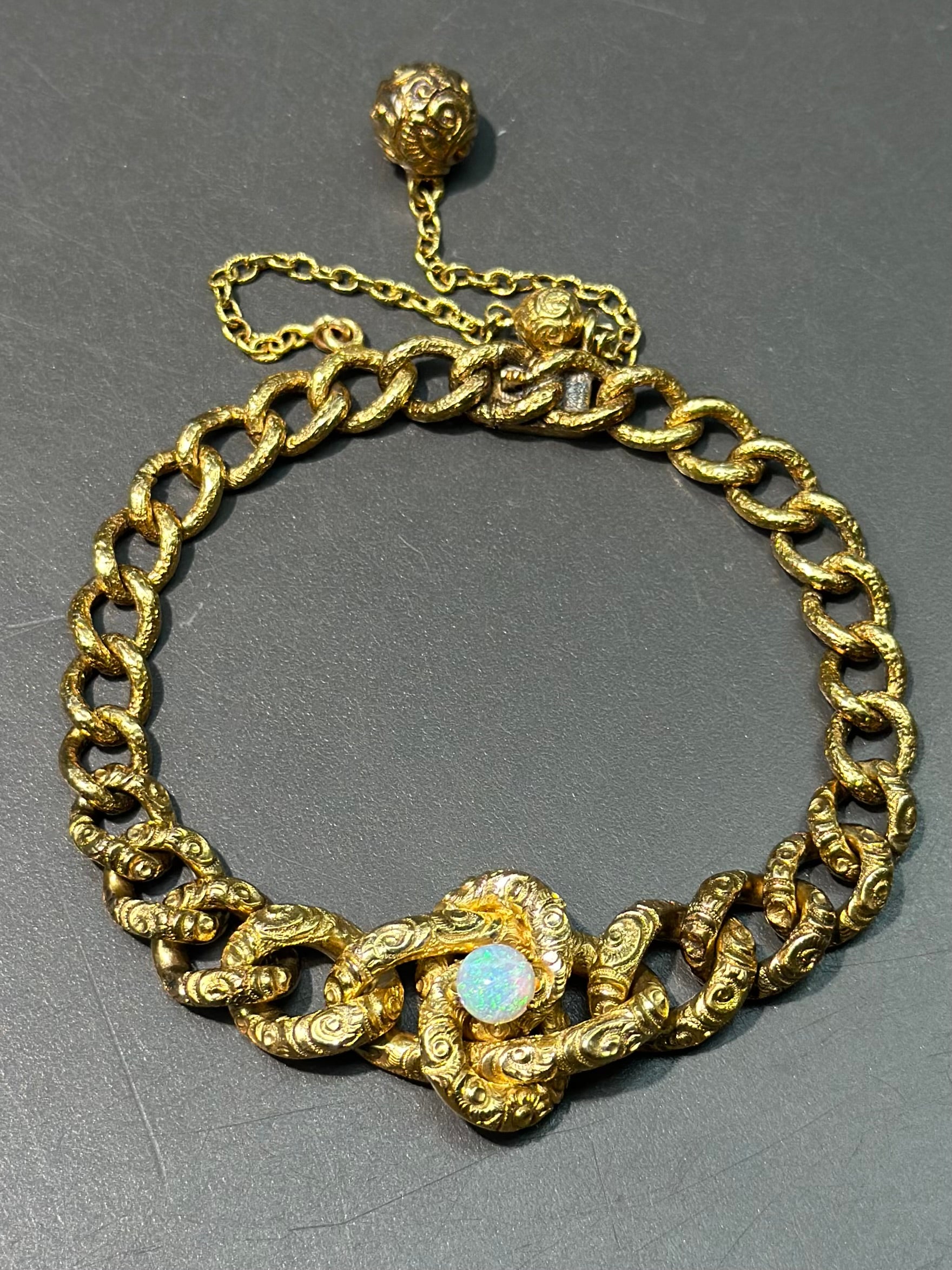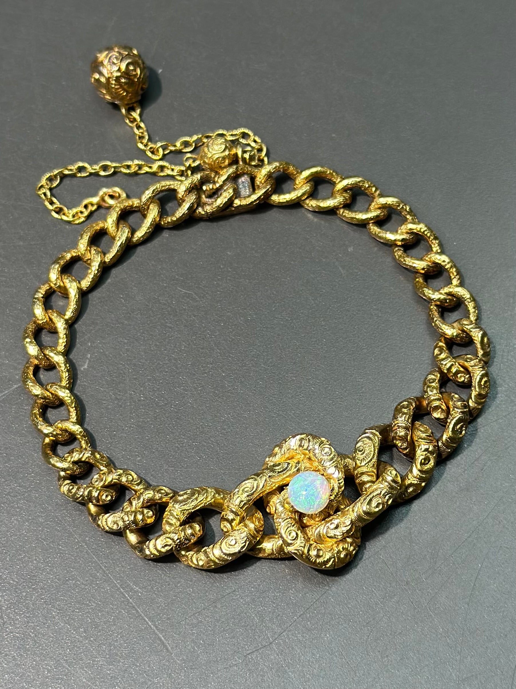 大约 1890 年代,一款绝对令人惊艳的维多利亚时代晚期爱情结手链,采用 14K 黄金精心打造,略带古铜色。这款美丽的手链上的链环简直就是一切!整个手链上装饰着精美绝伦的浮雕图案设计,并以最复杂的安全链收尾,上面悬挂着两颗金珠。手链中央是一颗闪闪发光的蛋白石凸圆形宝石,颜色绚丽夺目!长度为 7.0 英寸,可调整大小。