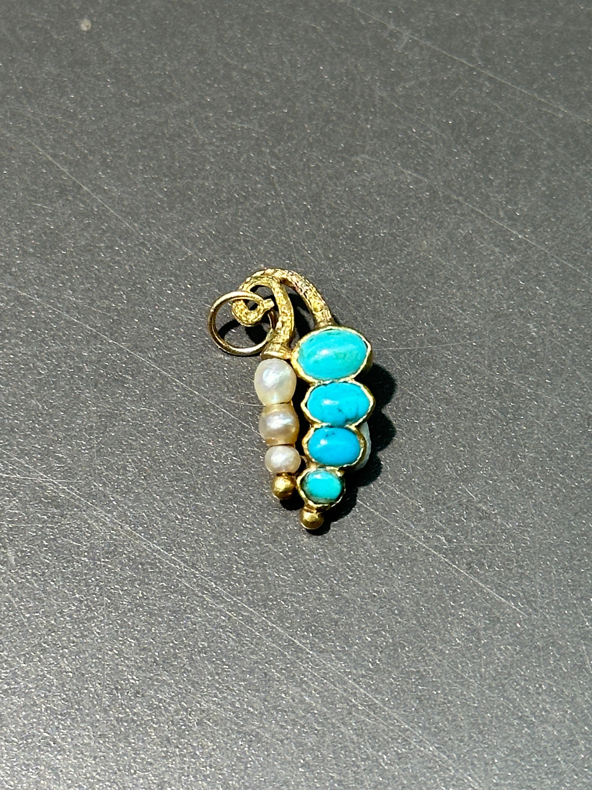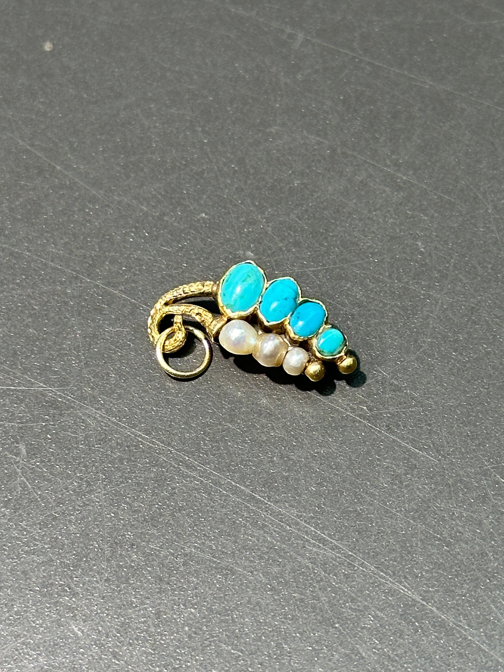 曾经是别针,现在成了饰品!这款可爱又奇特的蝴蝶饰品采用 14K 金打造,镶嵌有知更鸟蛋蓝色凸圆形绿松石和光泽的灰色珍珠。