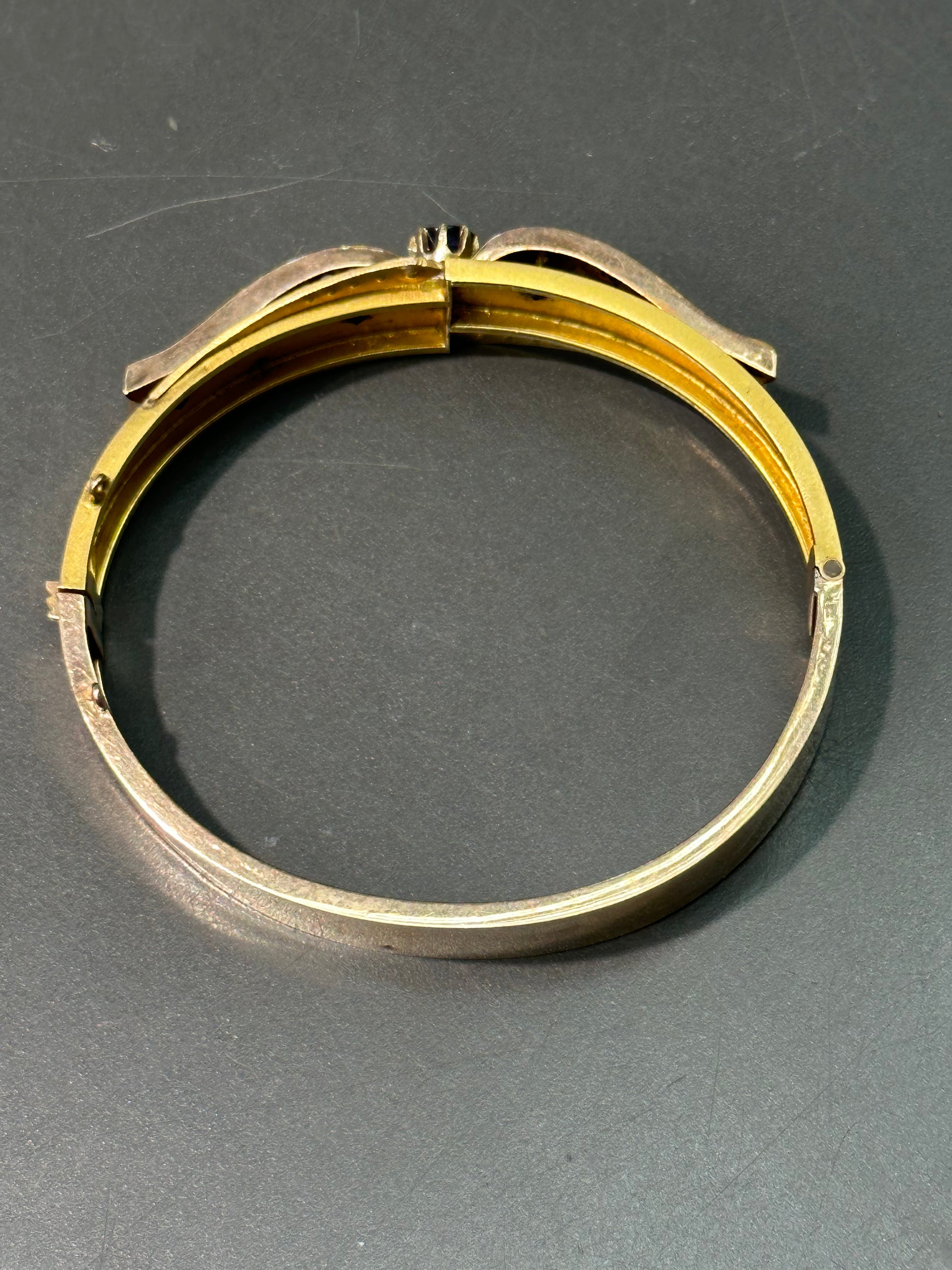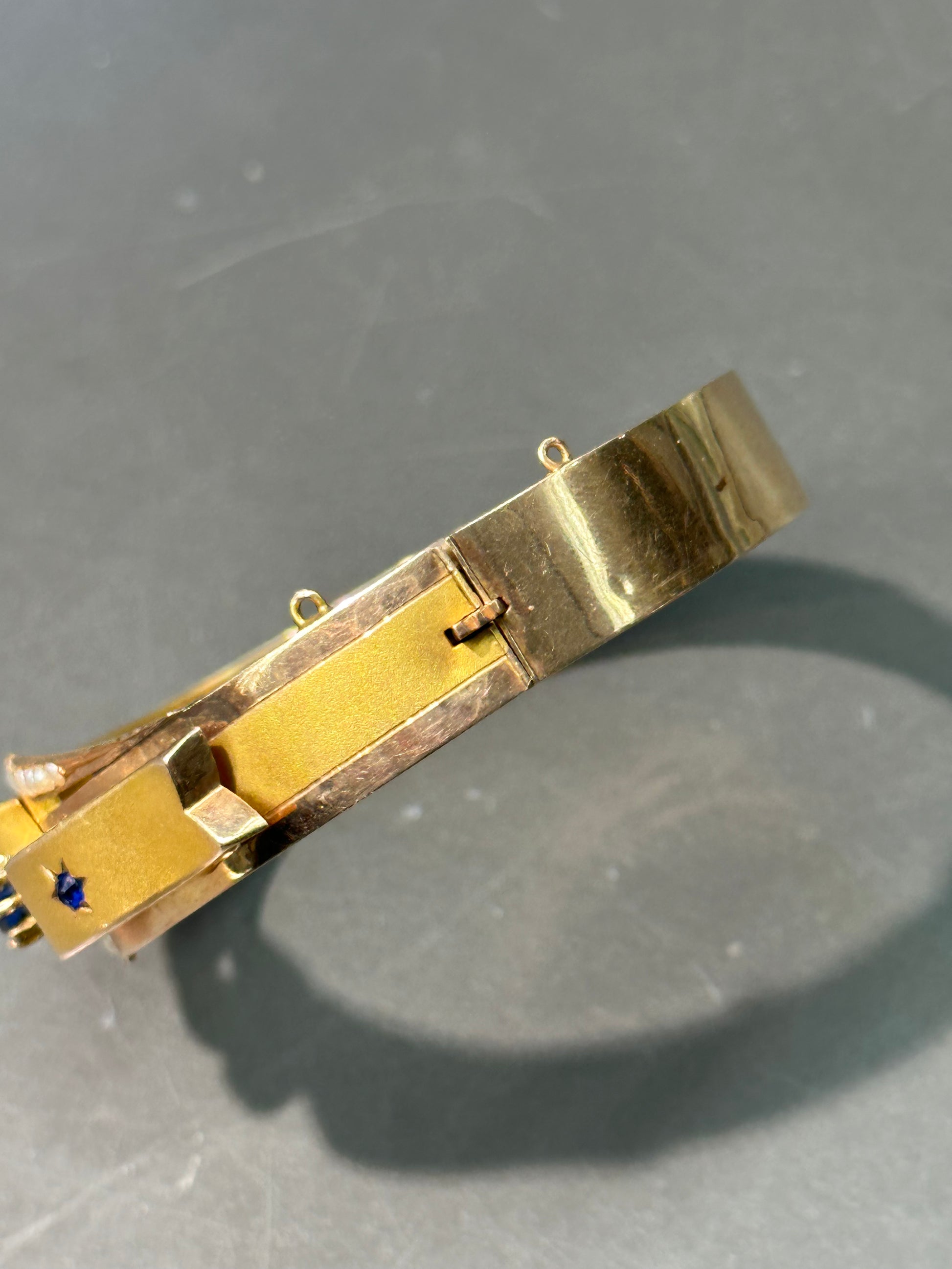 这款维多利亚时代的手链为您的手腕增添永恒的气息。采用 14K 黄金制成,有两种不同的黄金饰面。镶嵌着排列成复杂星形图案的皇家蓝宝石和小珍珠。这款精美的作品散发着独特的光彩,一定会吸引所有人的目光。