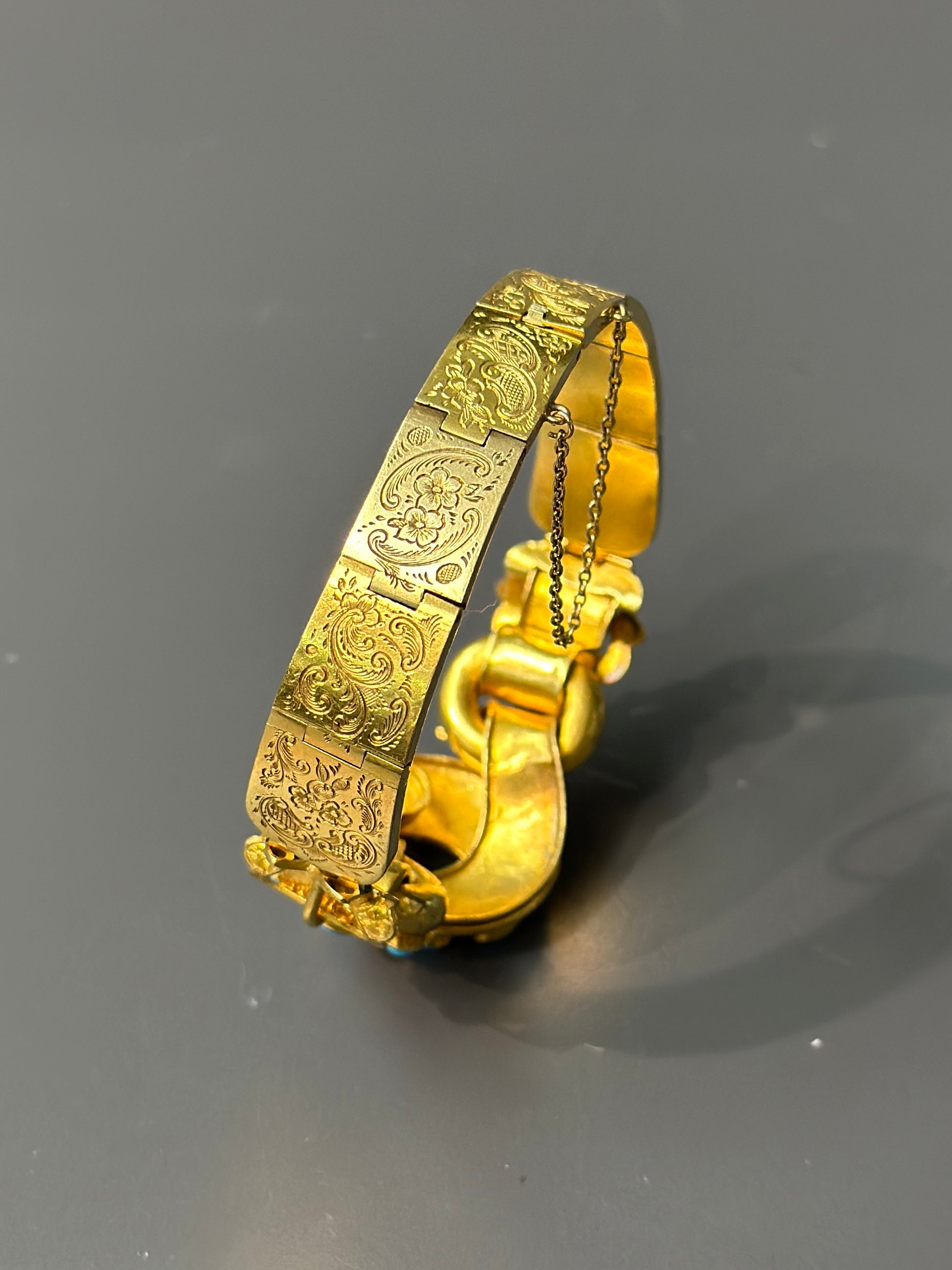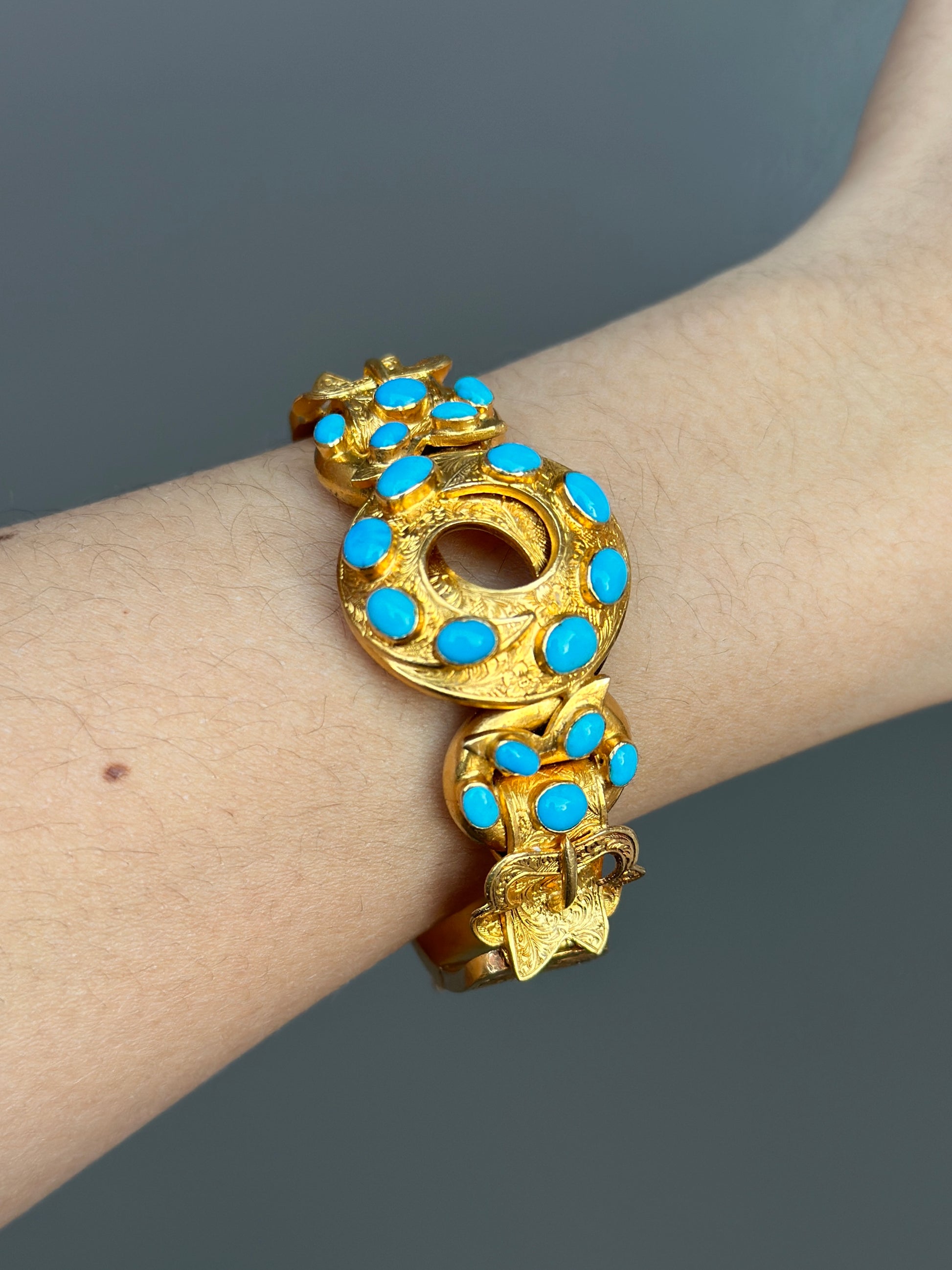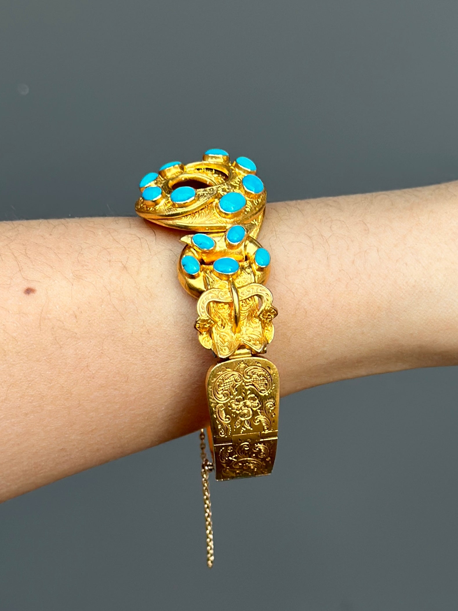 可追溯至维多利亚时代,双扣手链上点缀着鲜艳的知更鸟蛋蓝绿松石。采用 14K 金精心打造,手链链节上饰有复杂的花卉图案细节。