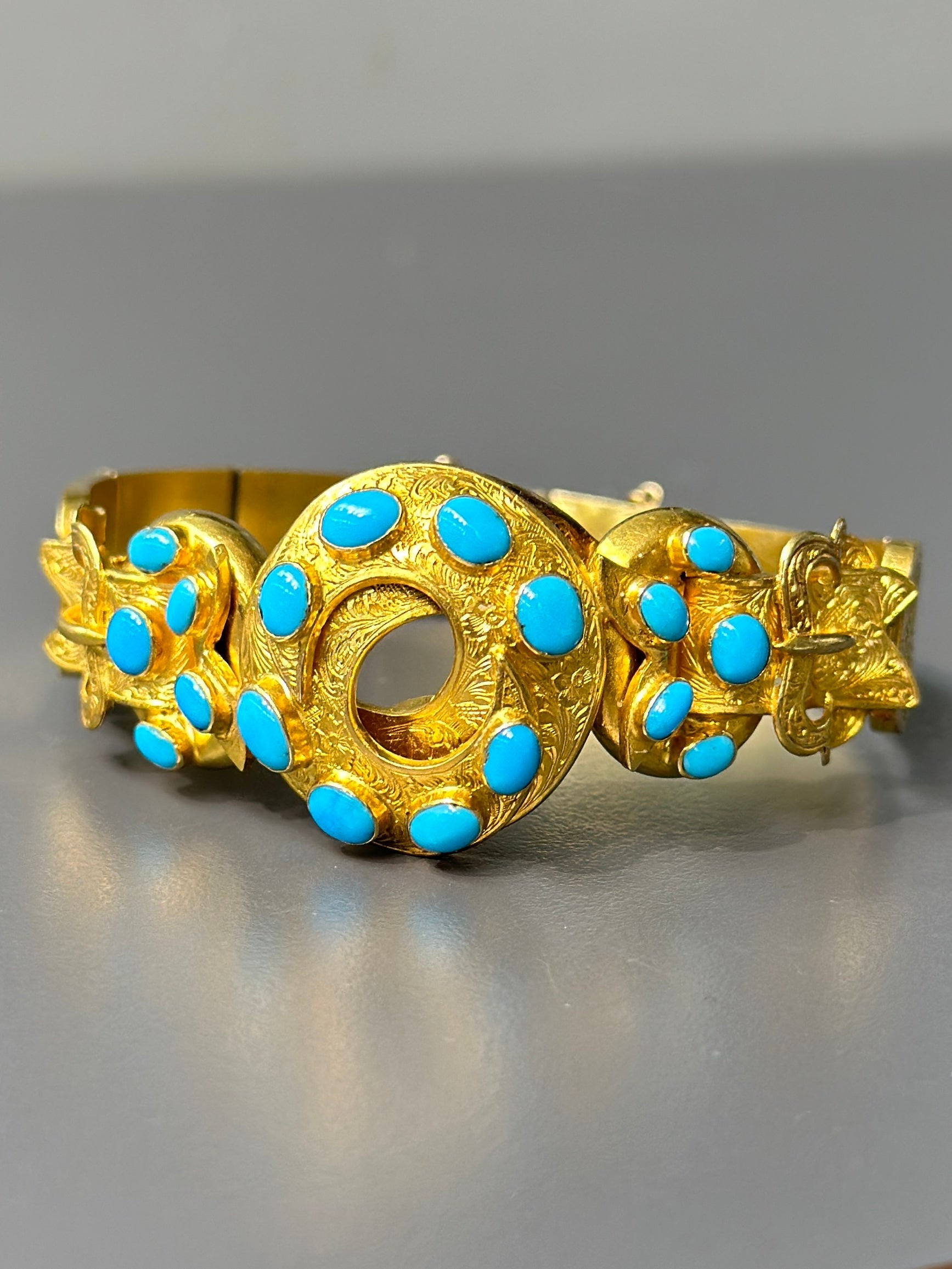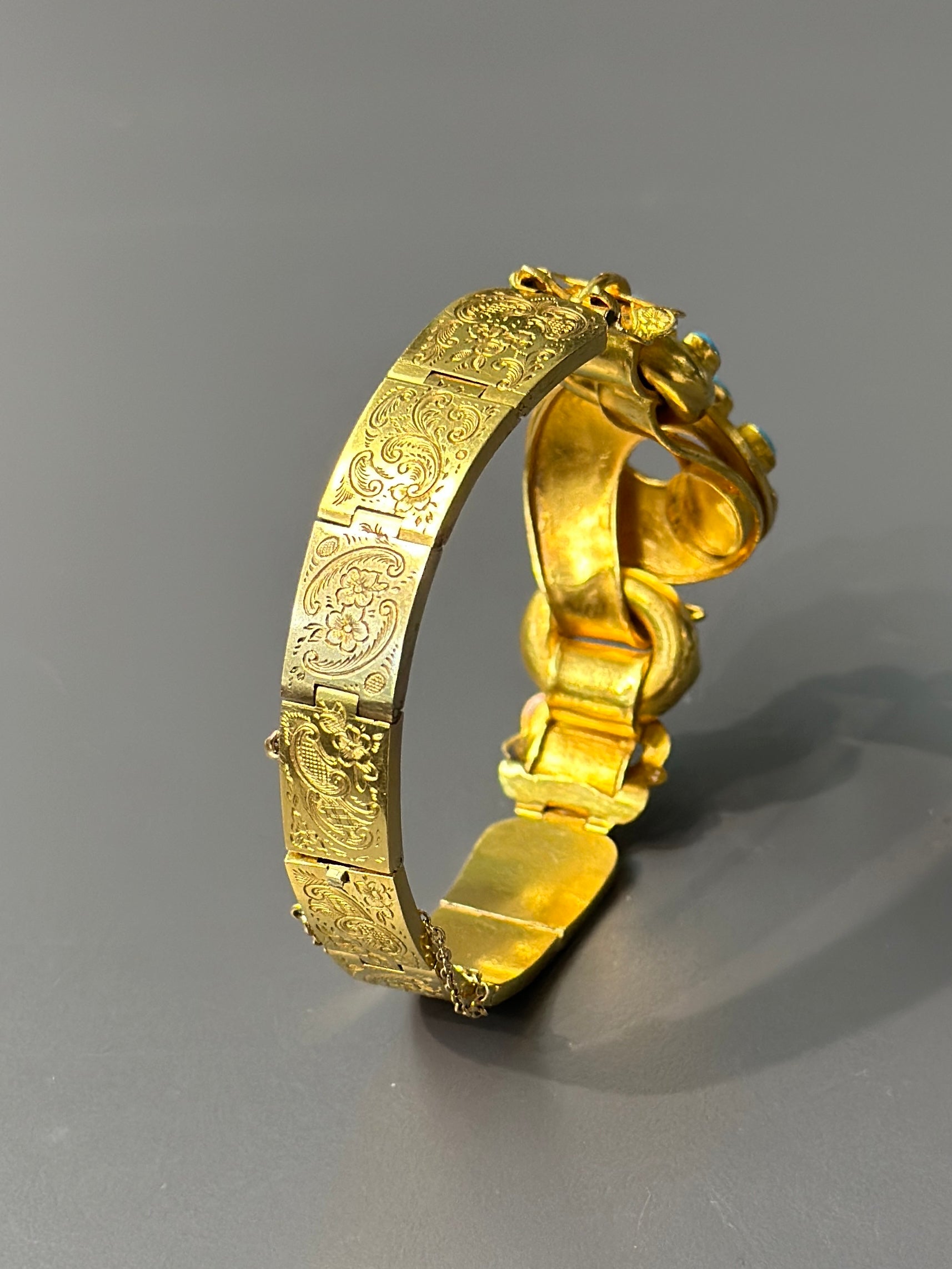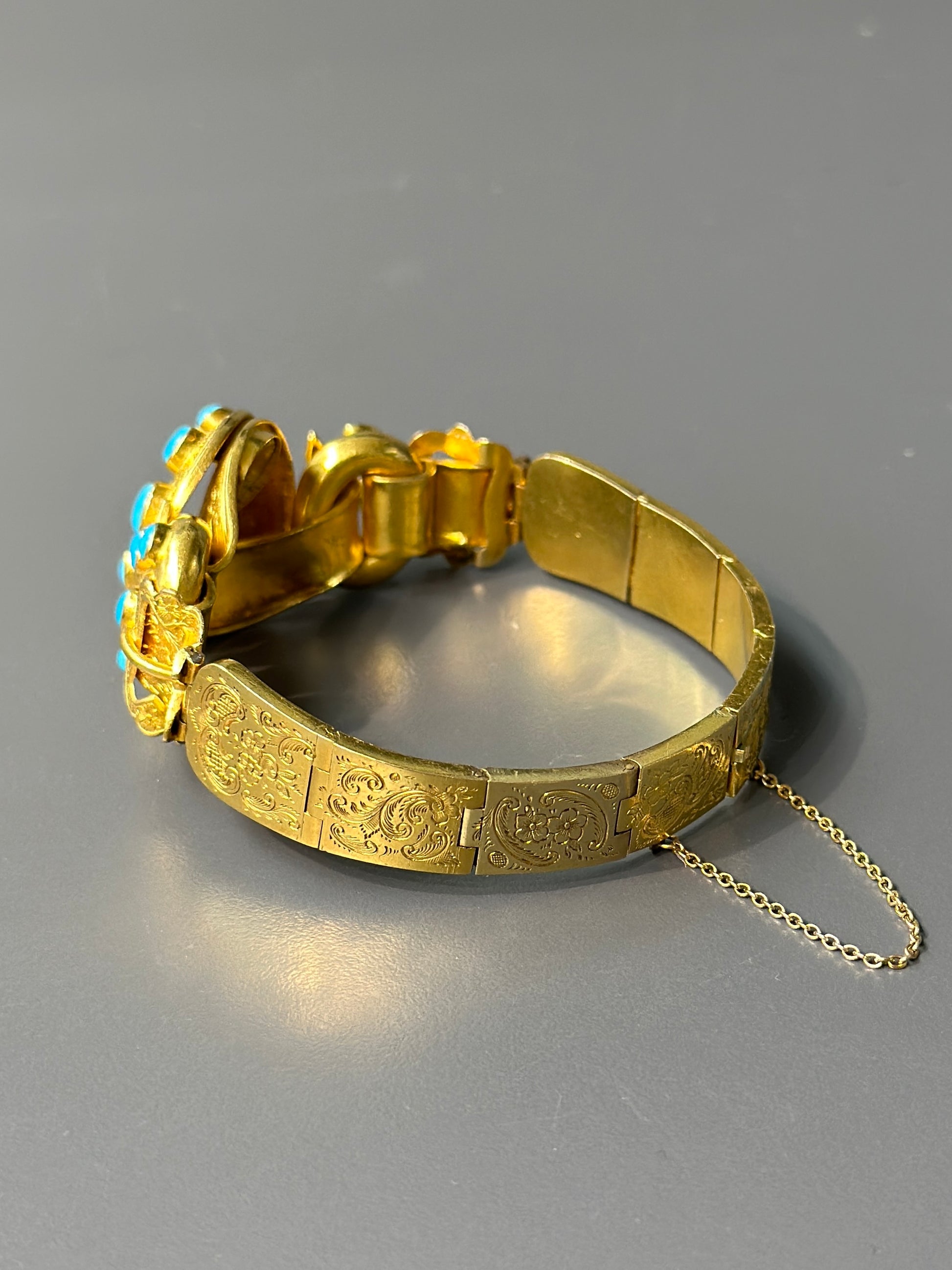 可追溯至维多利亚时代,双扣手链上点缀着鲜艳的知更鸟蛋蓝绿松石。采用 14K 金精心打造,手链链节上饰有复杂的花卉图案细节。