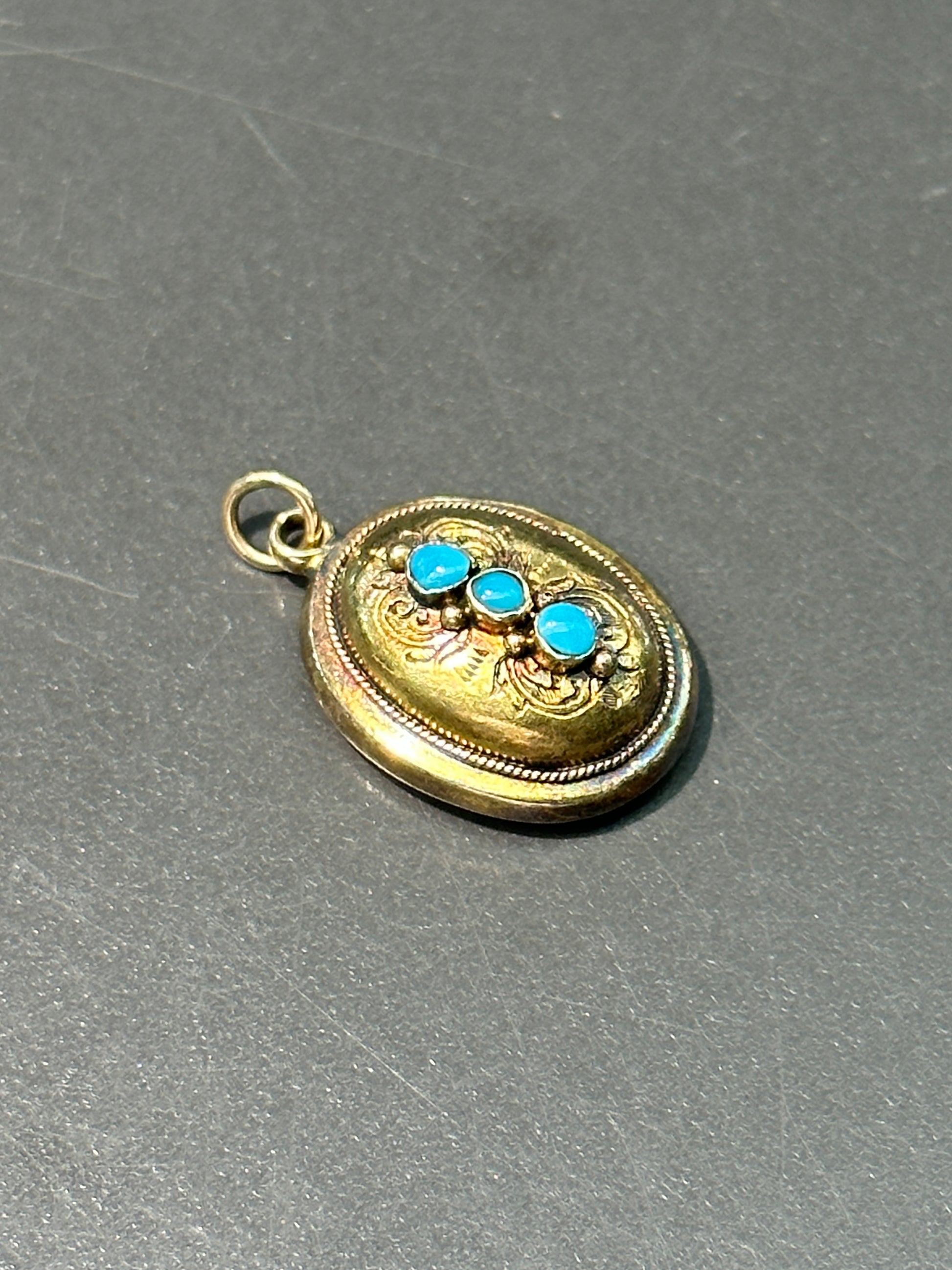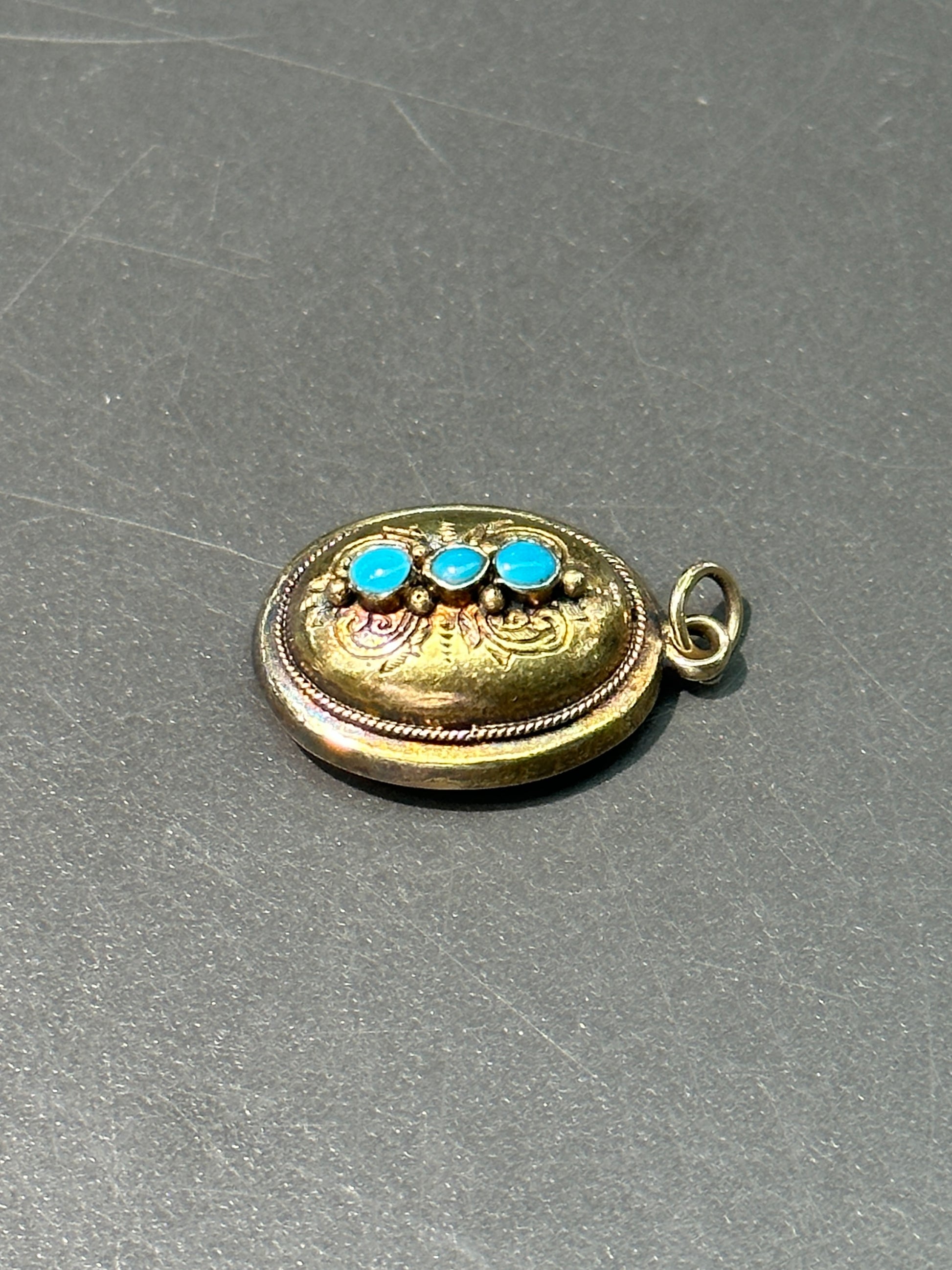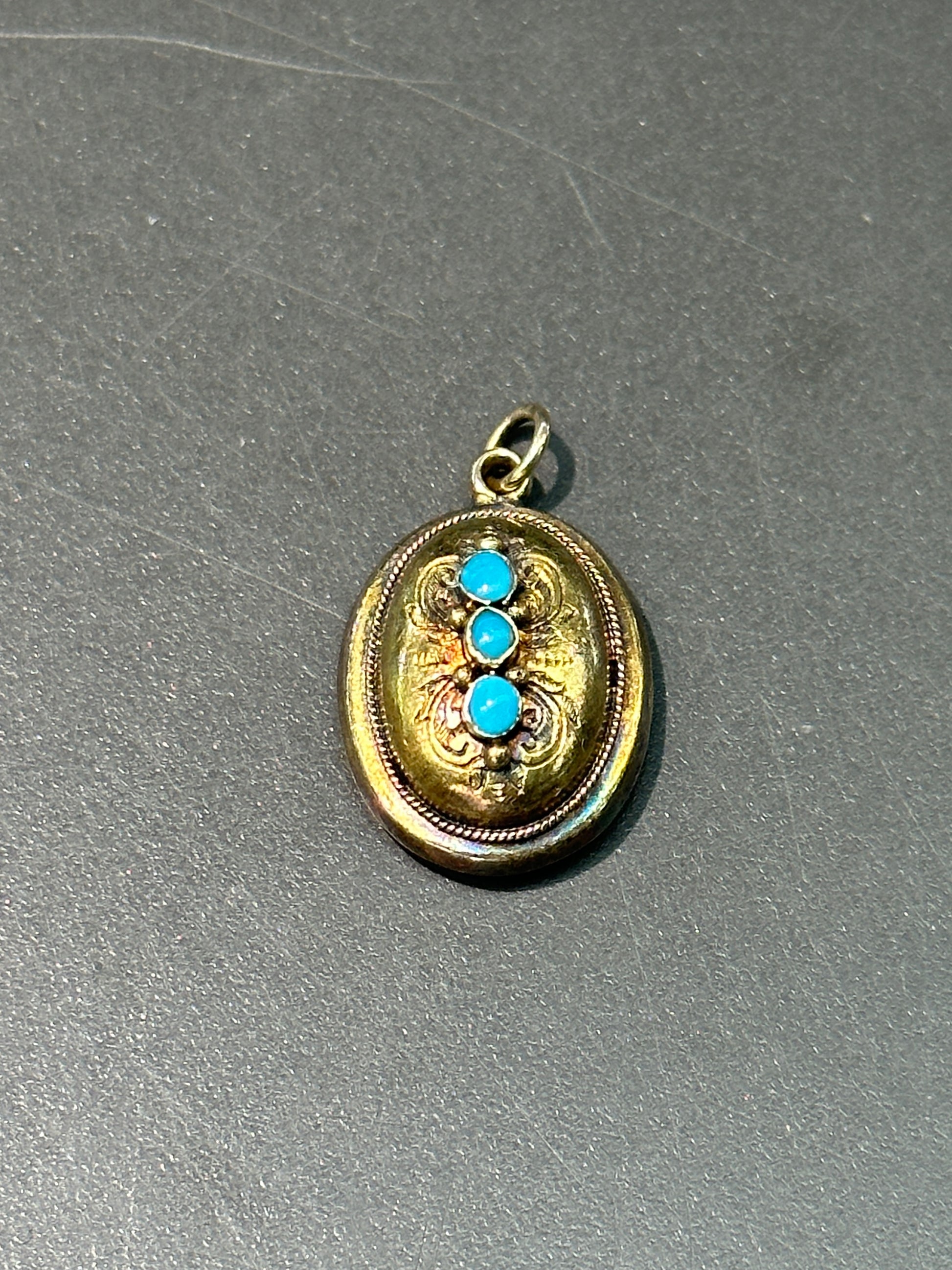 可追溯至维多利亚时代,精美的晨间吊坠,带有卷轴图案设计。饰有三颗鲜艳的蓝绿松石。