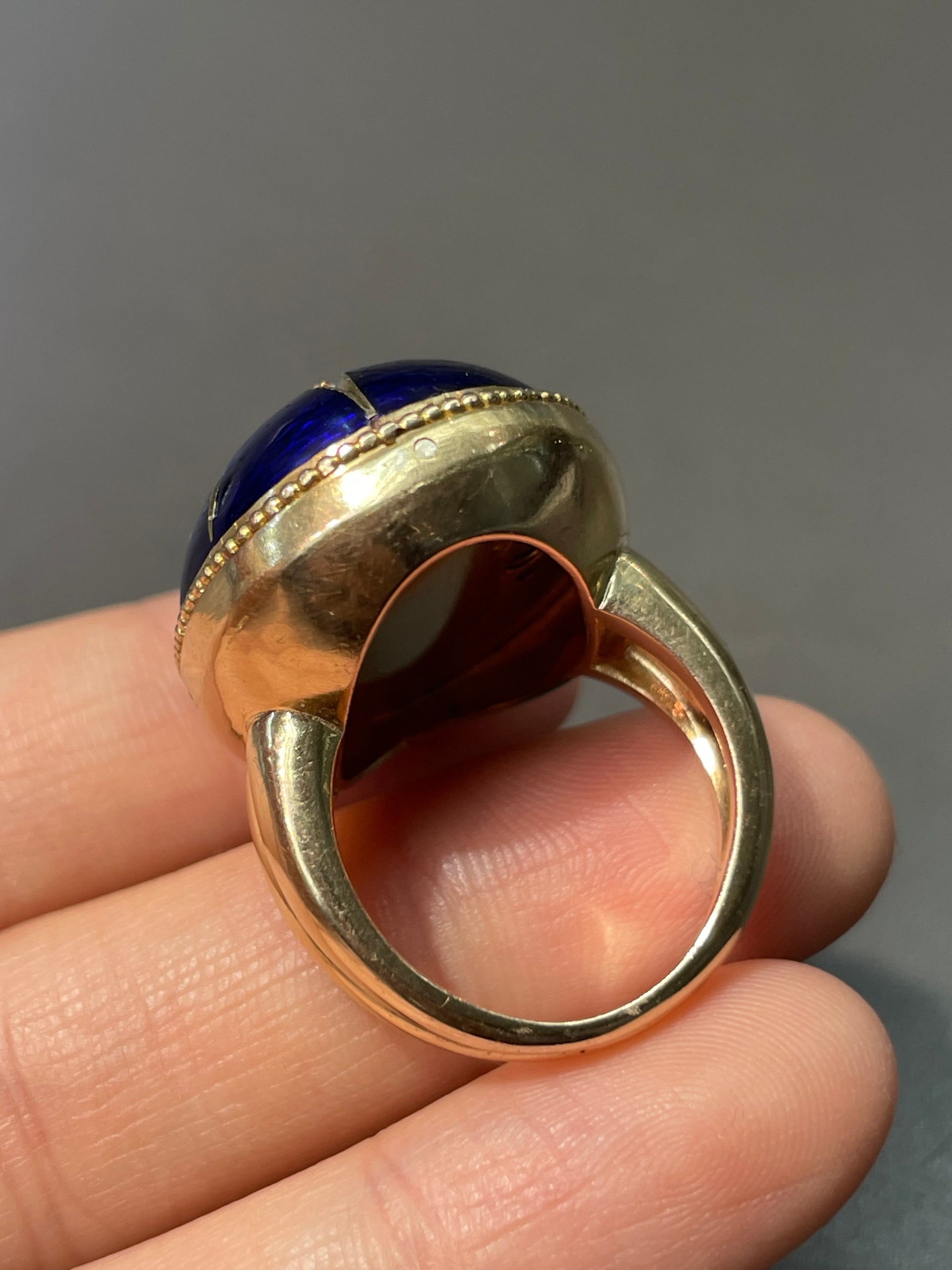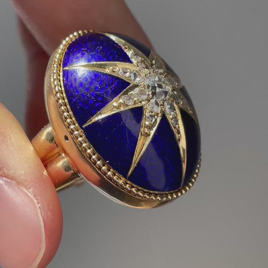 这枚 14K 黄金戒指是真正的维多利亚晚期珍品,迷人的蓝色扭索纹珐琅背景,由精致的圆点珠饰边框环绕。戒指中央是一颗总重 0.95 克拉(VS-SI 净度,HI 颜色)的老矿切割钻石,散发着古老的光芒!这是一件令人惊叹的作品,随时准备在您的收藏中大放异彩!