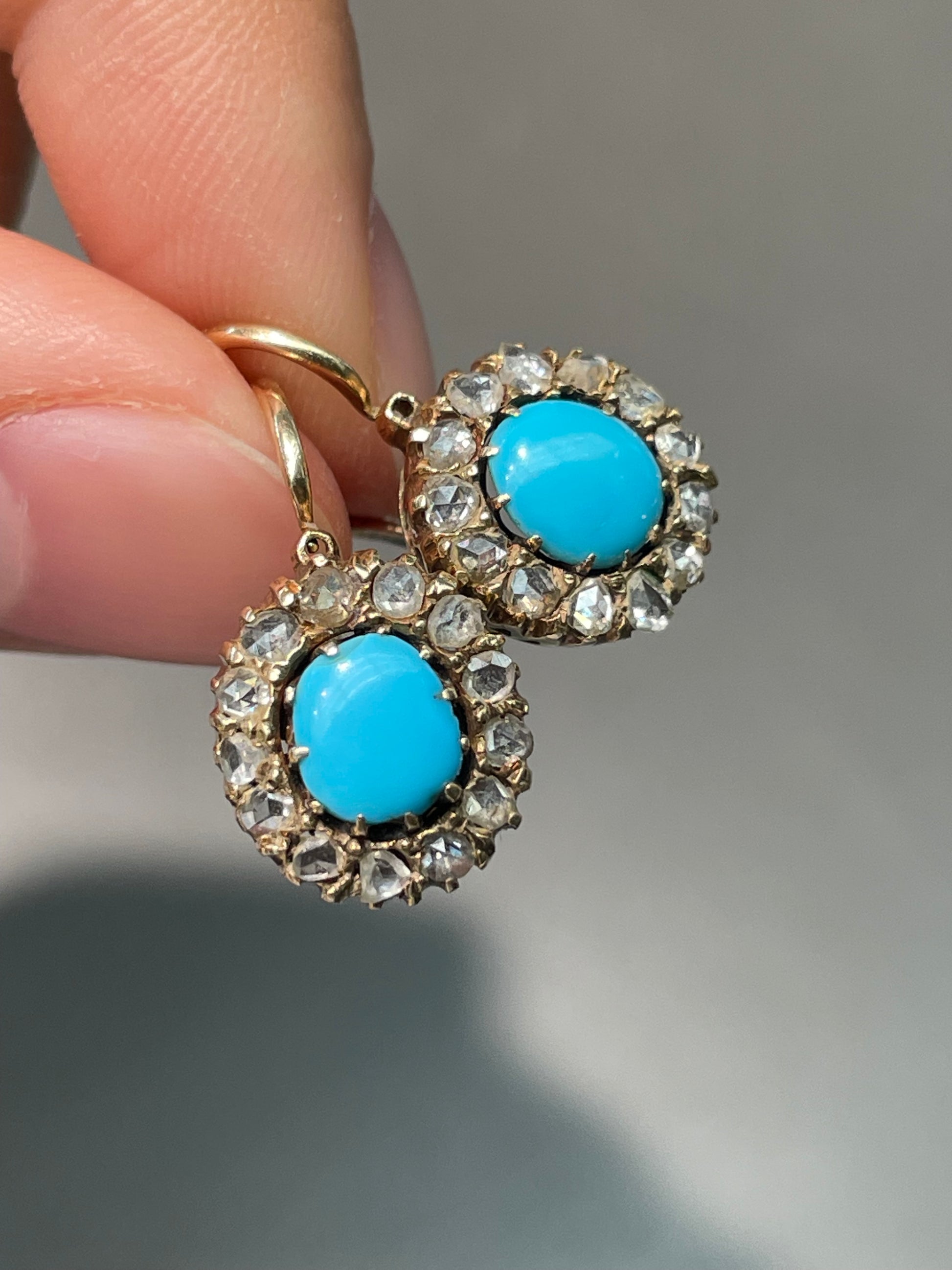 A delightful pair of Victorian 14K gold turquoise and diamond halo earring centered with a robin-egg blue Persian turquoise surrounded by a halo of twinkling chunky rose cut diamonds totaling 0.91 carats (SI clarity, I-J color). Perfect for adding a vibrant pop of color to any outfit!