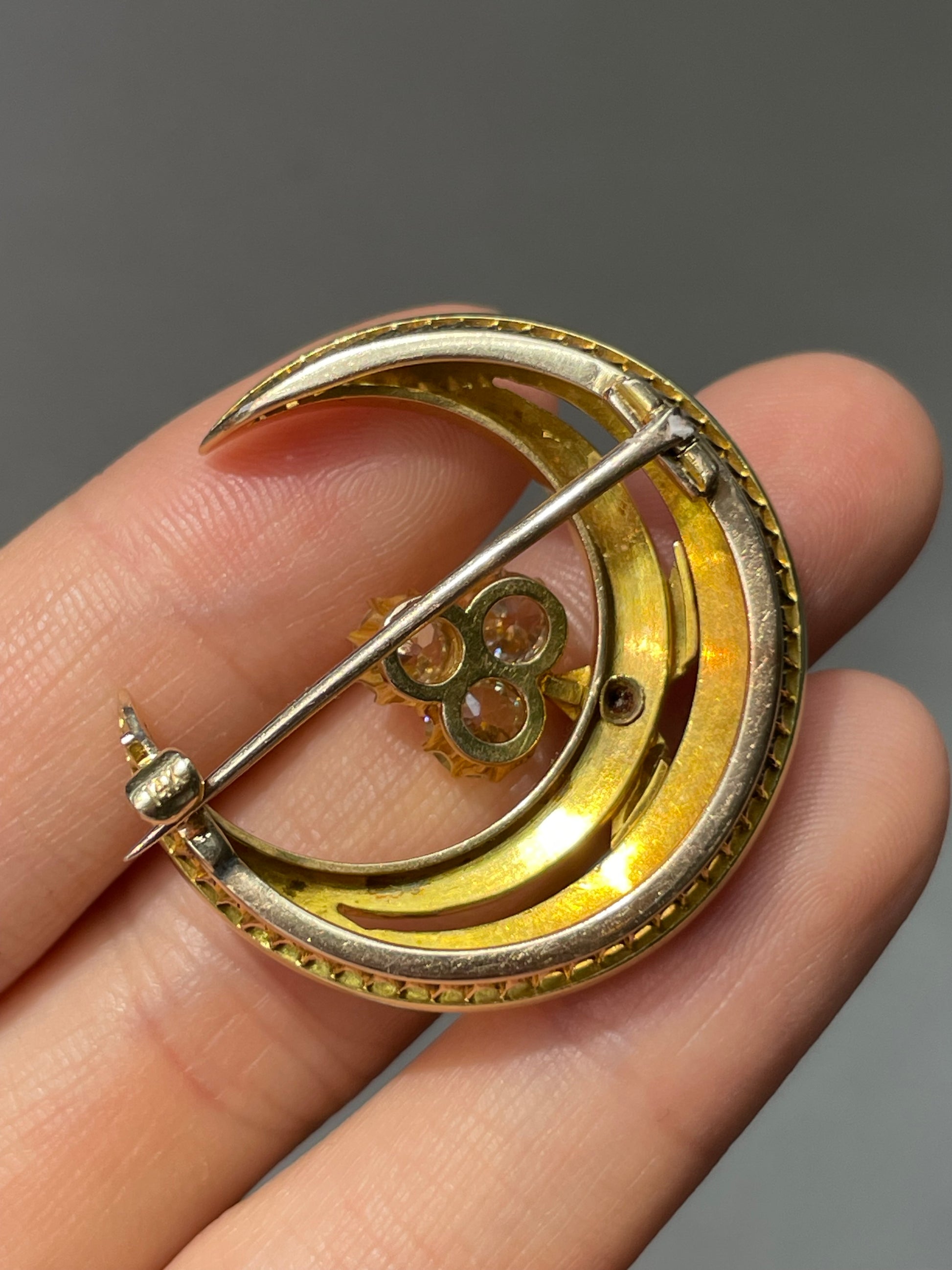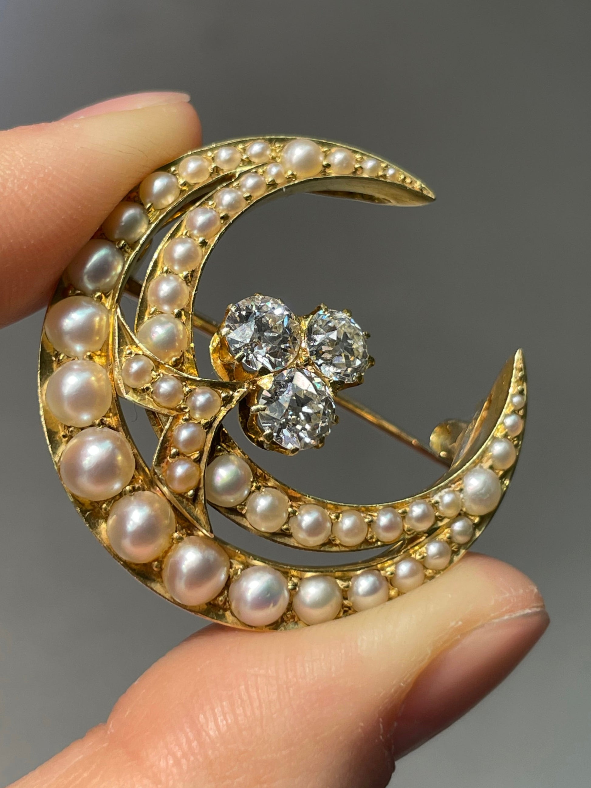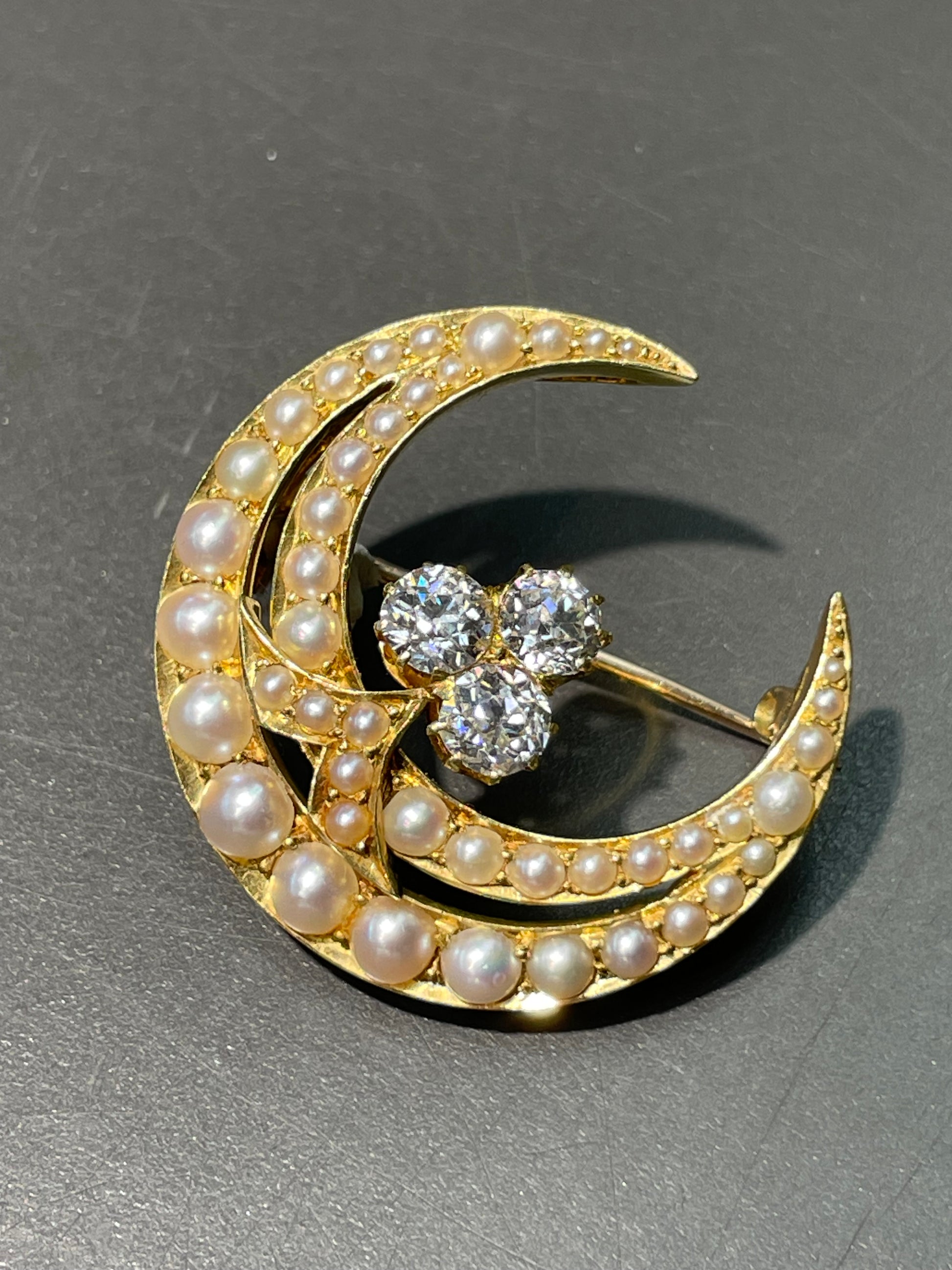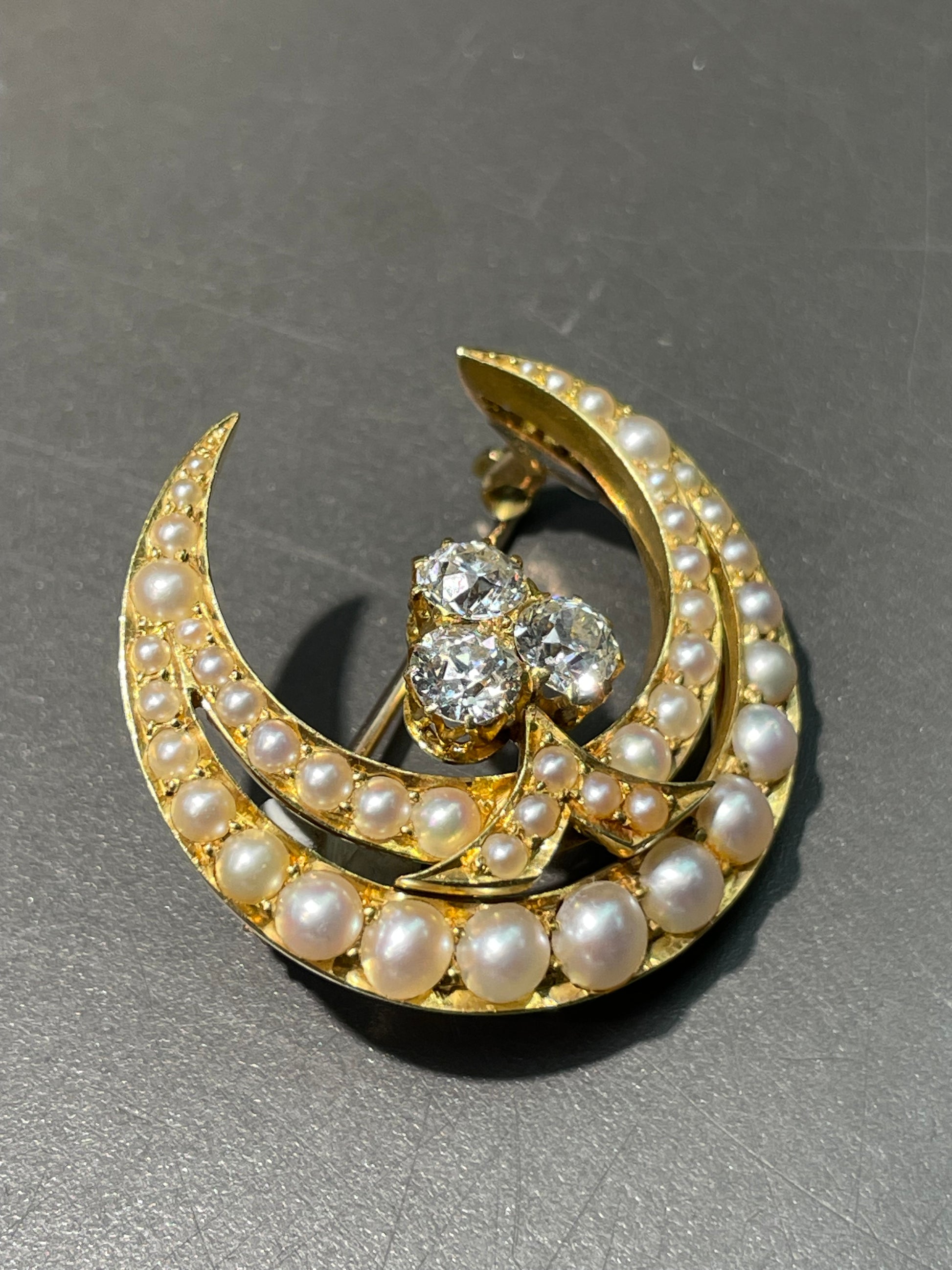 这款维多利亚风格的 18K 黄金新月形胸针采用天体设计,中央镶嵌三颗明亮活泼的老矿切割钻石,总重 1.65 克拉,周围逐渐镶嵌有光泽的白色天然珍珠,呈新月形。胸针采用 18K 黄金打造,背面配有 14K 黄金别针。可根据要求转换为吊坠。